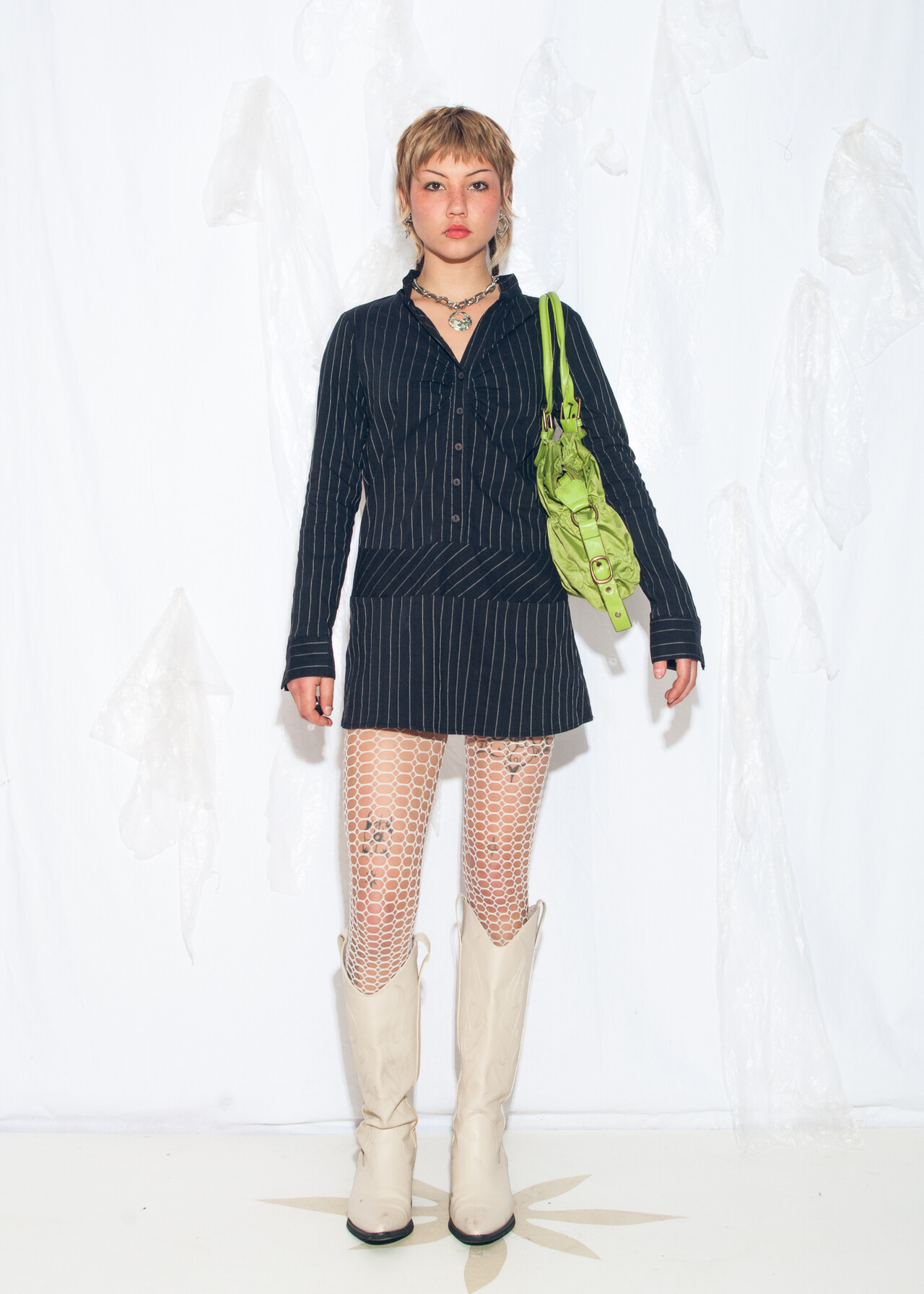 Tags: 2000s style clothing, micro skirt, office siren, pinstriped dress, y2k vintage fashion