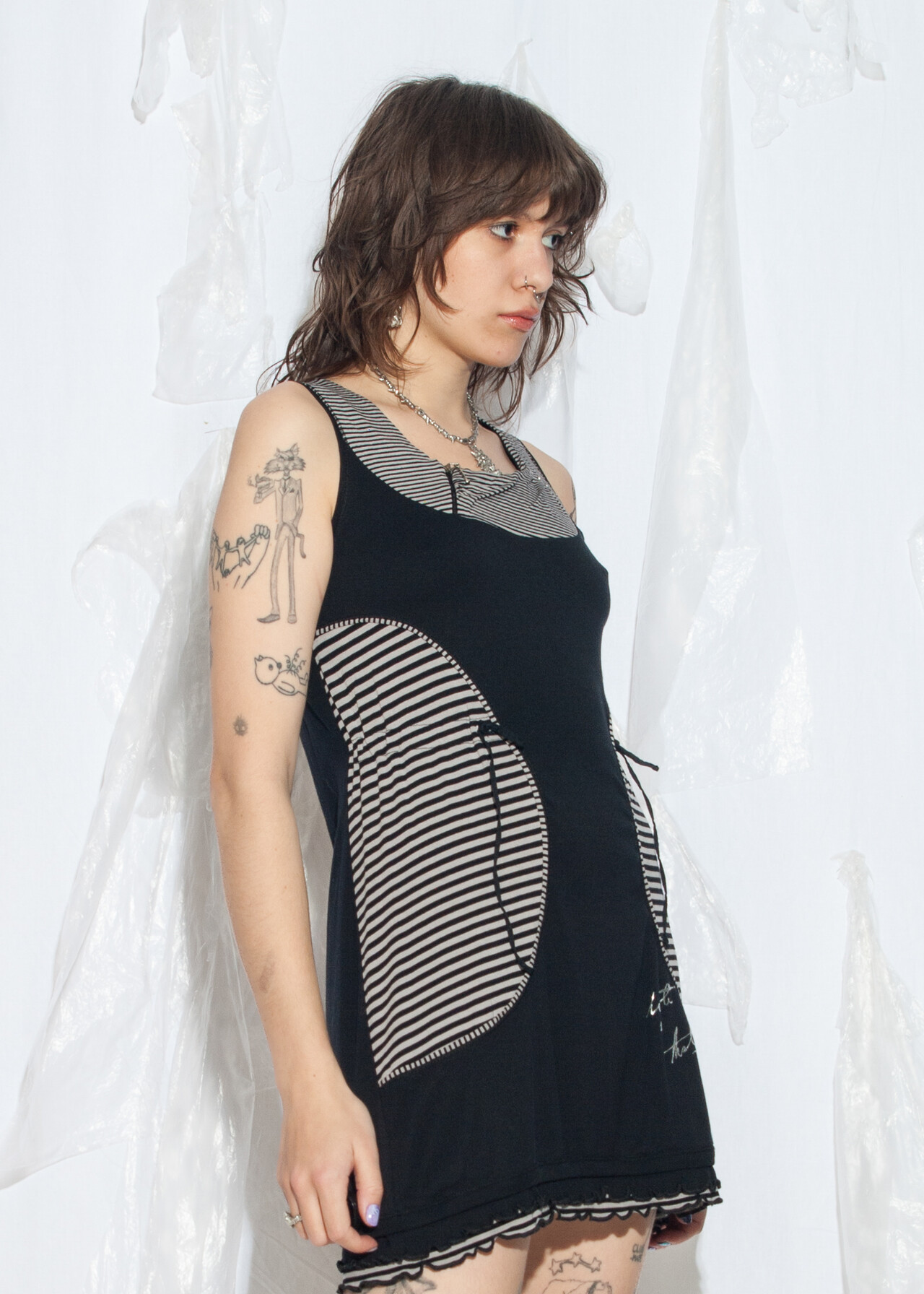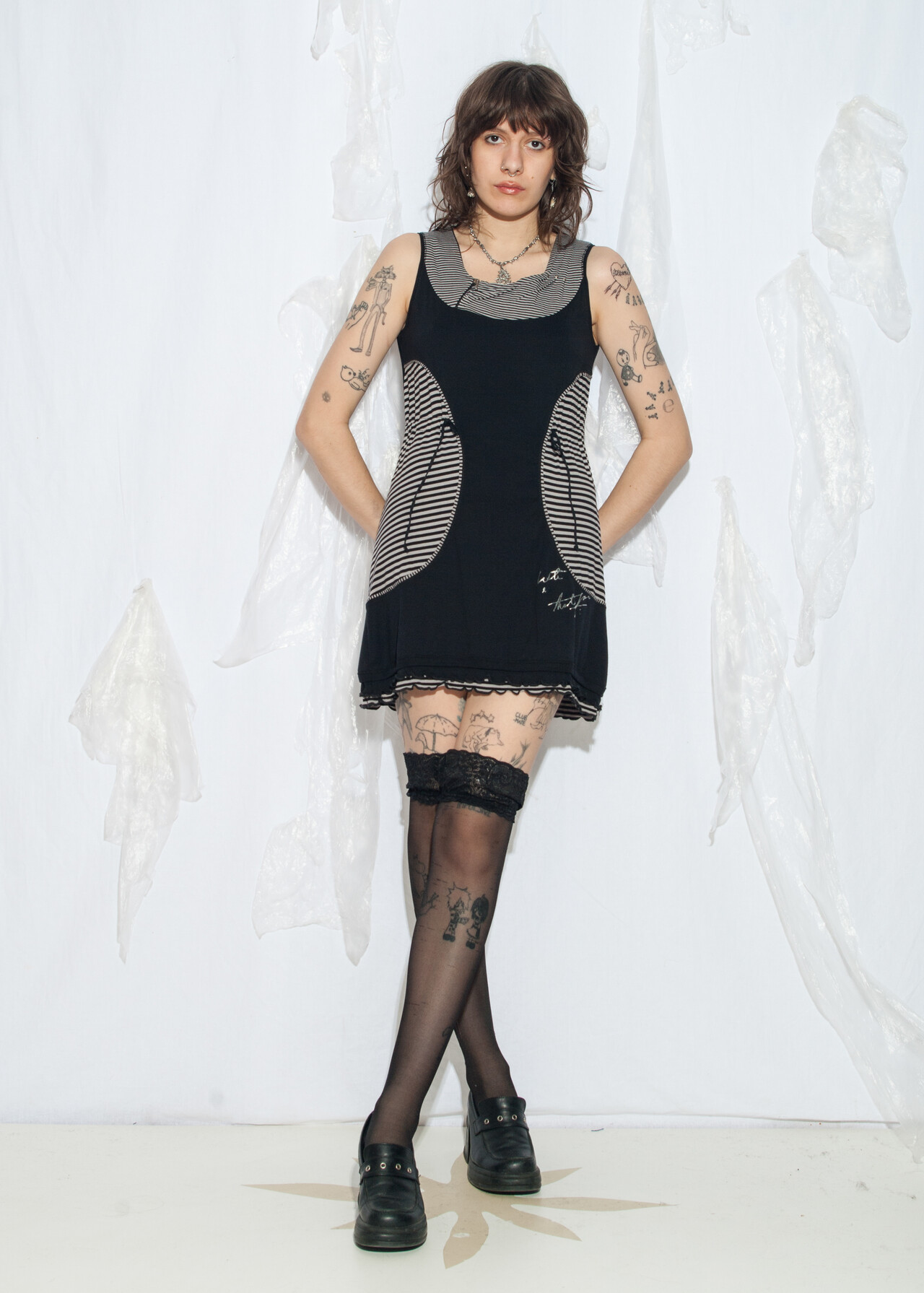 Tags: 2000s style clothing, dark whimsi twee, emo tunic, grunge outfit, natural fabric, striped mini dress, y2k vintage fashion