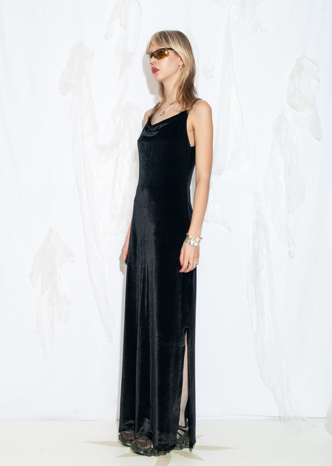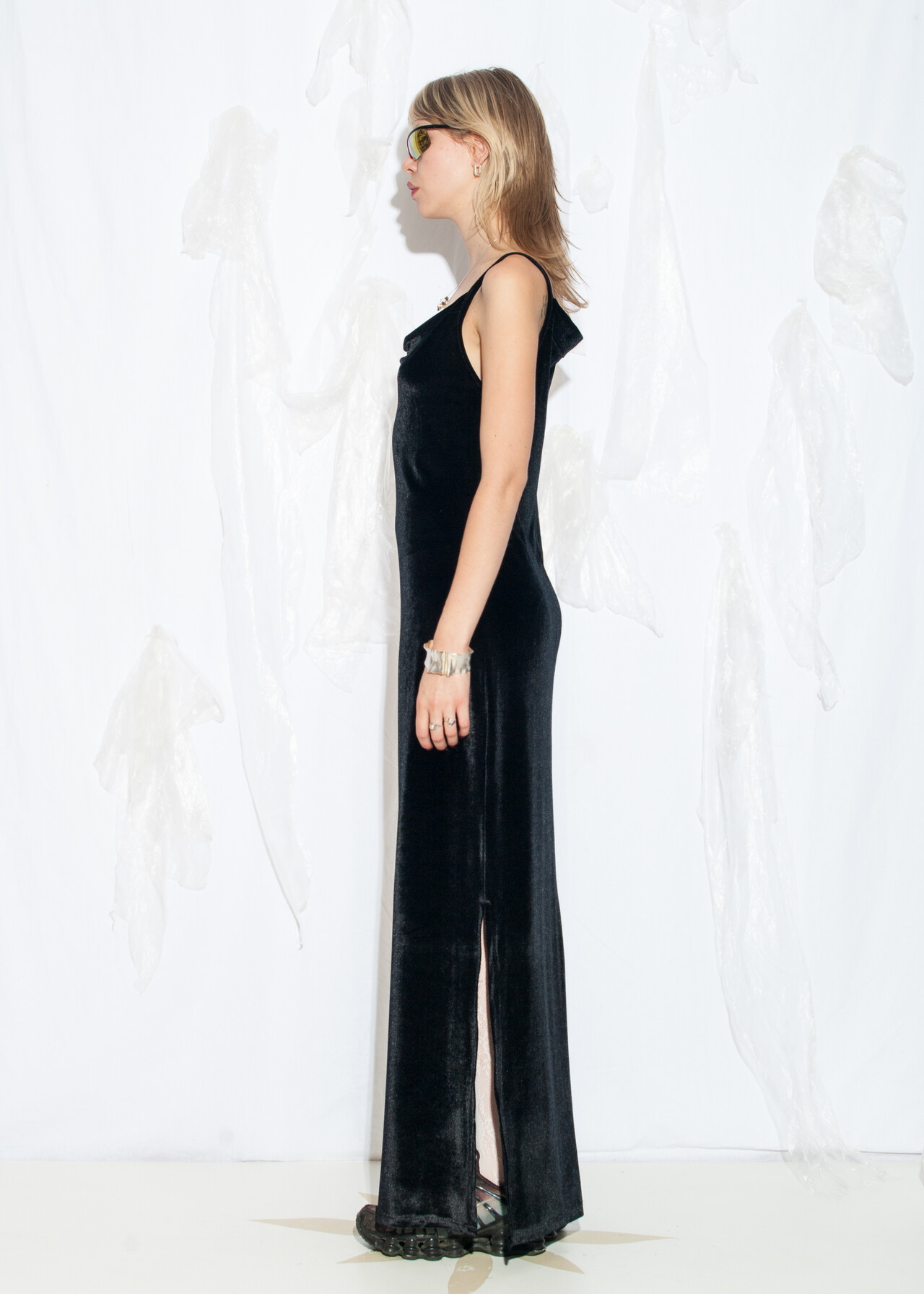 Tags: 2000s style clothing, evening maxi dress, long black dress, prom dress, slouchy top, step slit, velvet party dress, whimsigoth, y2k vintage fashion