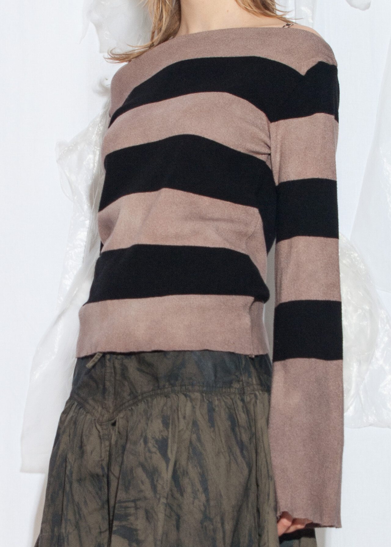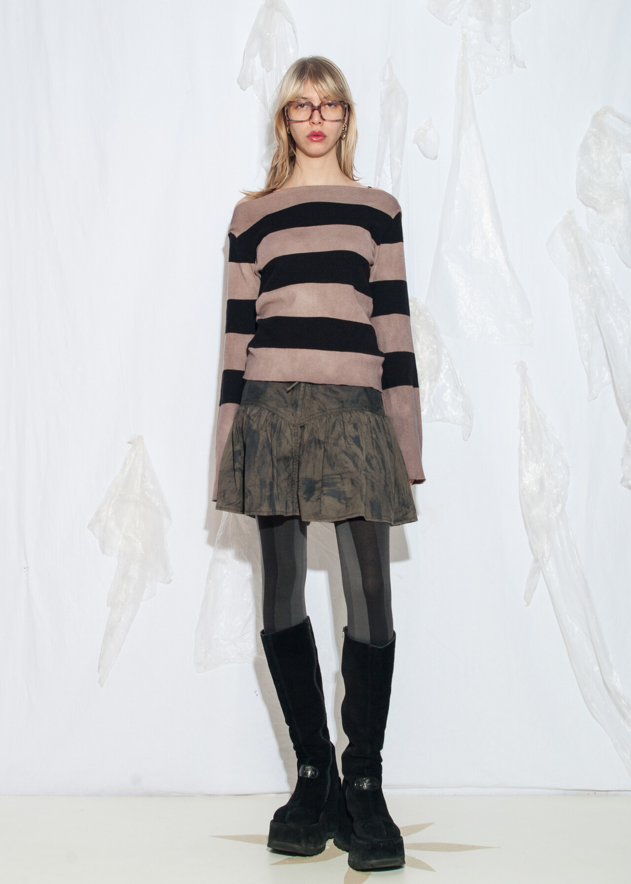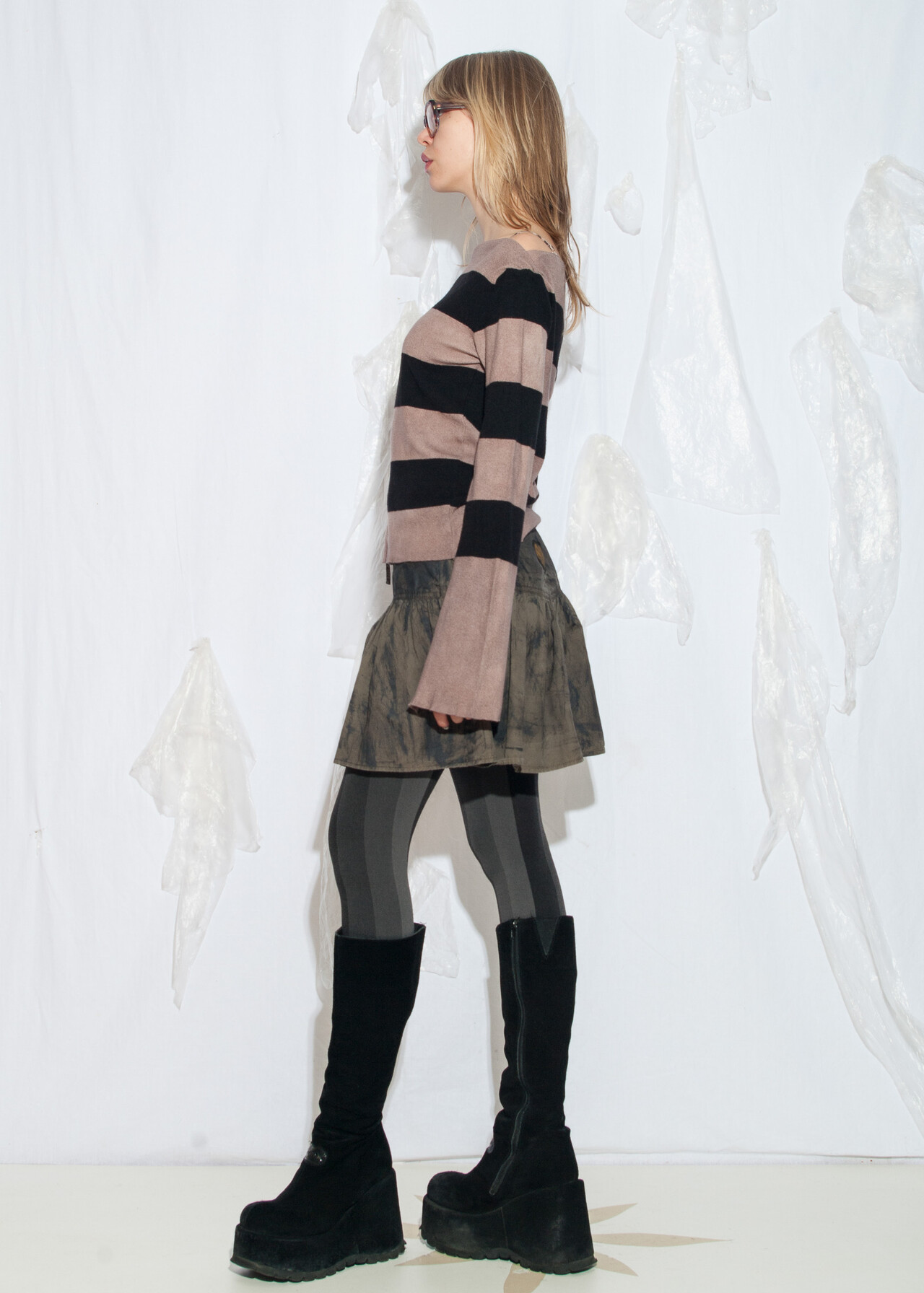This Y2K vintage knit jumper is a rainbow of Tim Burton aesthetic, with its off shoulder top, striped sweater vibes, and flare sleeves ready to make you the star of any grunge outfit. Upcycled and overdyed in pinkish brown and black, it’s the perfect blend of quirky and cool for your early 2000s throwback dreams.