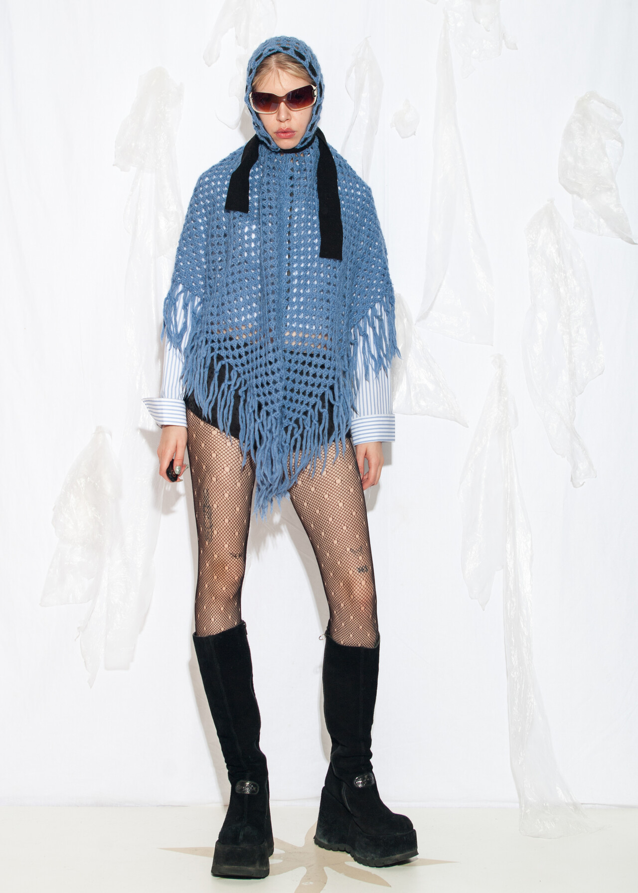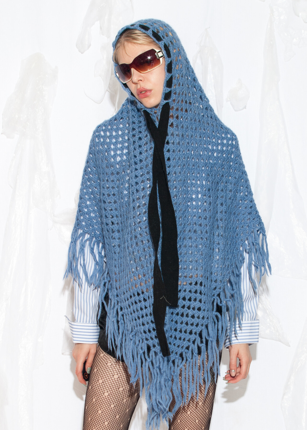 Tags: 70s vintage fashion, crochet top, fringe scarf, handmade crocheted, hooded cape, knitted poncho, winter accessory, y2k style accessory