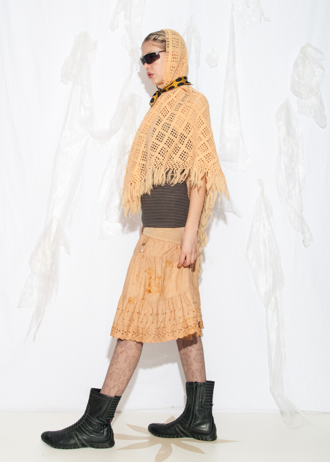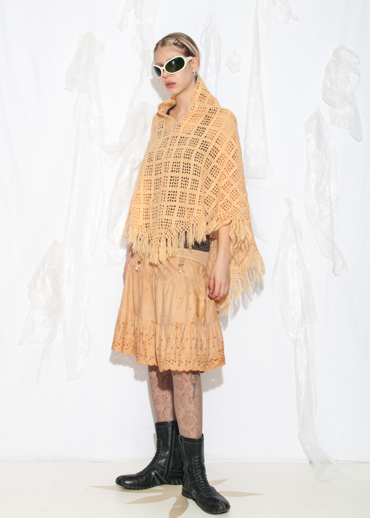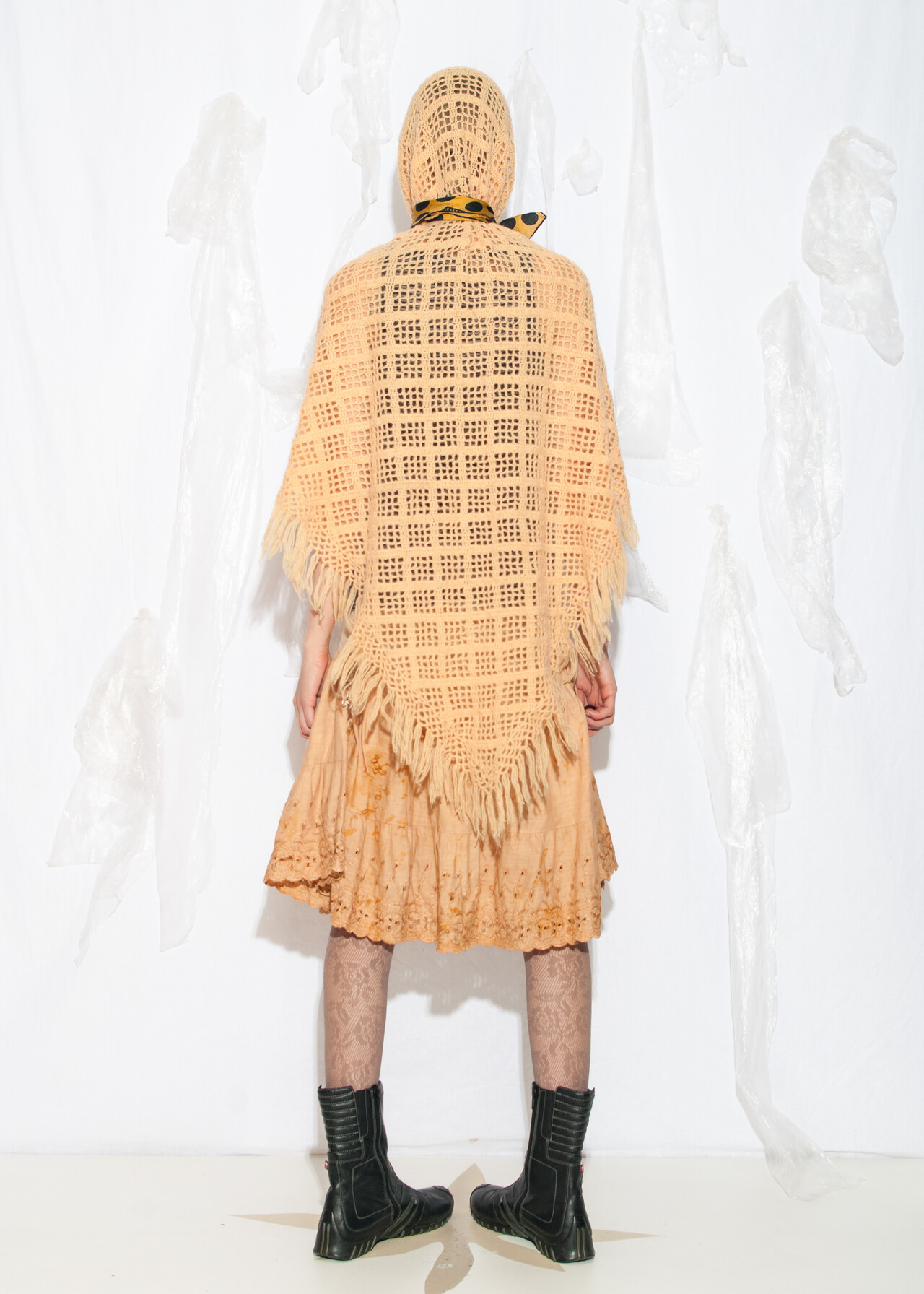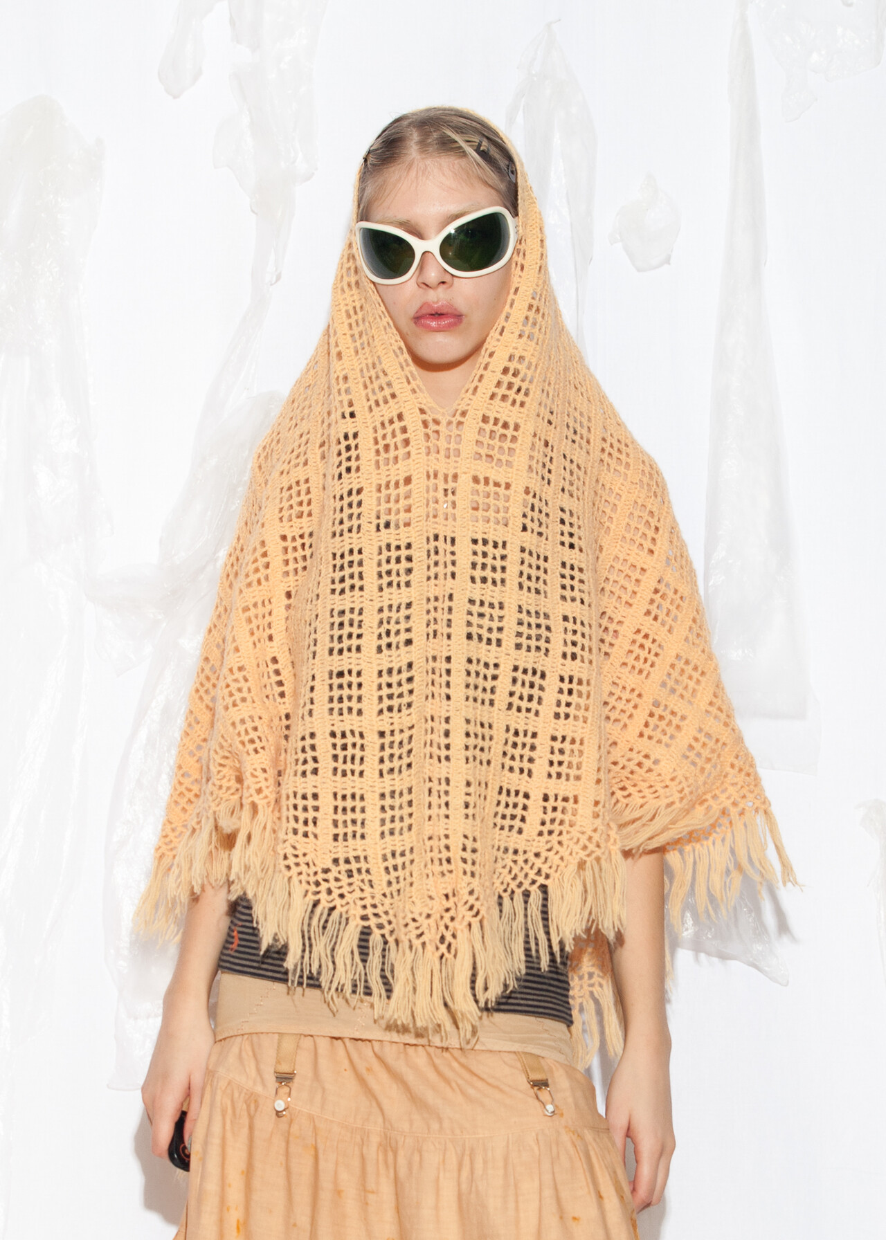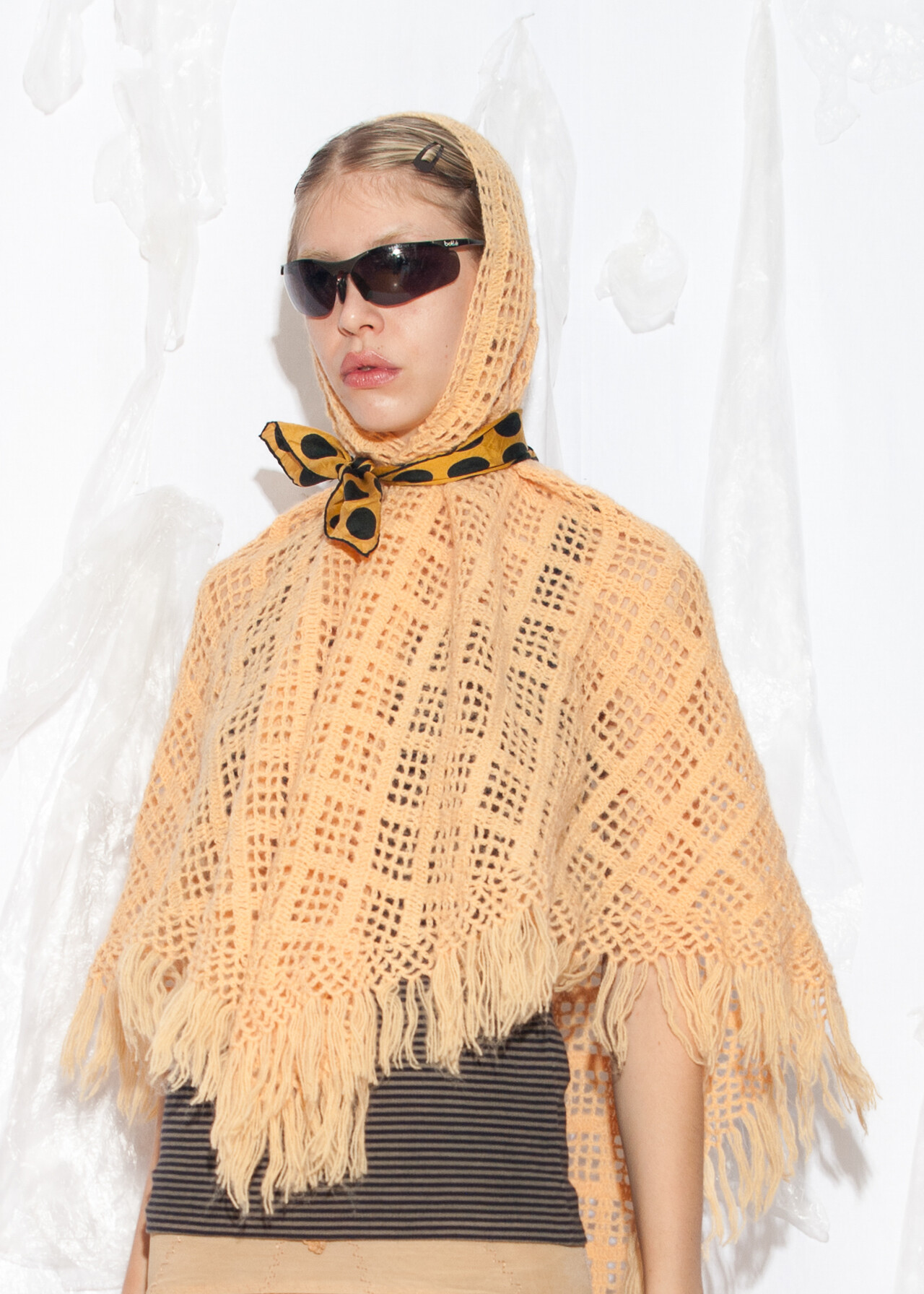 Tags: 70s vintage style, crochet lace, fringe poncho, hooded cape, knit scarf, winter knitwear, y2k style accessory