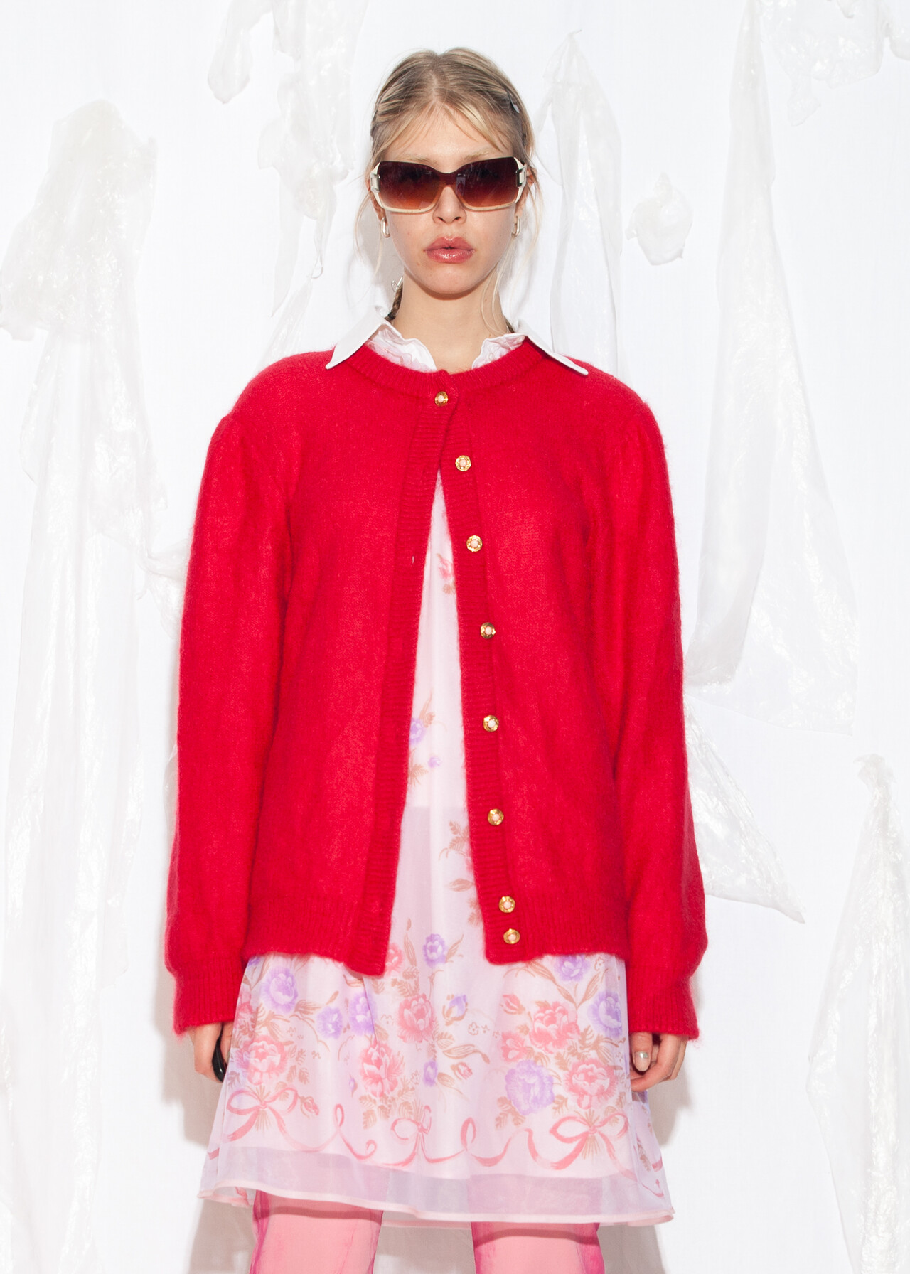 Tags: 80s vintage fashion, glam jumper, grandpacore, knitted red cardigan, mohair wool blend, office siren, puff sleeve sweater, whimsi twee look, winter knitwear, womens vintage