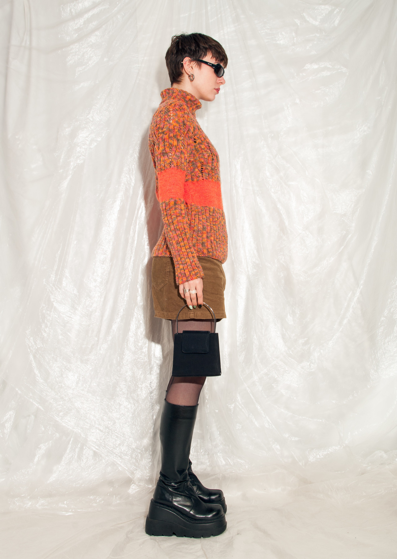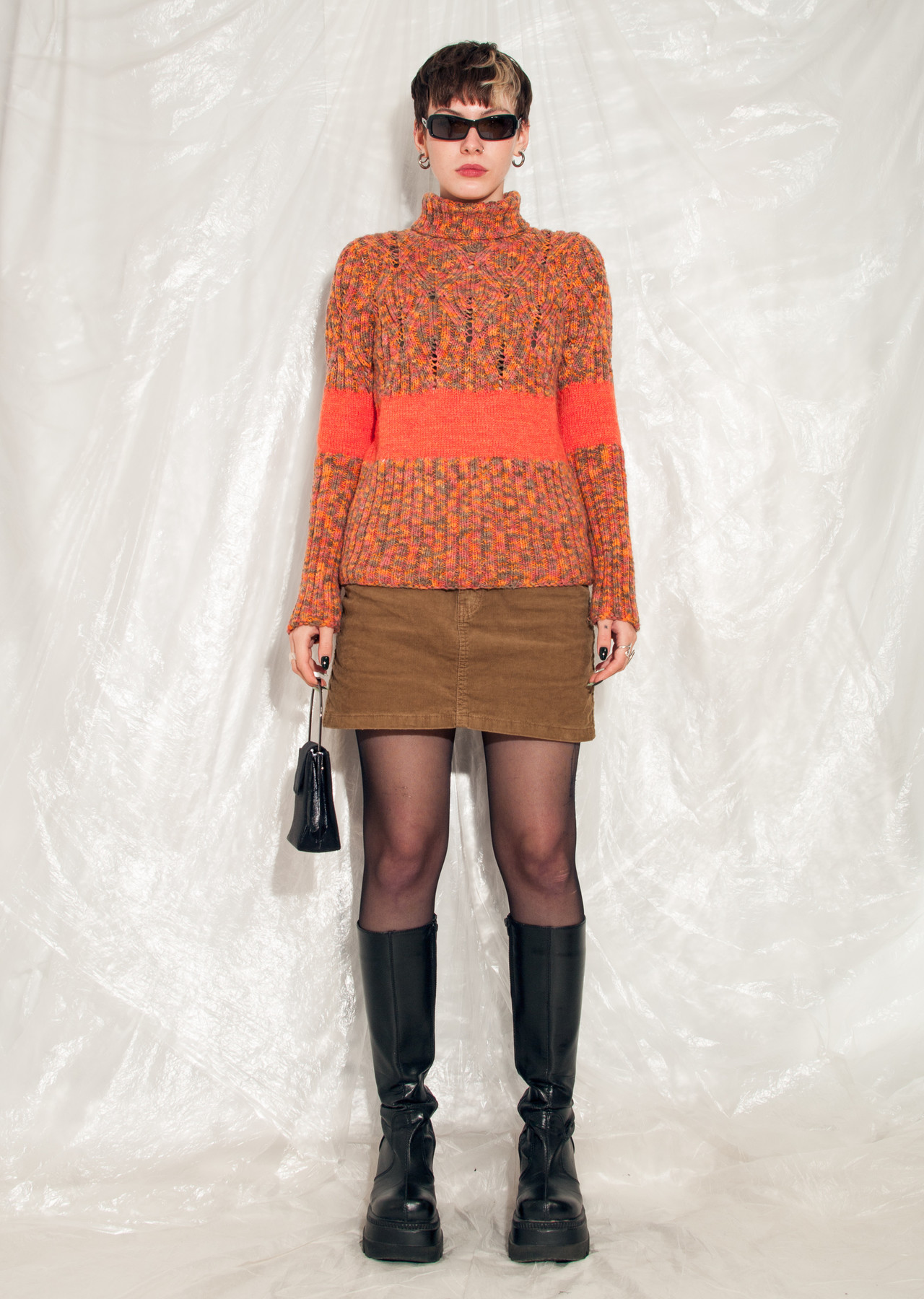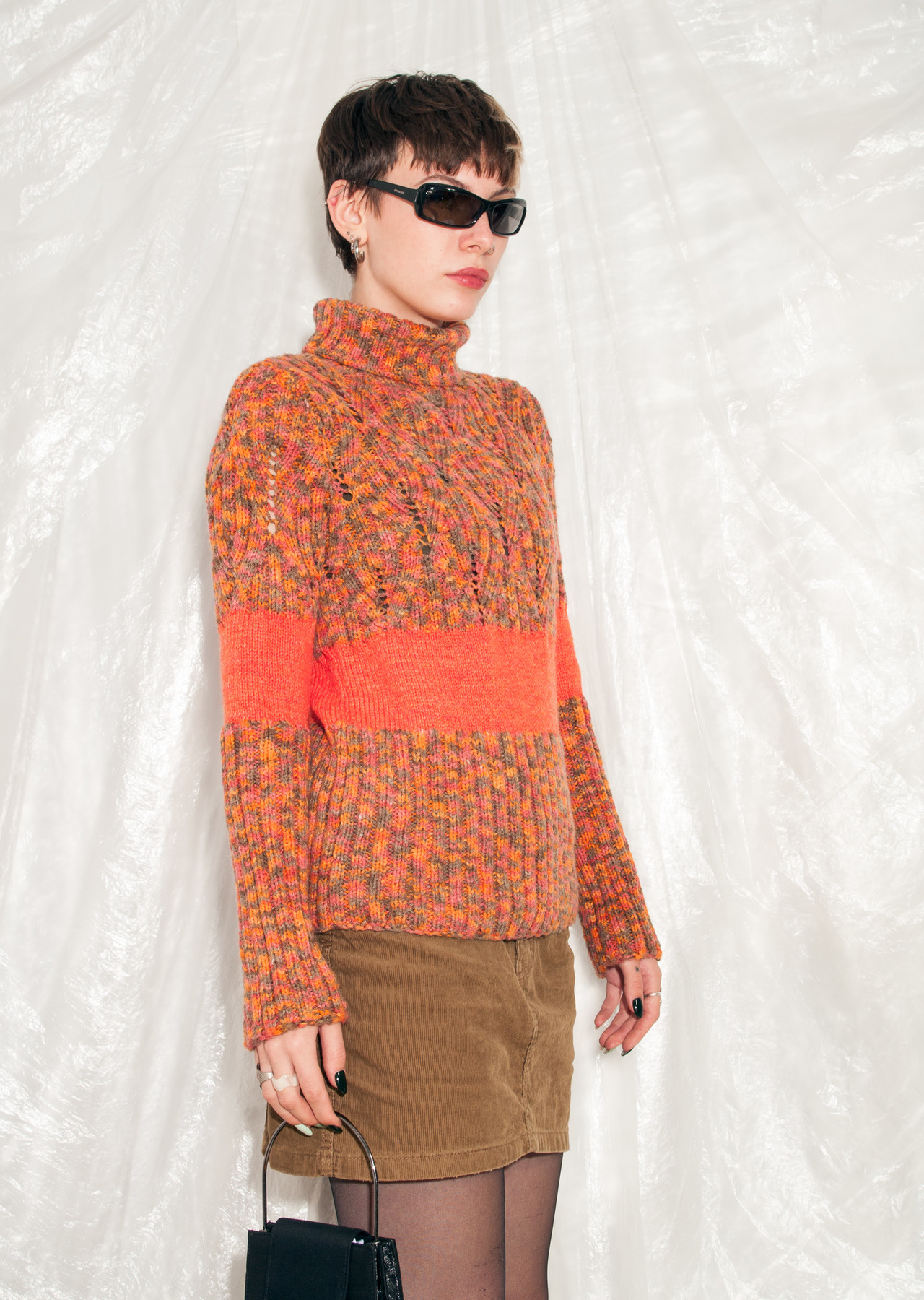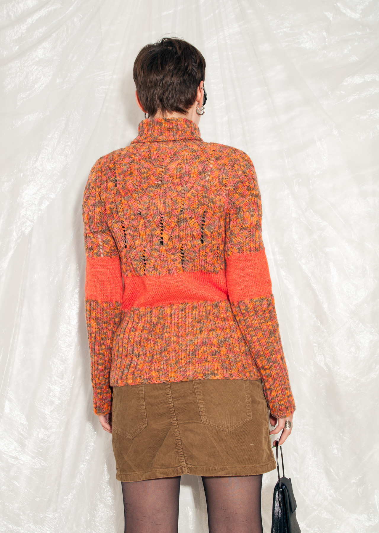 A vintage handmade knitted jumper that arrived from the 90s in great shape. Featuring a turtleneck cut, orange mixed yarn and a noisy pattern. Save this vintage gem from ending in the landfill!