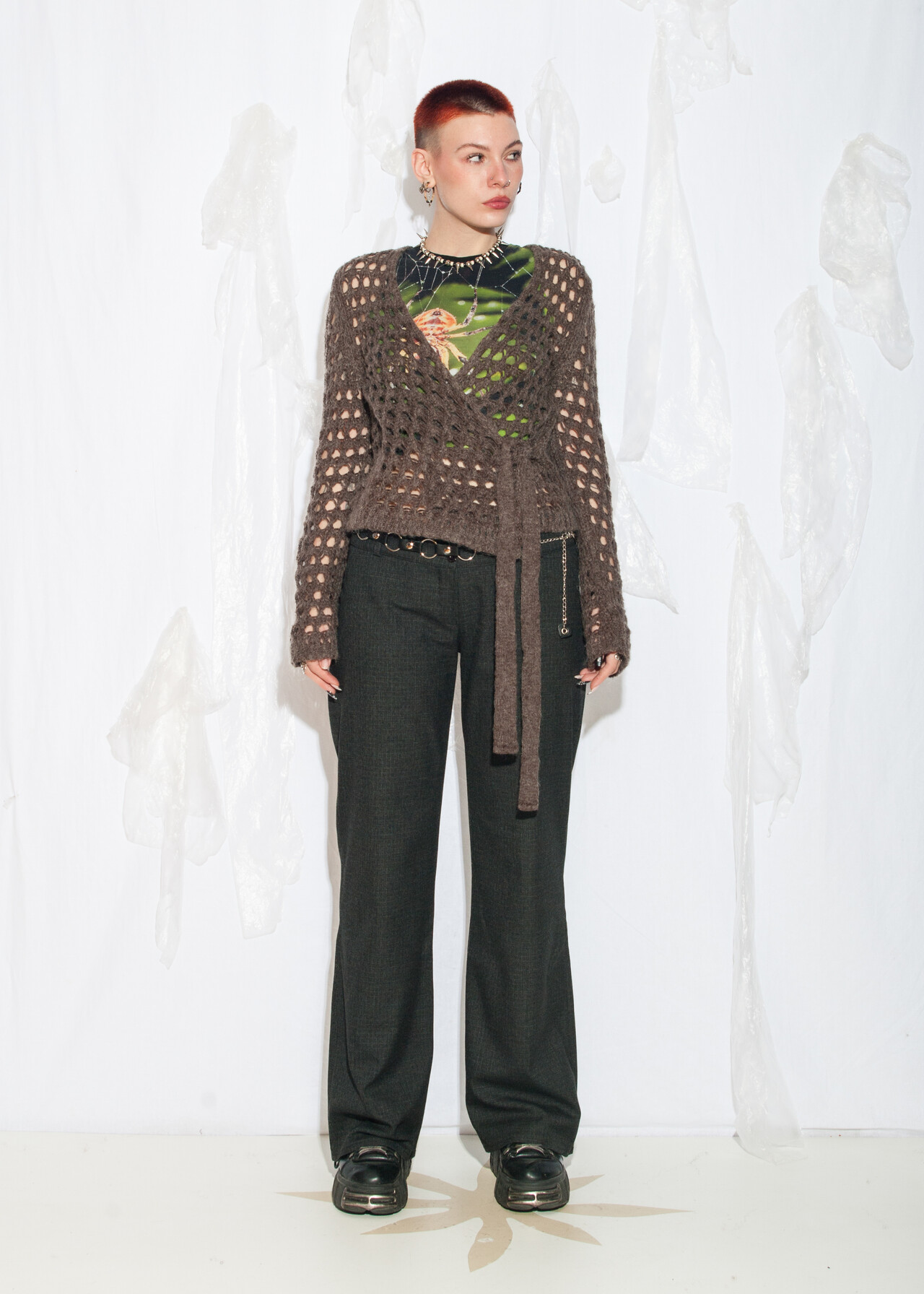 Tags: 2000s style clothing, brown knit sweater, fishnet top, tie cardigan, whimsigoth, y2k grunge outfit, y2k vintage fashion