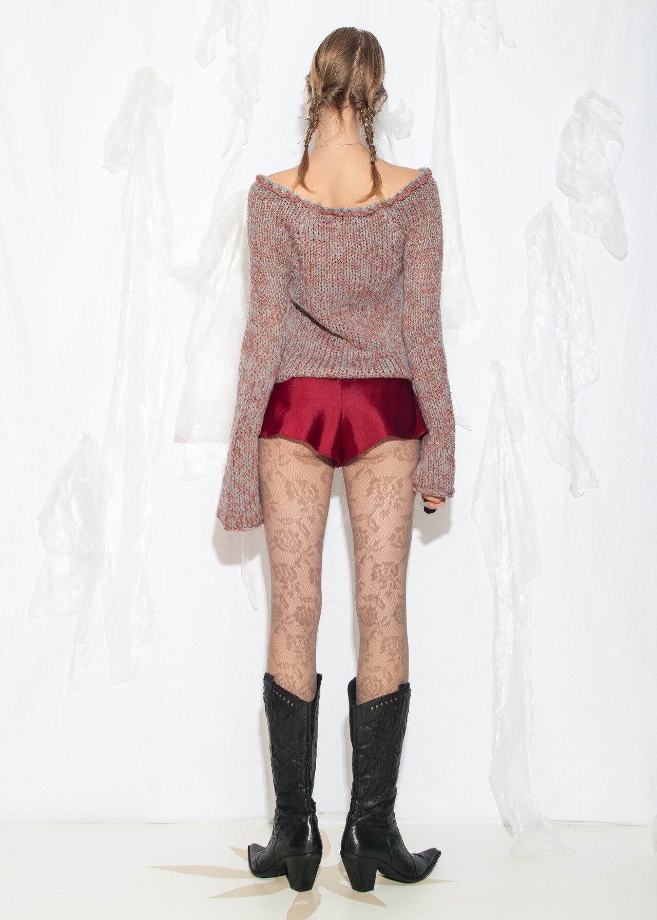 Tags: 2000s style clothing, boat neck sweater, flare sleeve top, hand knit jumper, handmade, noisy knitwear, whimsigoth, y2k grunge outfit, y2k vintage fashion