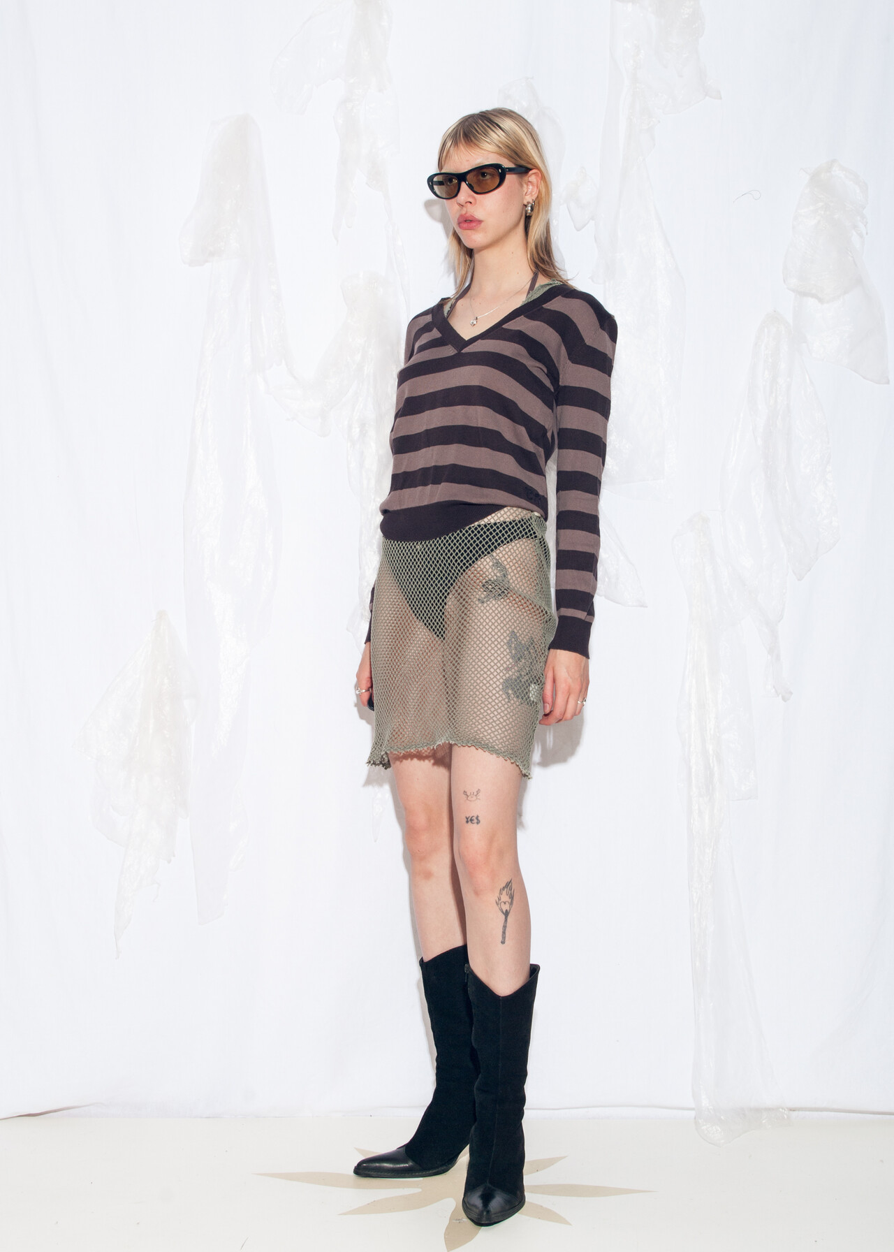 Tags: 2000s style clothing, chunky brown sweater, cotton knitwear, knitted v neck top, striped jumper, y2k grunge outfit, y2k vintage fashion