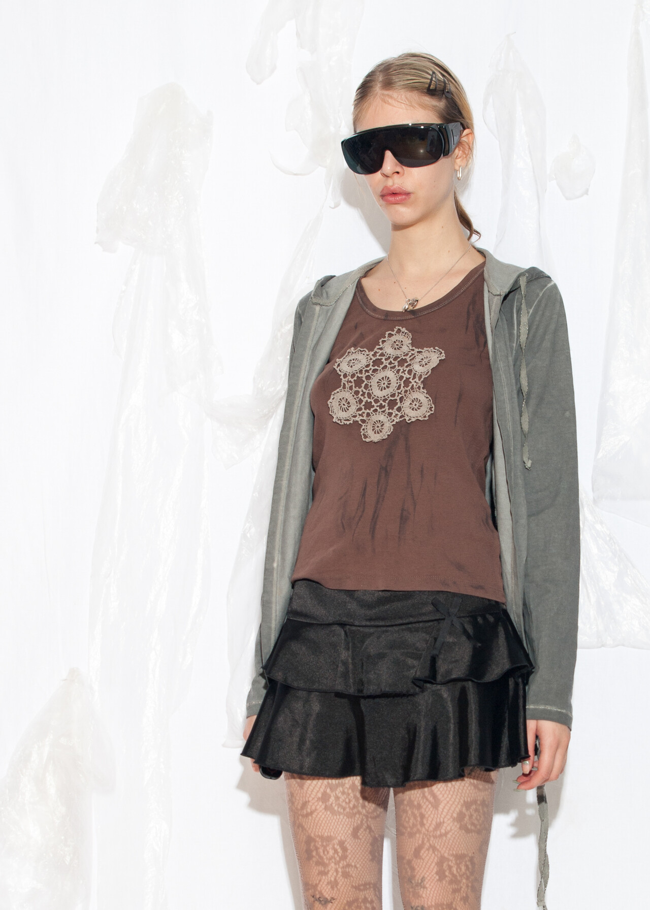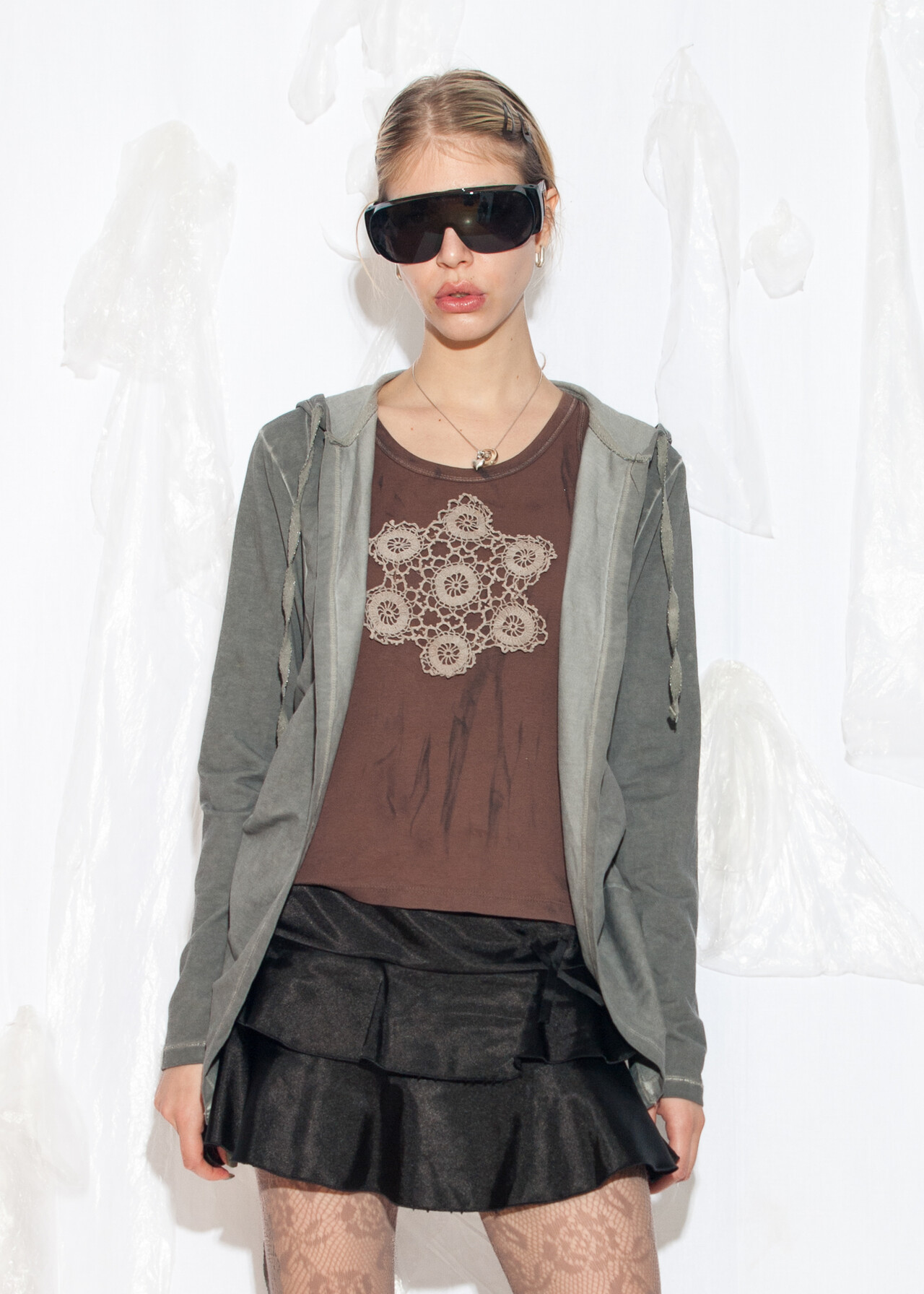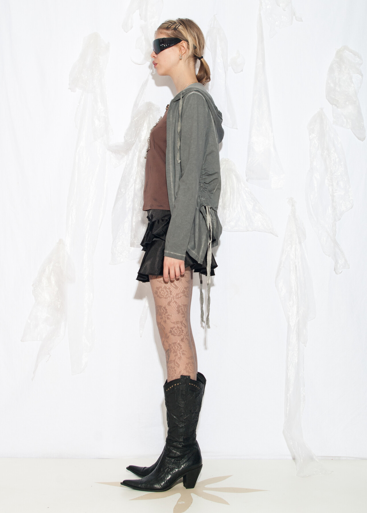 Tags: 2000s style clothing, cotton jumper, cyber grunge outfit, grey goodie, hooded cardigan, ruched side, y2k vintage fashion