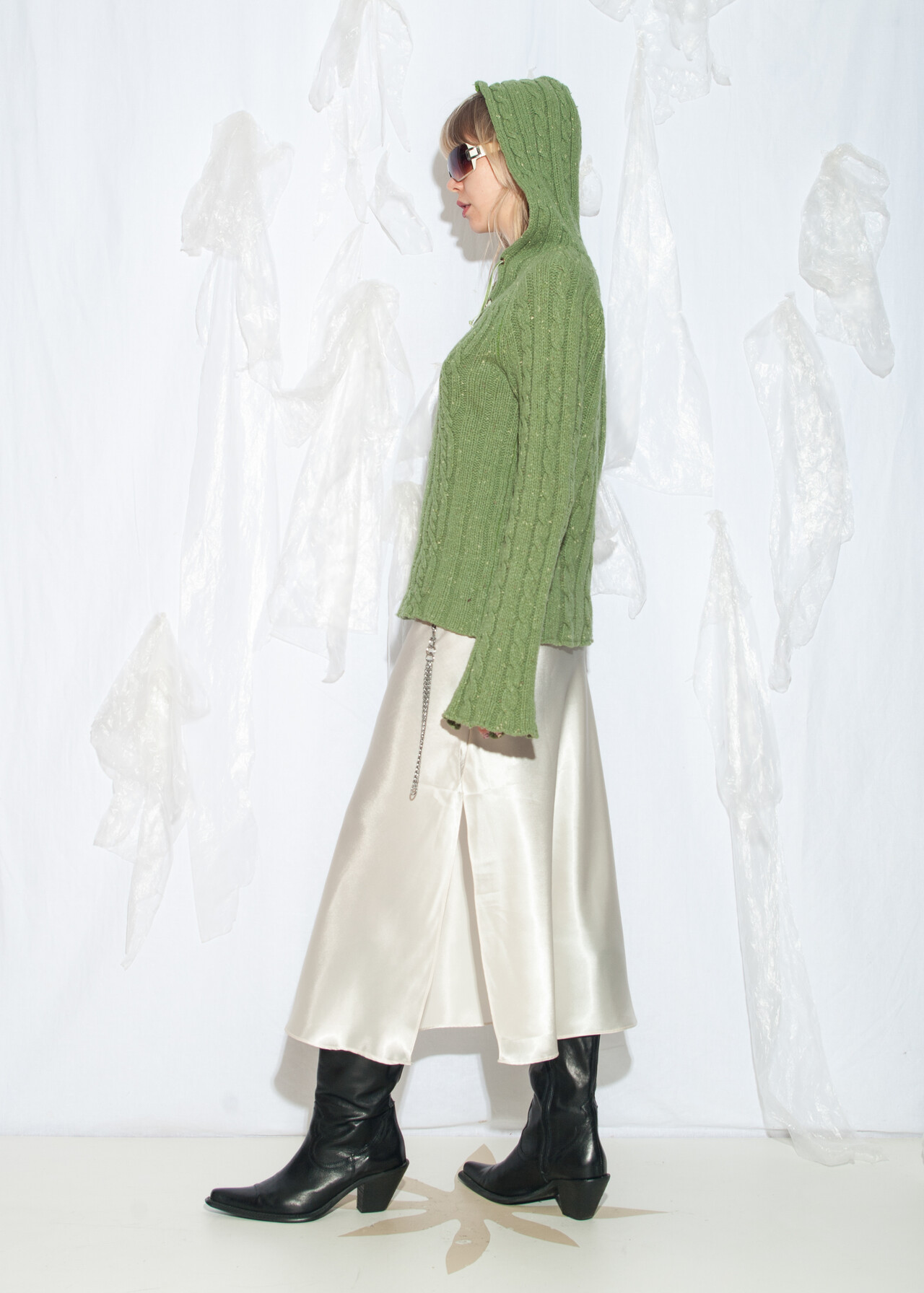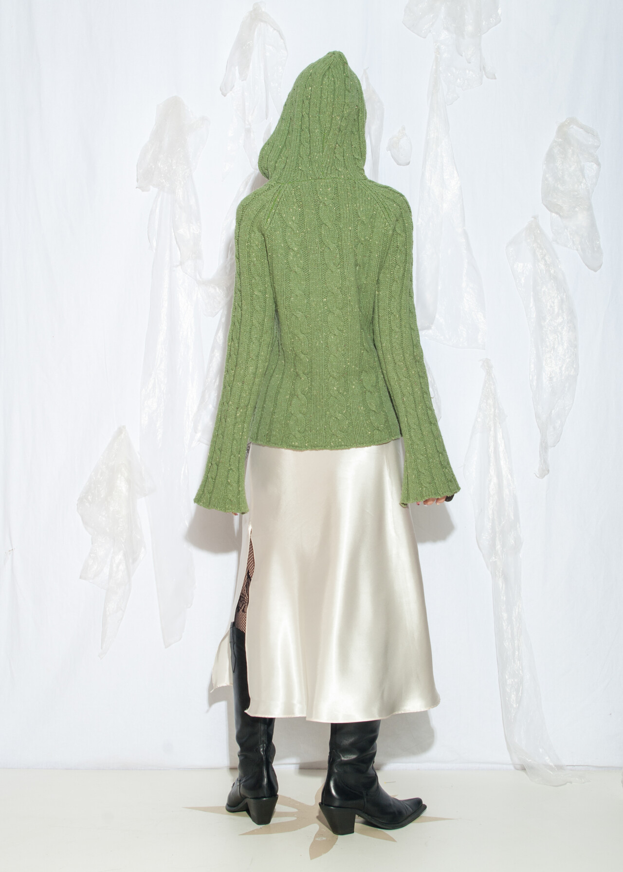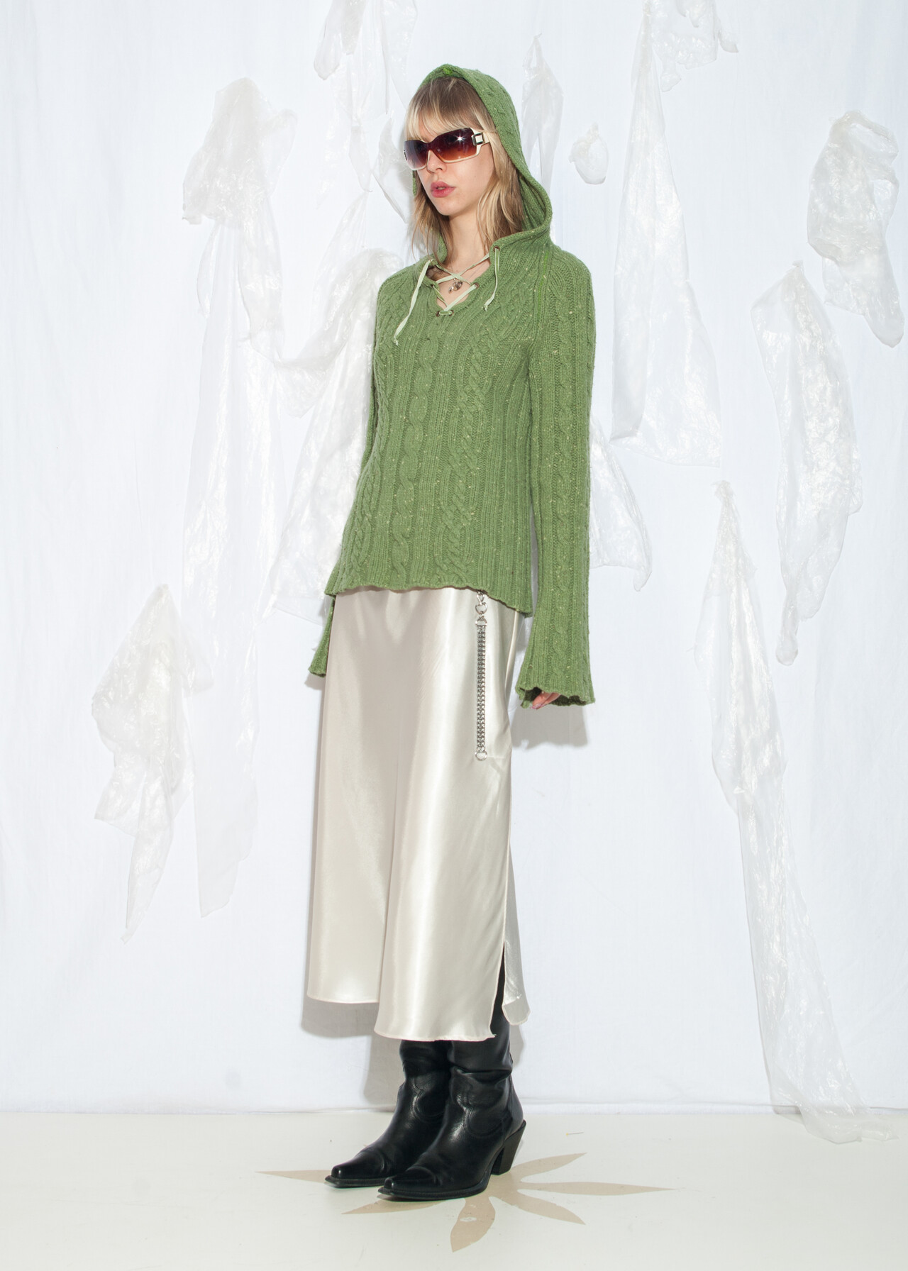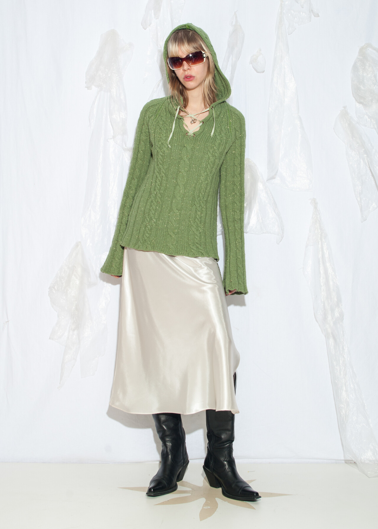 Tags: 2000s style clothing, cable-knit, cotton pullover, goblincore aesthetic, green knit sweater, hooded jumper, lace-up front, natural fabric, whimsi twee look, whimsigoth, y2k grunge outfit, y2k vintage fashion
