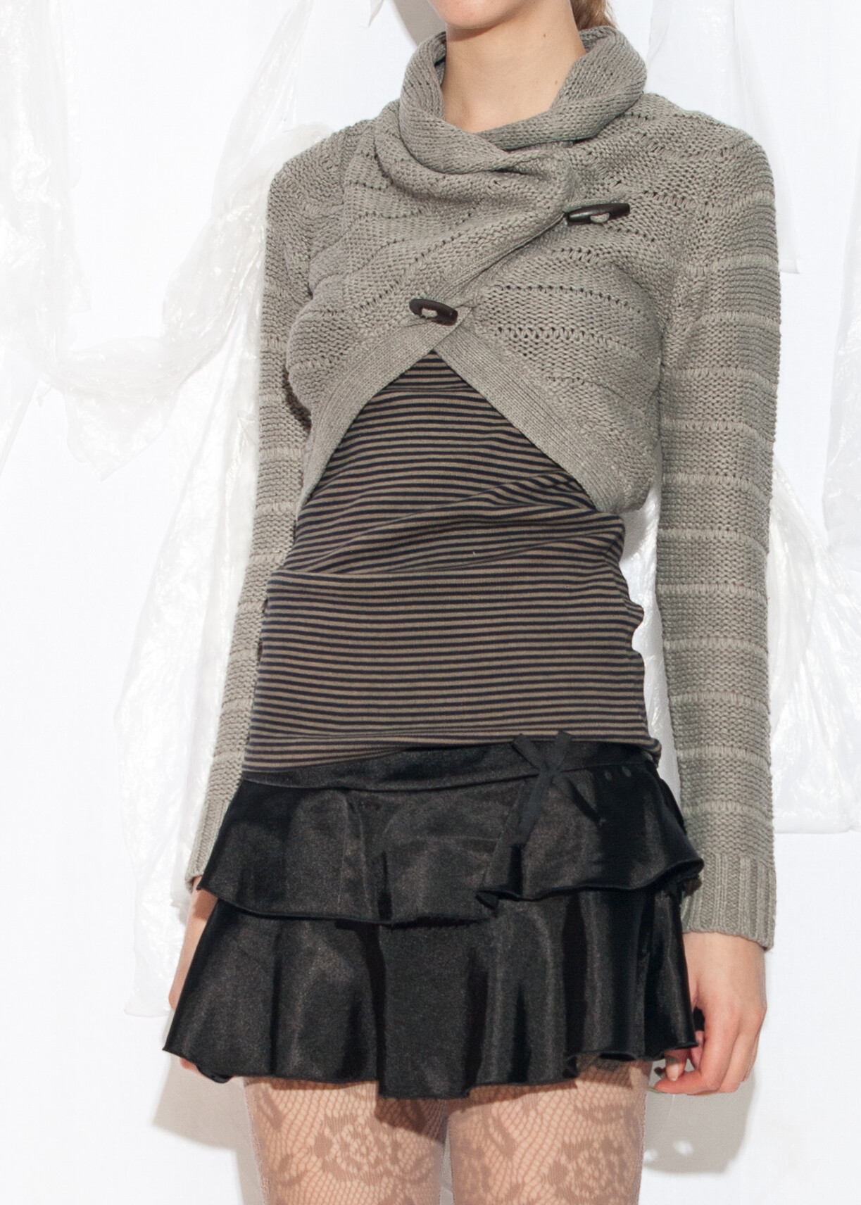 Tags: 2000s style clothing, bolero top, European vintage, grey knitwear, knit cardigan, office siren, short sweater, whimsi twee look, whimsigoth, y2k grunge outfit, y2k vintage fashion