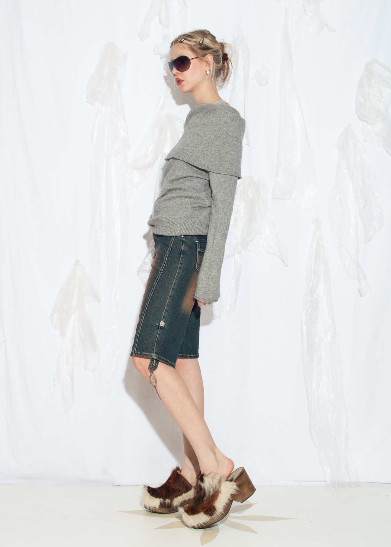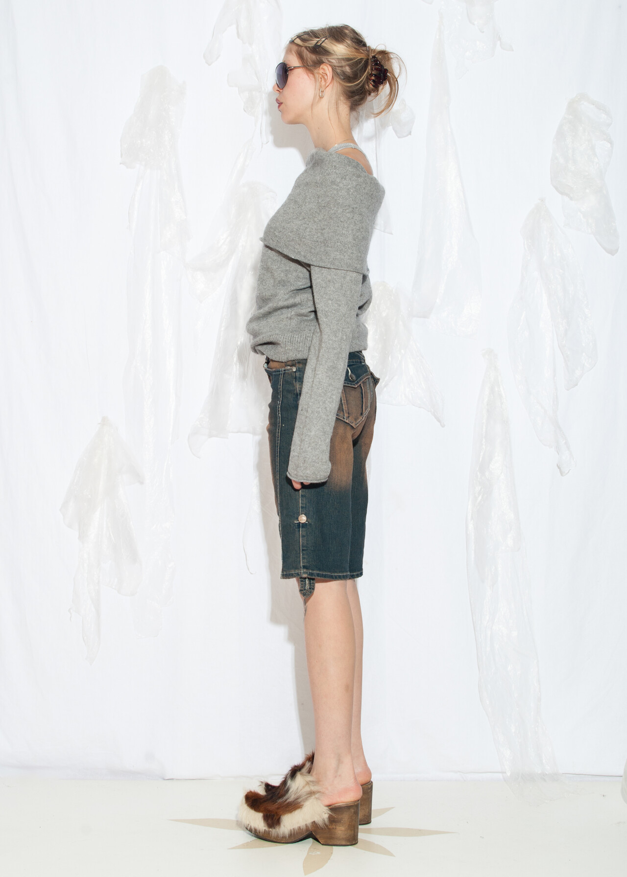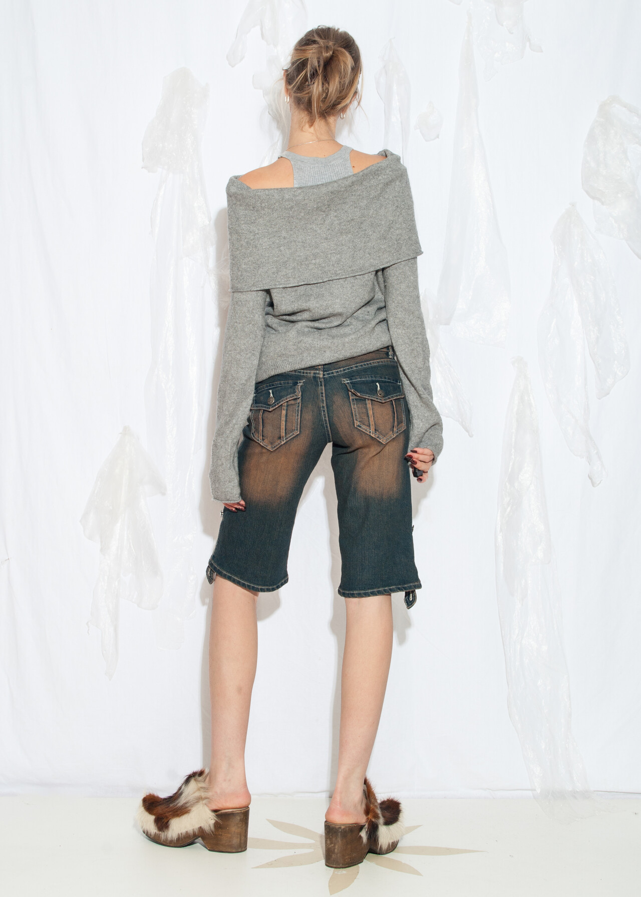 Vintage Y2K Off Shoulder Knit Jumper in Grey Wool Blend