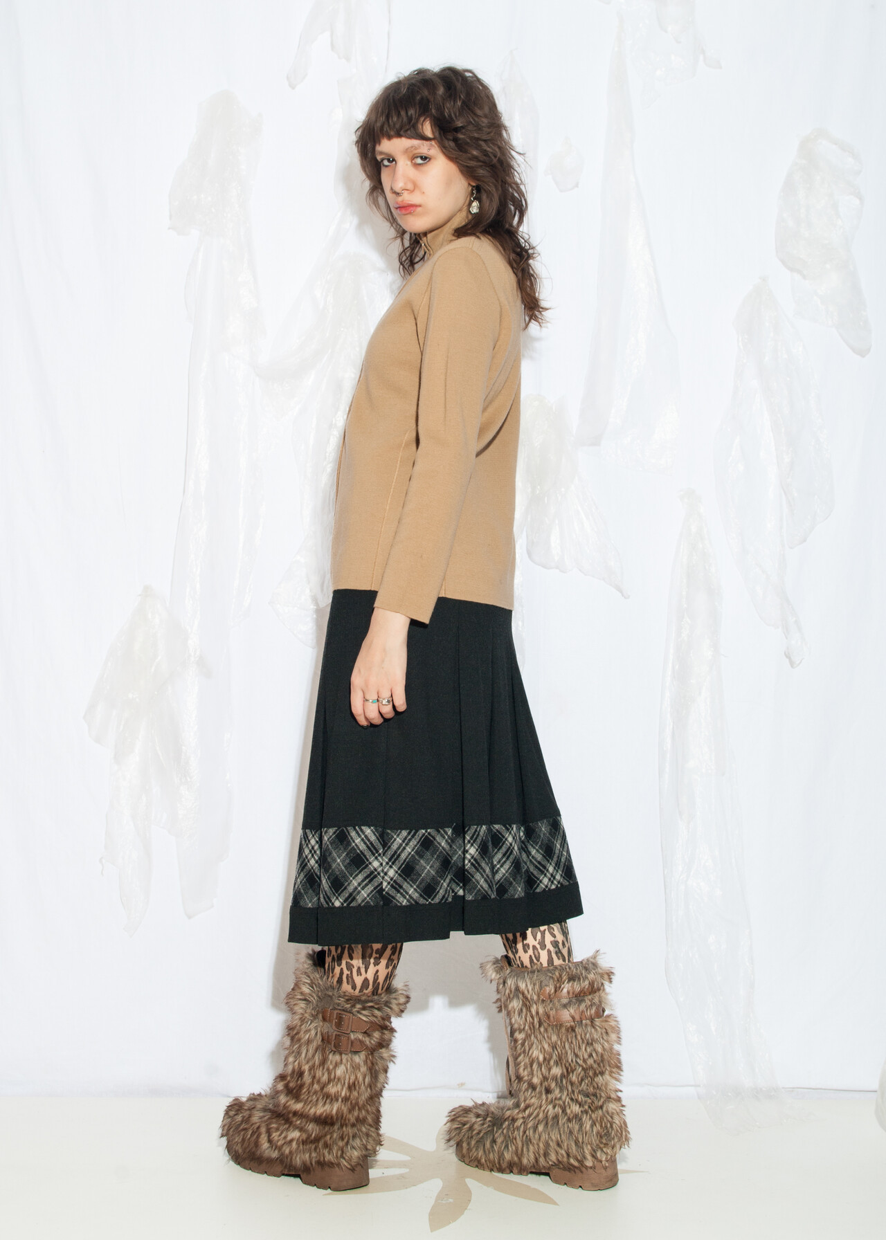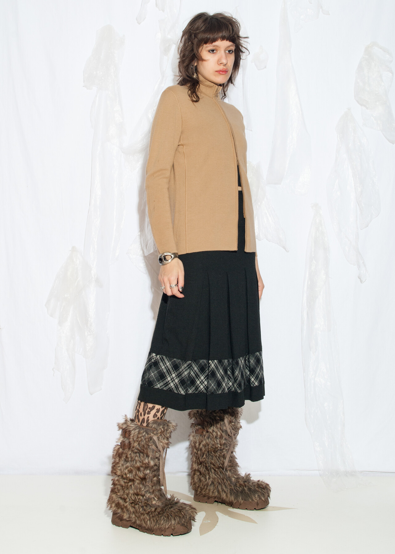 Tags: 2000s style clothing, European vintage, fitted sweater, knit jumper, knitted cardigan, made in Italy, merino wool blend, minimalist look, natural brown, office siren, two way zip, y2k vintage fashion