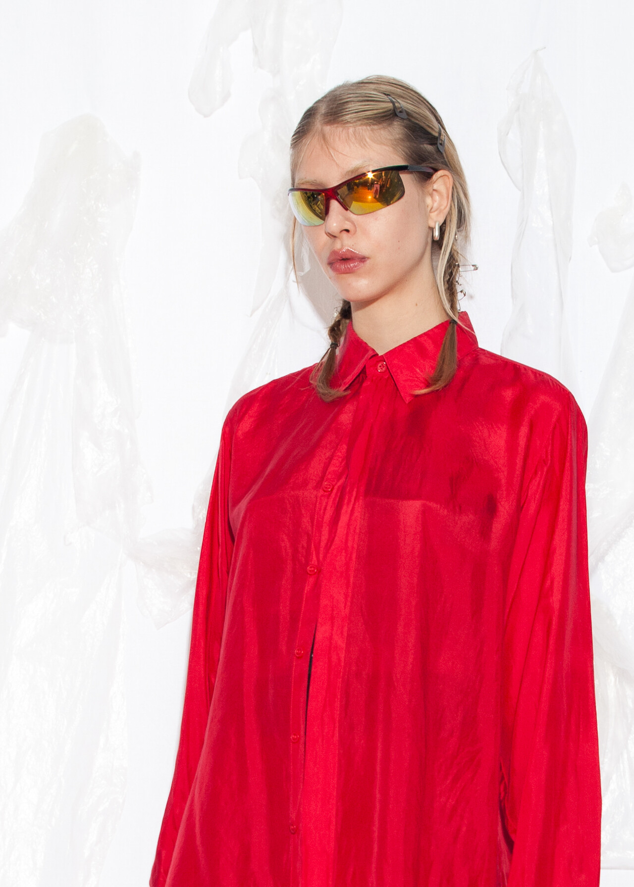 Tags: 80s vintage fashion, gender neutral, grunge outfit, minimalist look, office siren, oversized top, pure silk blouse, red silk shirt, unisex shirt, y2k style clothing