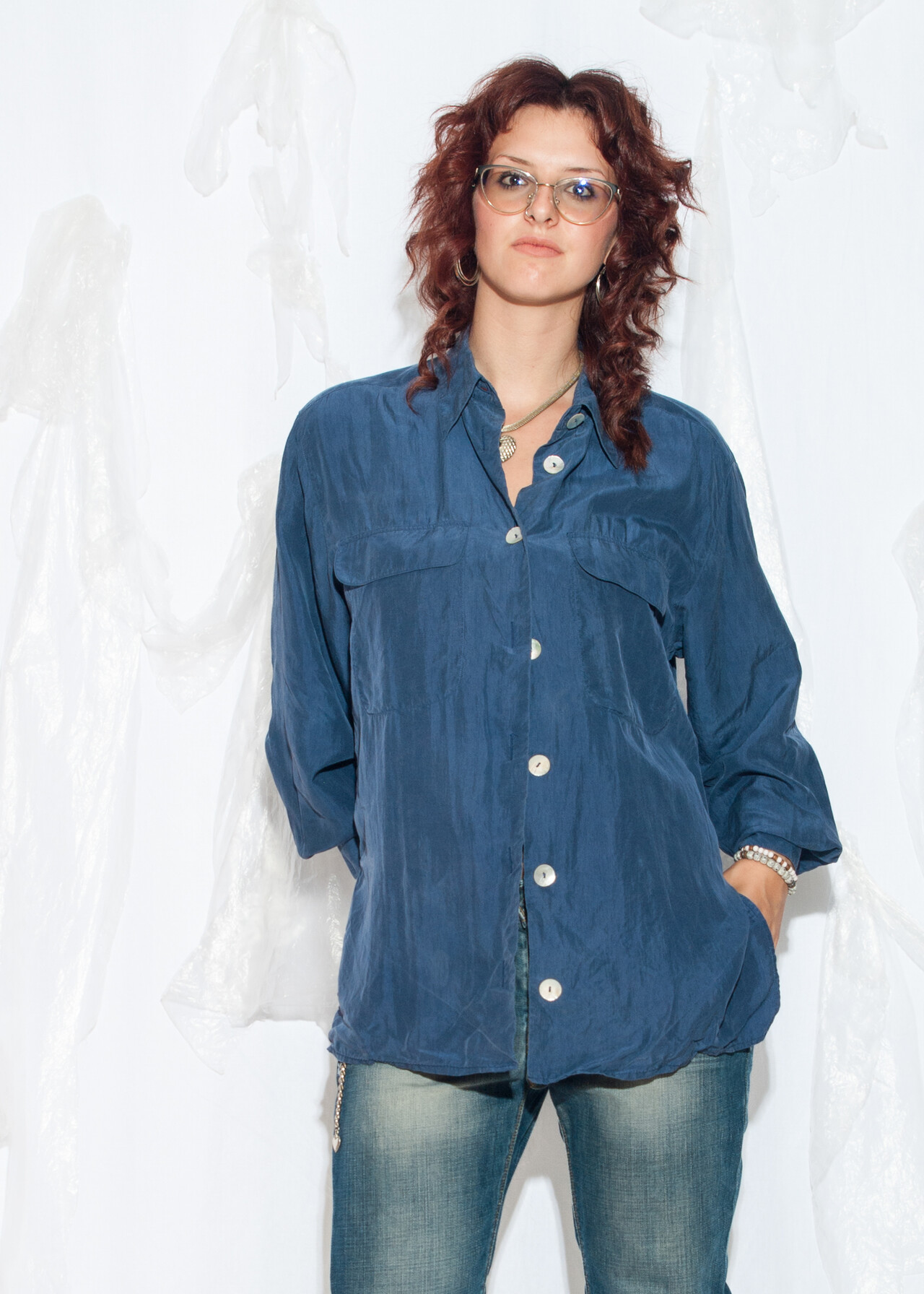 This 90s vintage pure silk shirt by Madeleine is the oversized blue blouse you need to channel your inner whimsigoth while pretending your Tamagotchi is still your top priority.