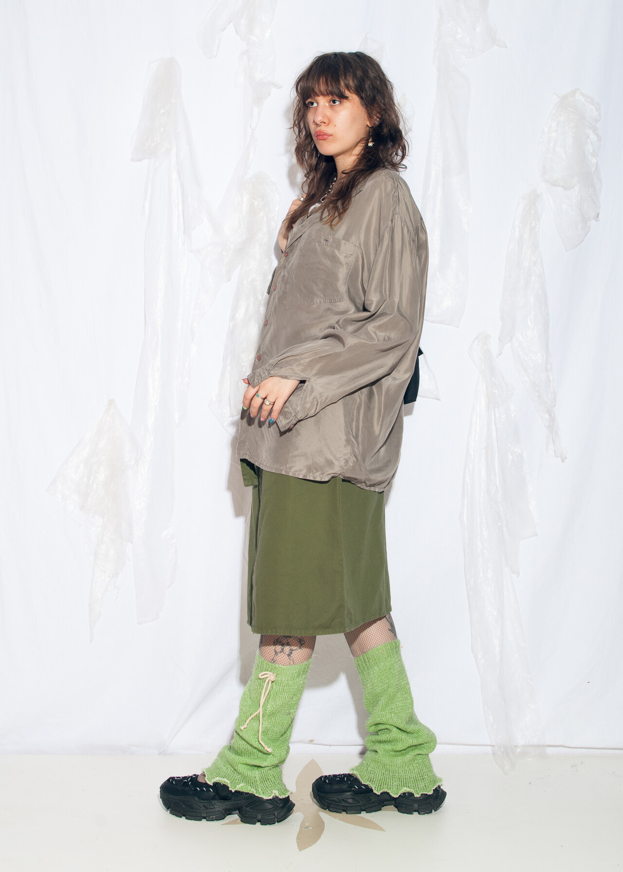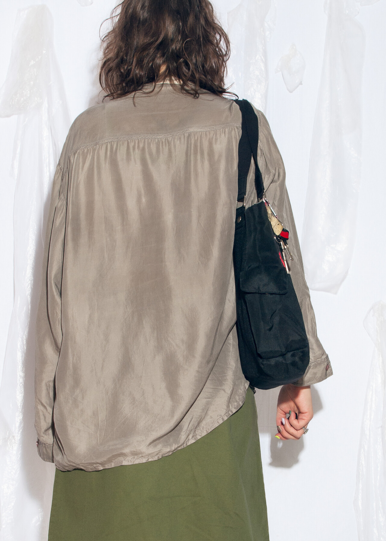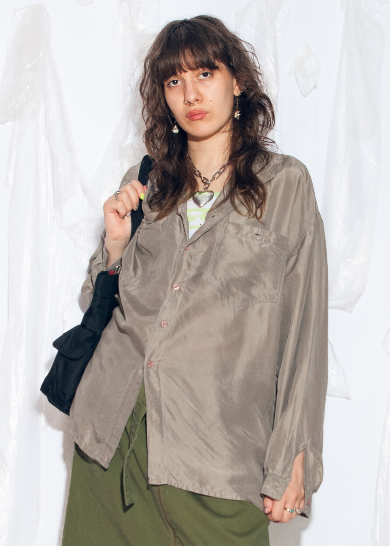 Tags: 90s vintage fashion, boyfriend shirt, grunge outfit, office siren, oversized grey top, pure silk blouse, y2k style clothing