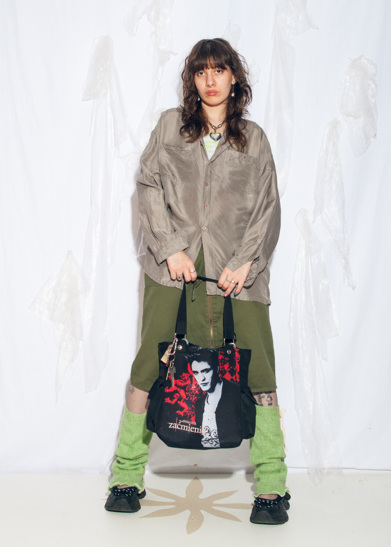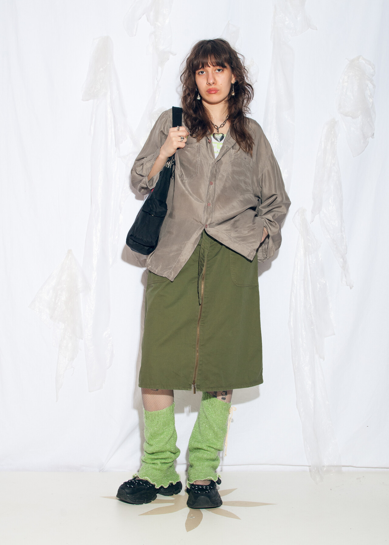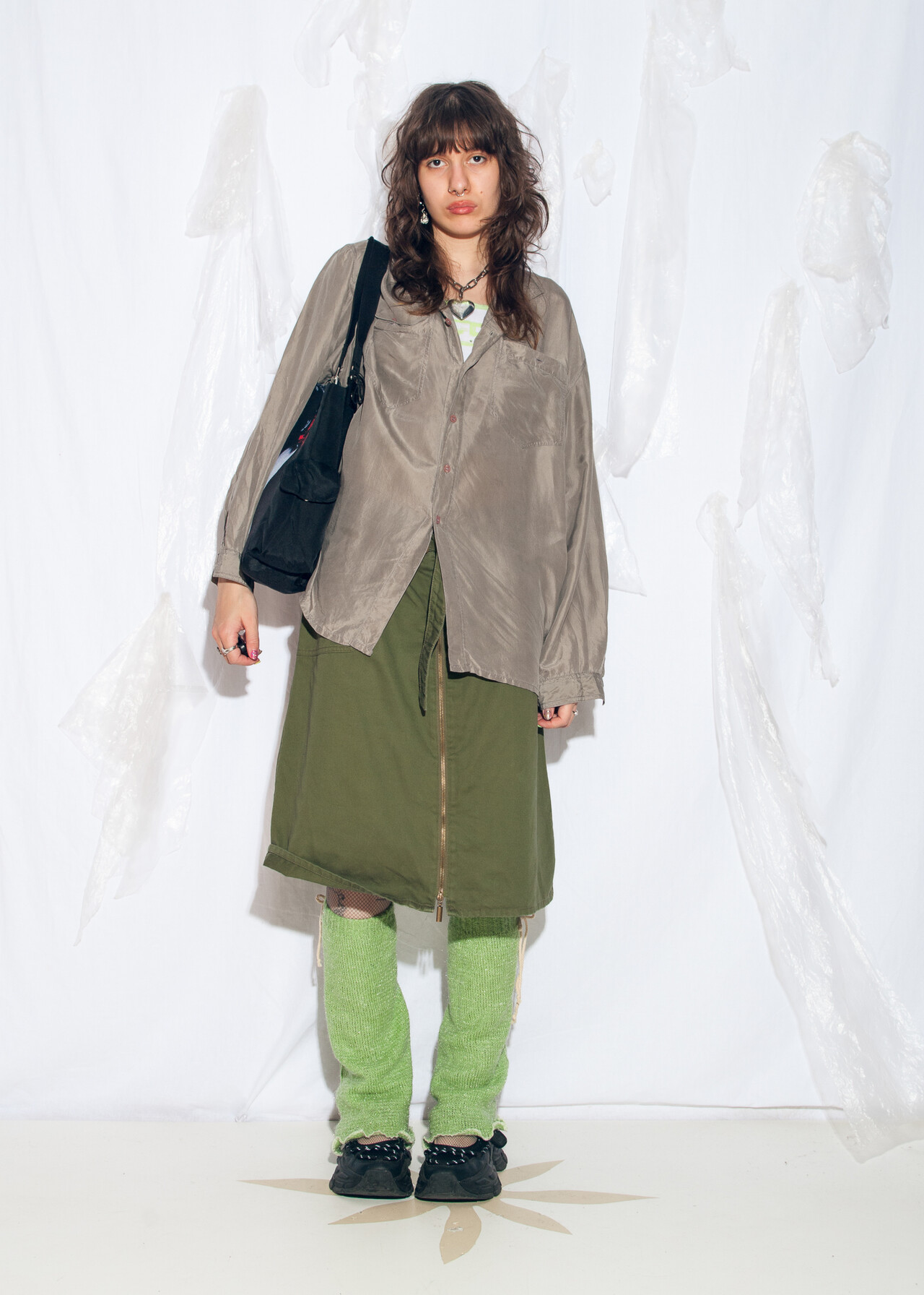 Tags: 90s vintage fashion, boyfriend shirt, grunge outfit, office siren, oversized grey top, pure silk blouse, y2k style clothing