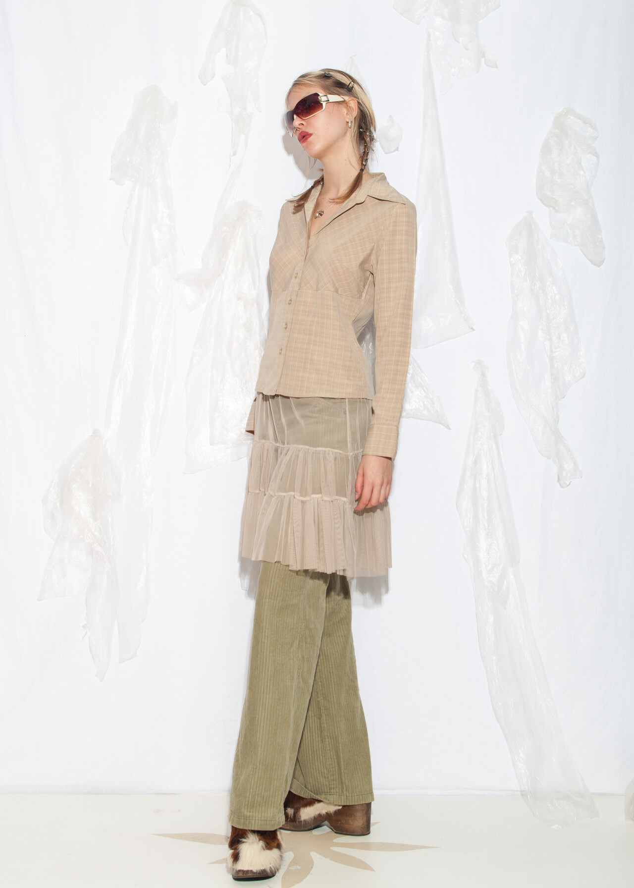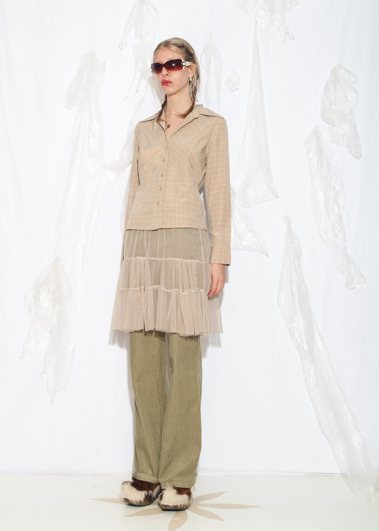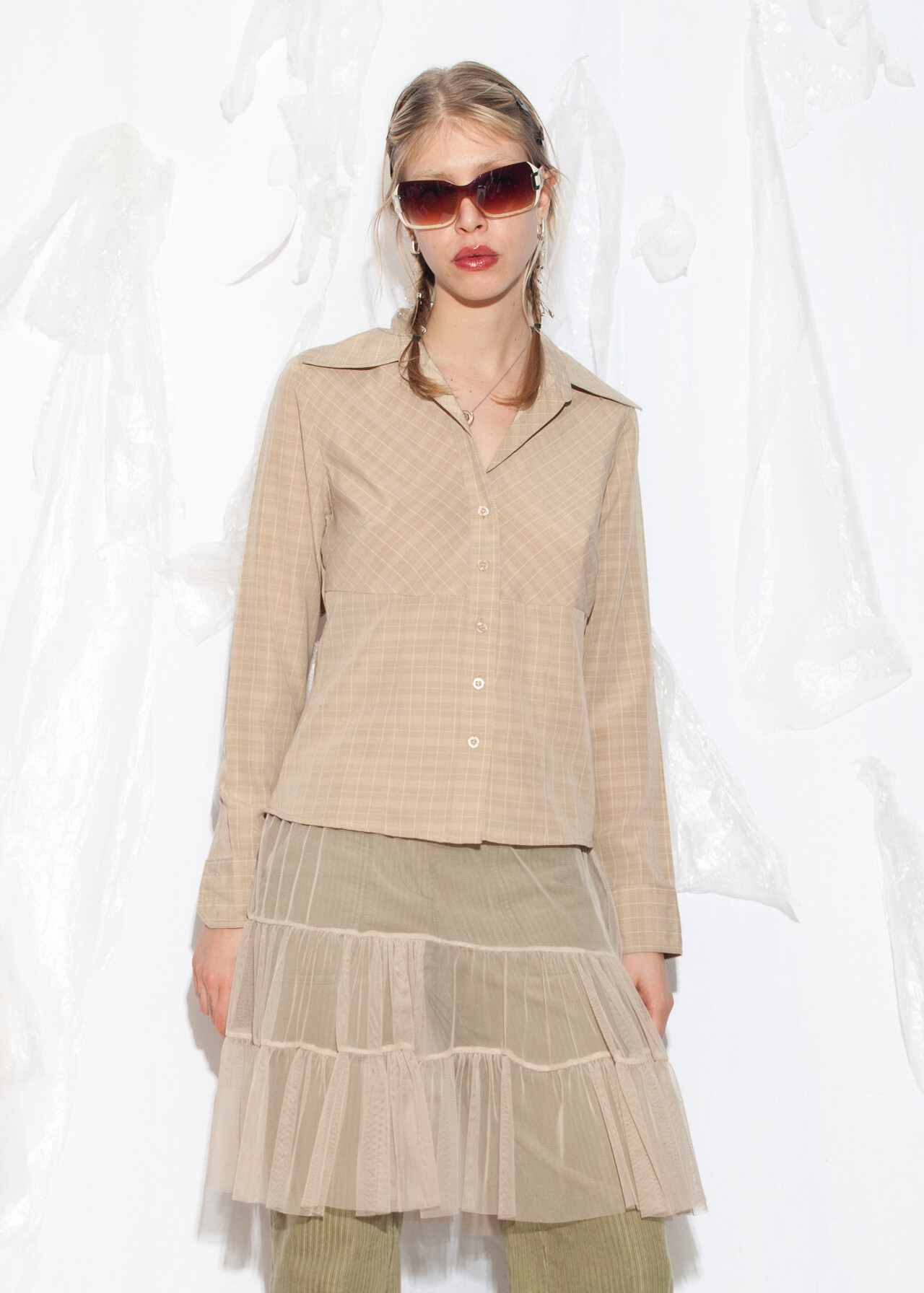 Tags: 2000s style clothing, beige plaid shirt, business casual, European vintage, minimalist look, office siren, officecore, slim fit blouse, y2k grunge outfit, y2k vintage fashion