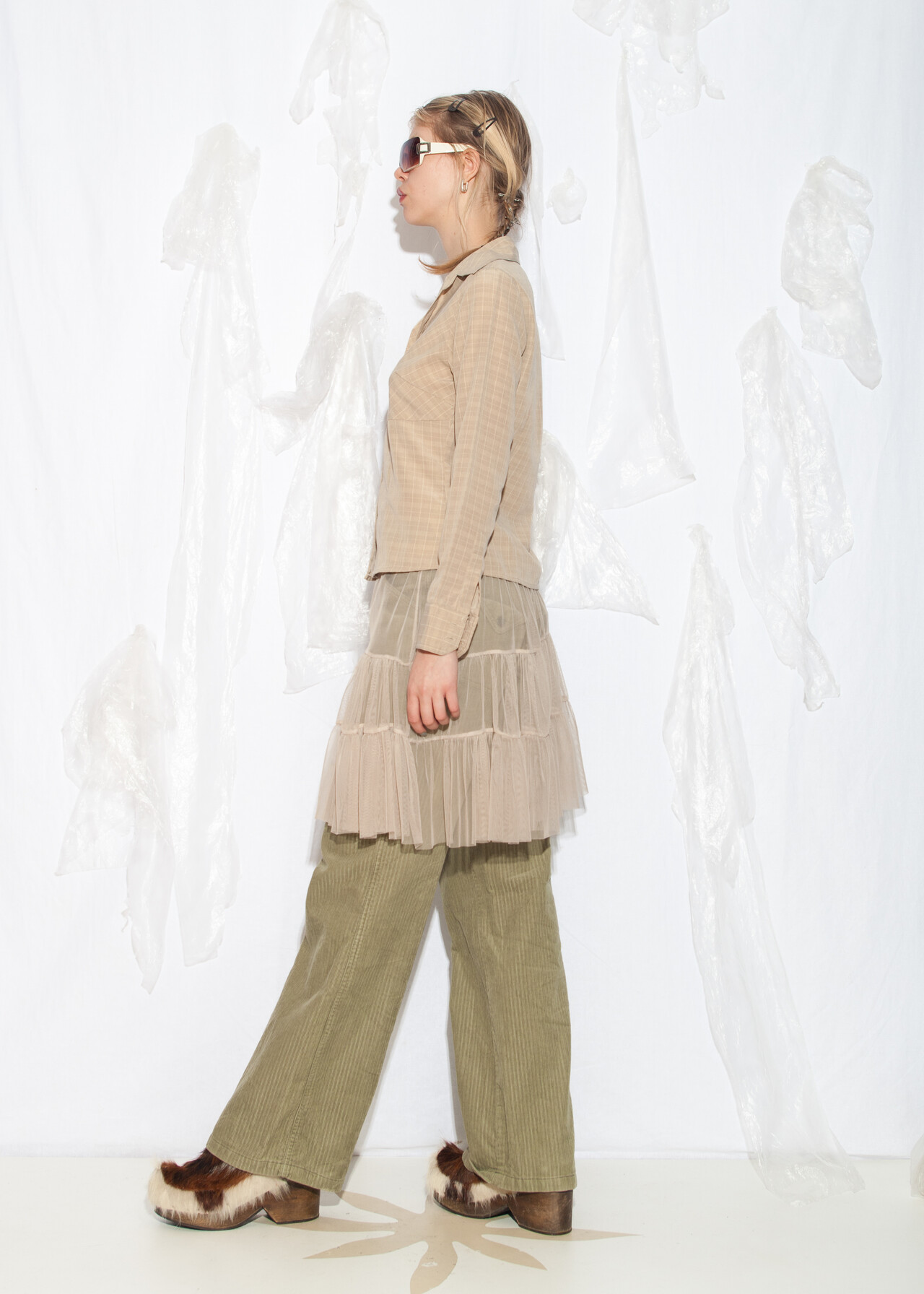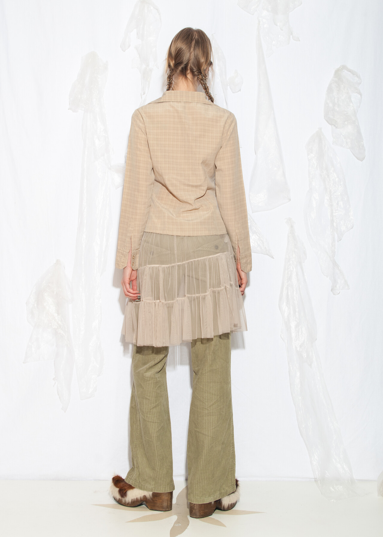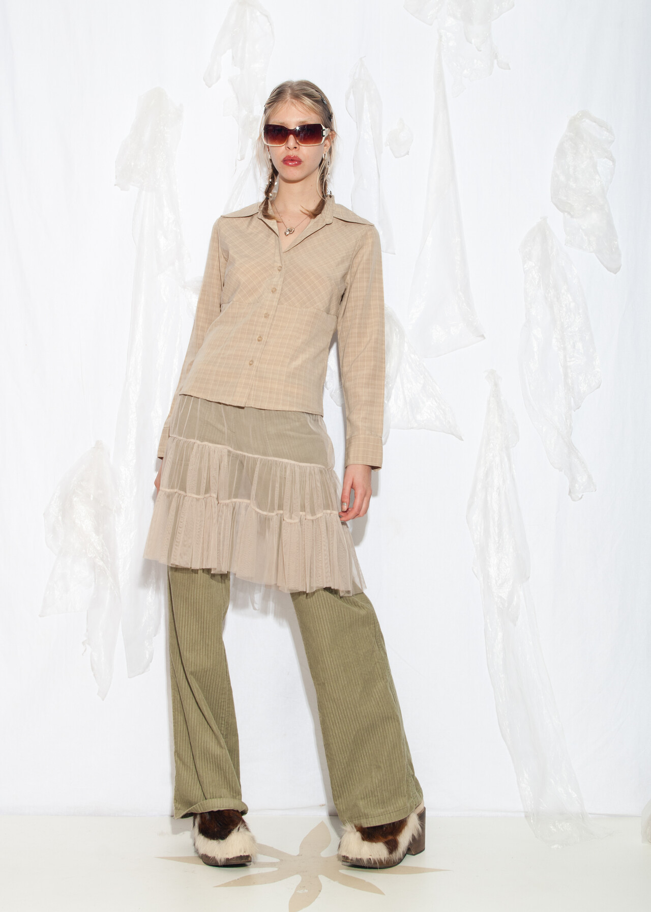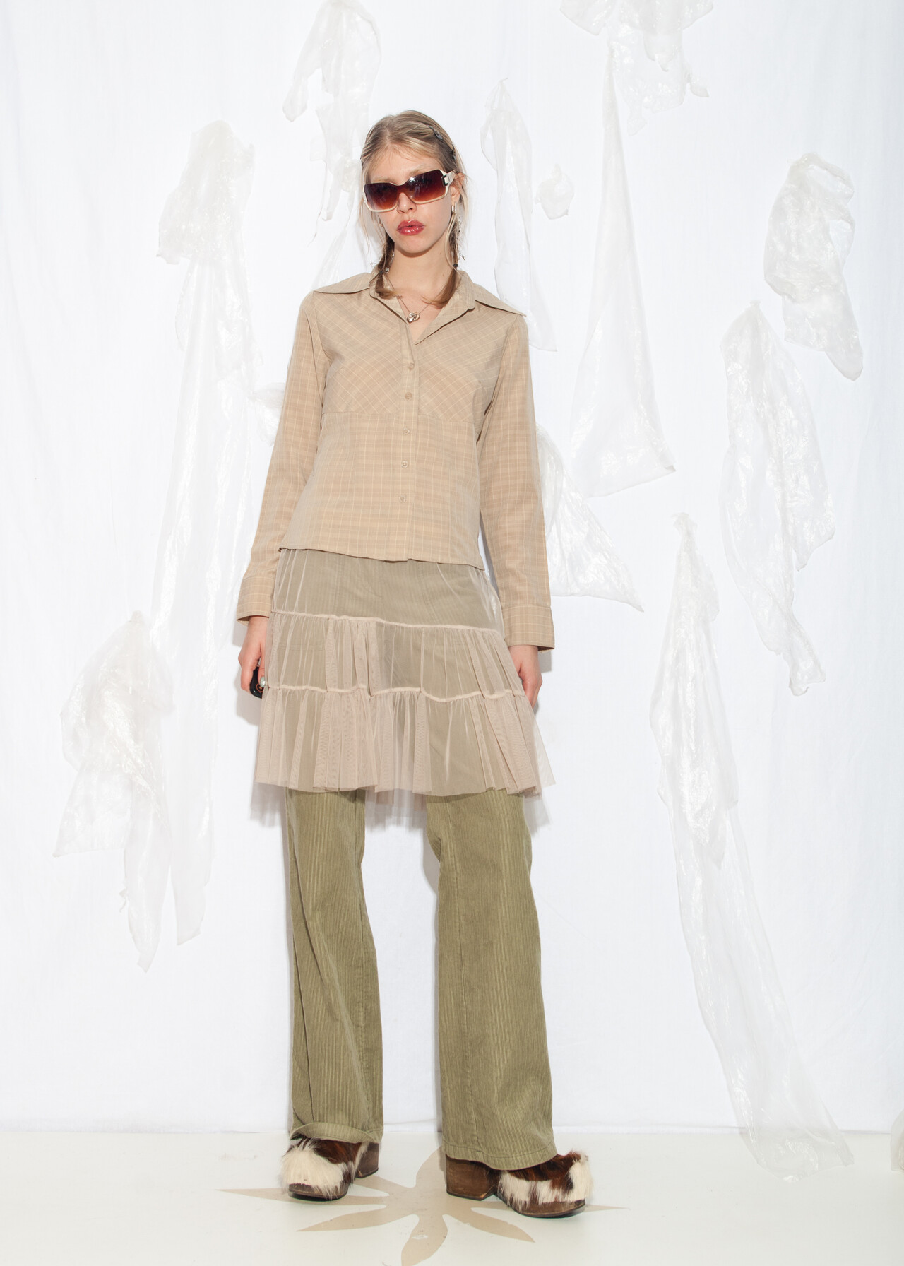 Tags: 2000s style clothing, beige plaid shirt, business casual, European vintage, minimalist look, office siren, officecore, slim fit blouse, y2k grunge outfit, y2k vintage fashion