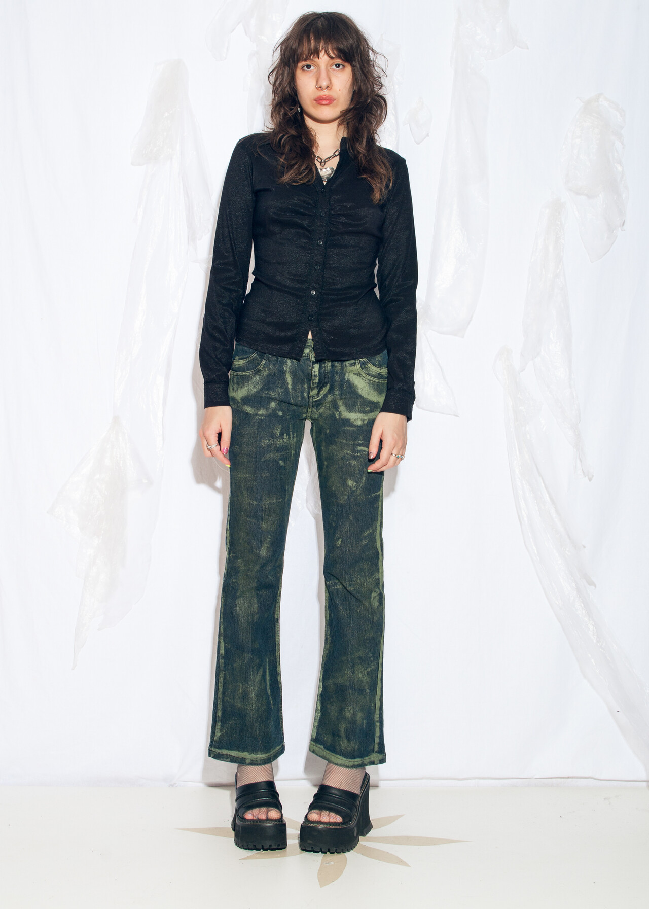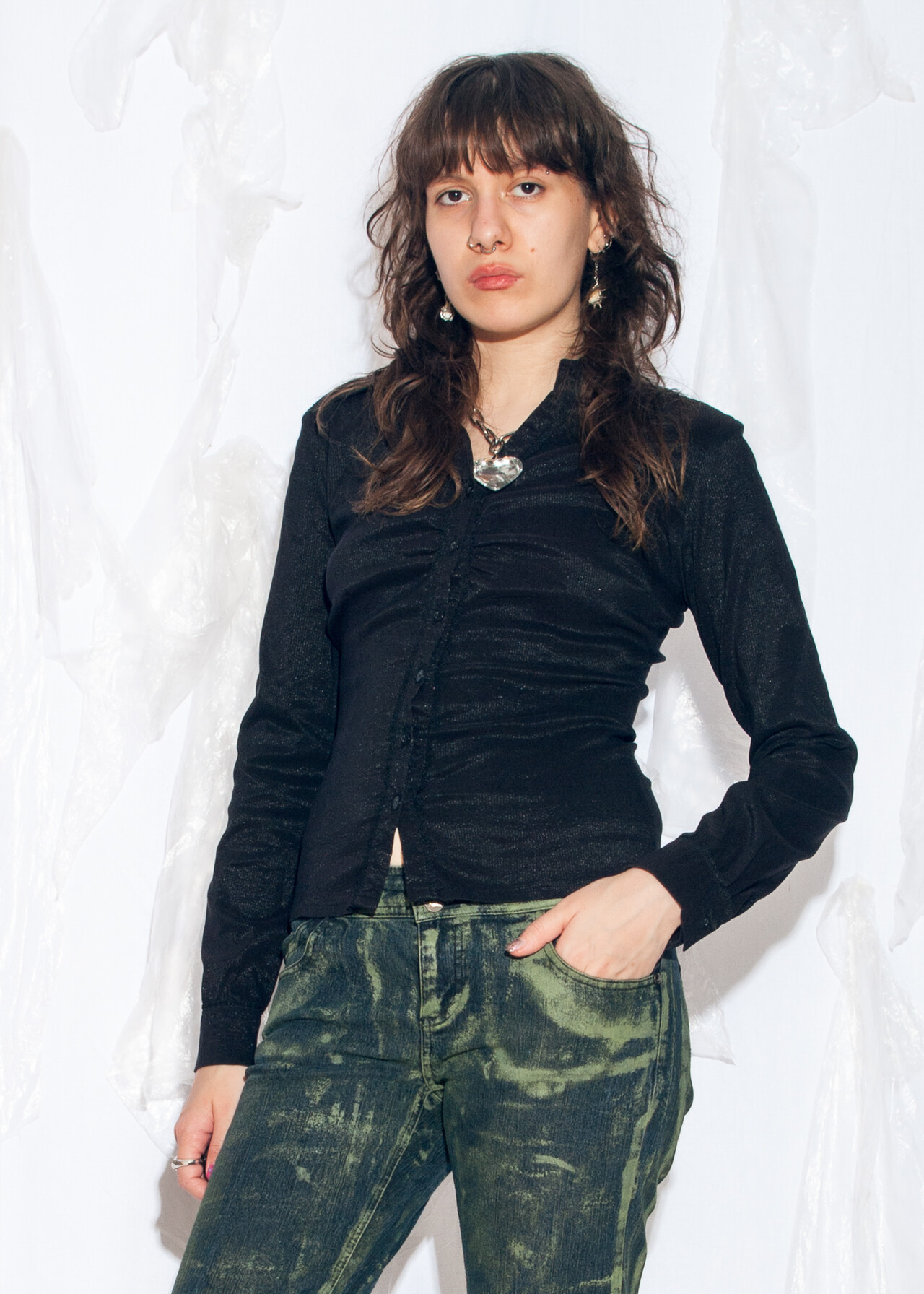 Tags: 2000s style clothing, black glam shirt, fitted shirt, office siren, ruched black top, slim fit blouse, y2k grunge outfit, y2k vintage fashion