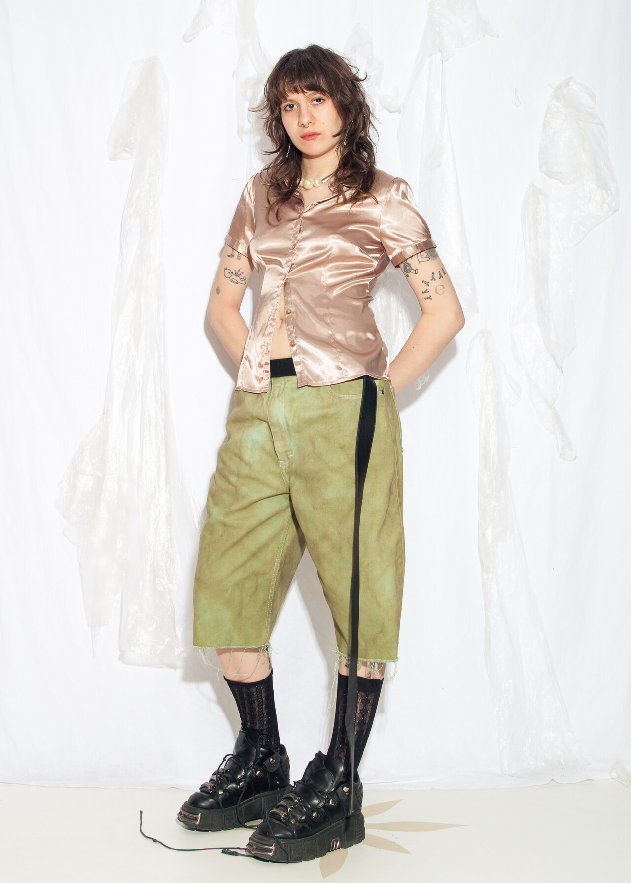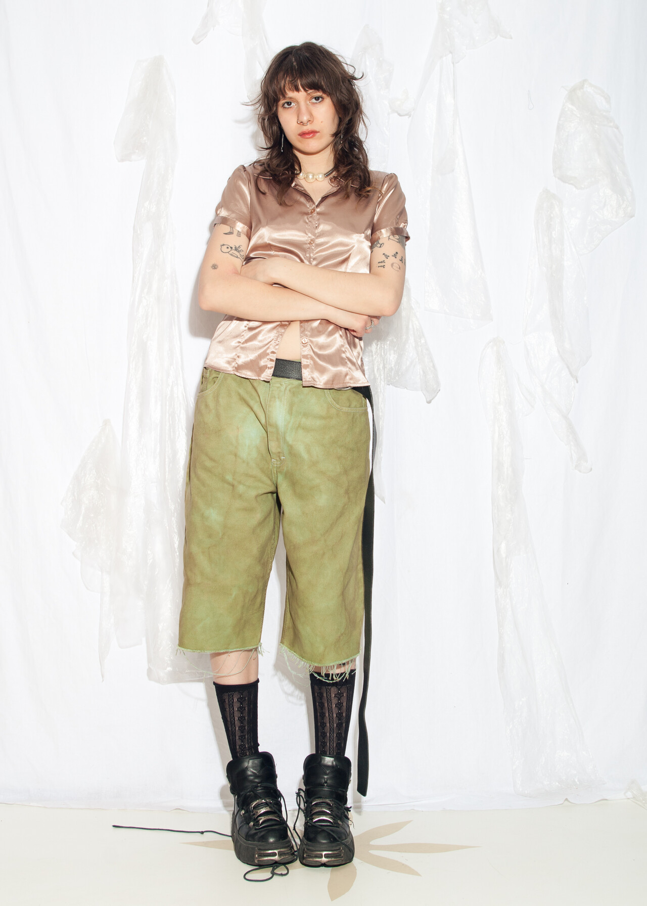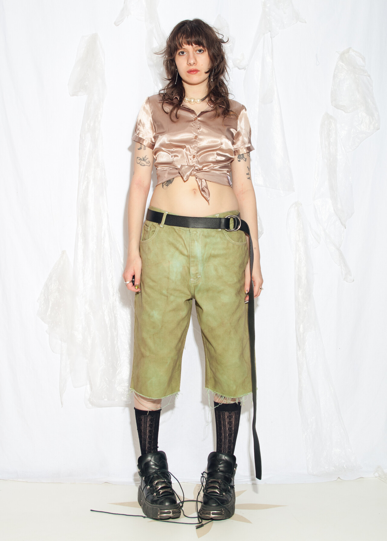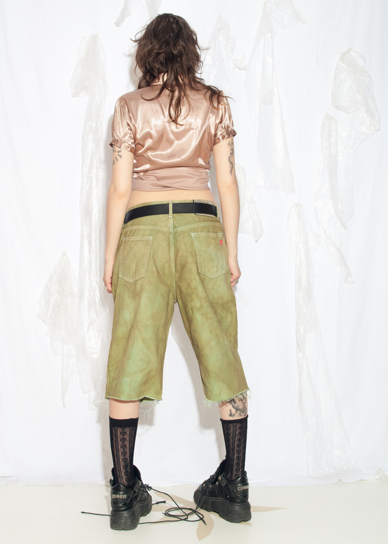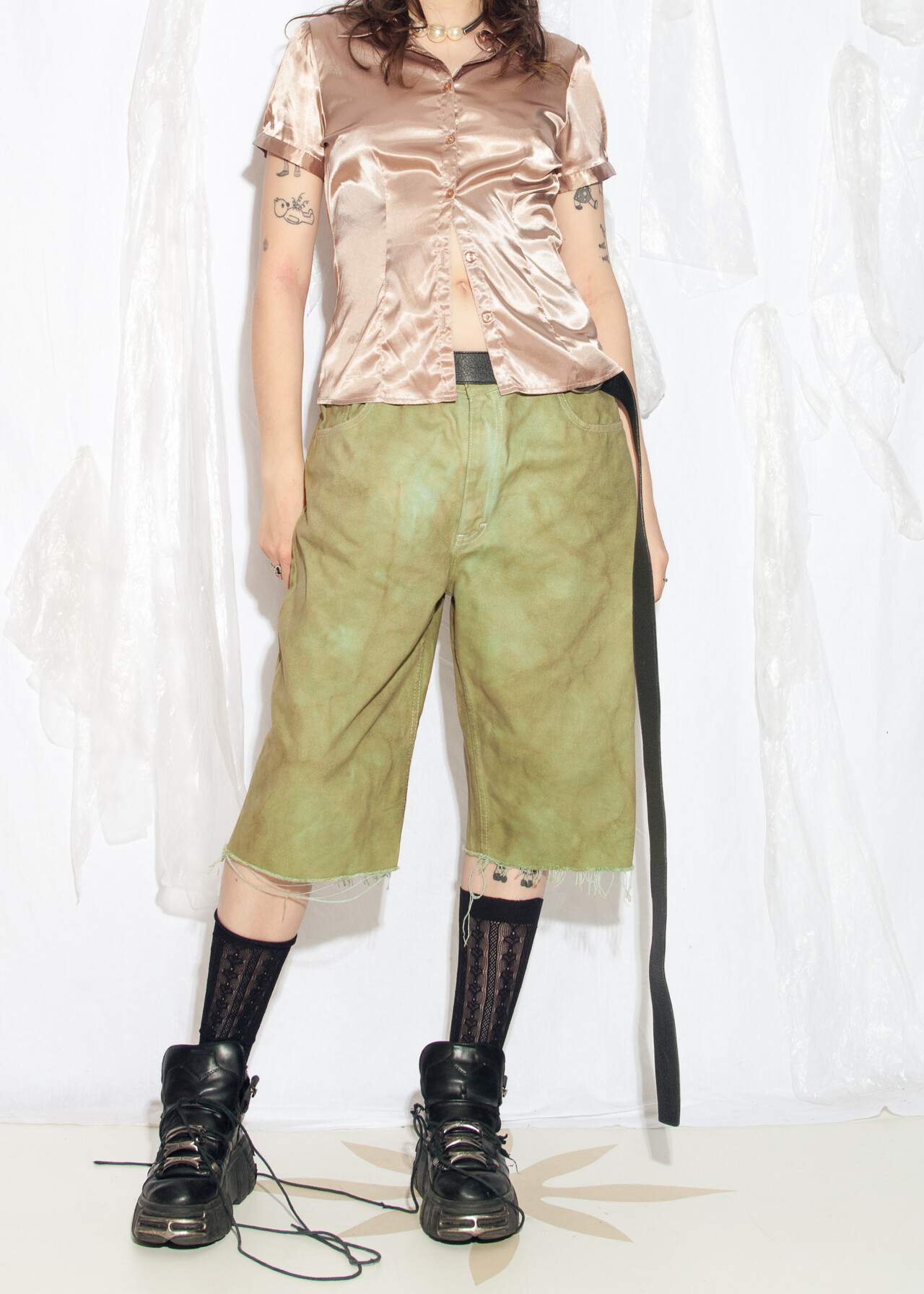 90s vintage wide-leg denim jorts – these green wonders are your ticket to a world where tie-dye was king and every day was a grunge fashion show.
