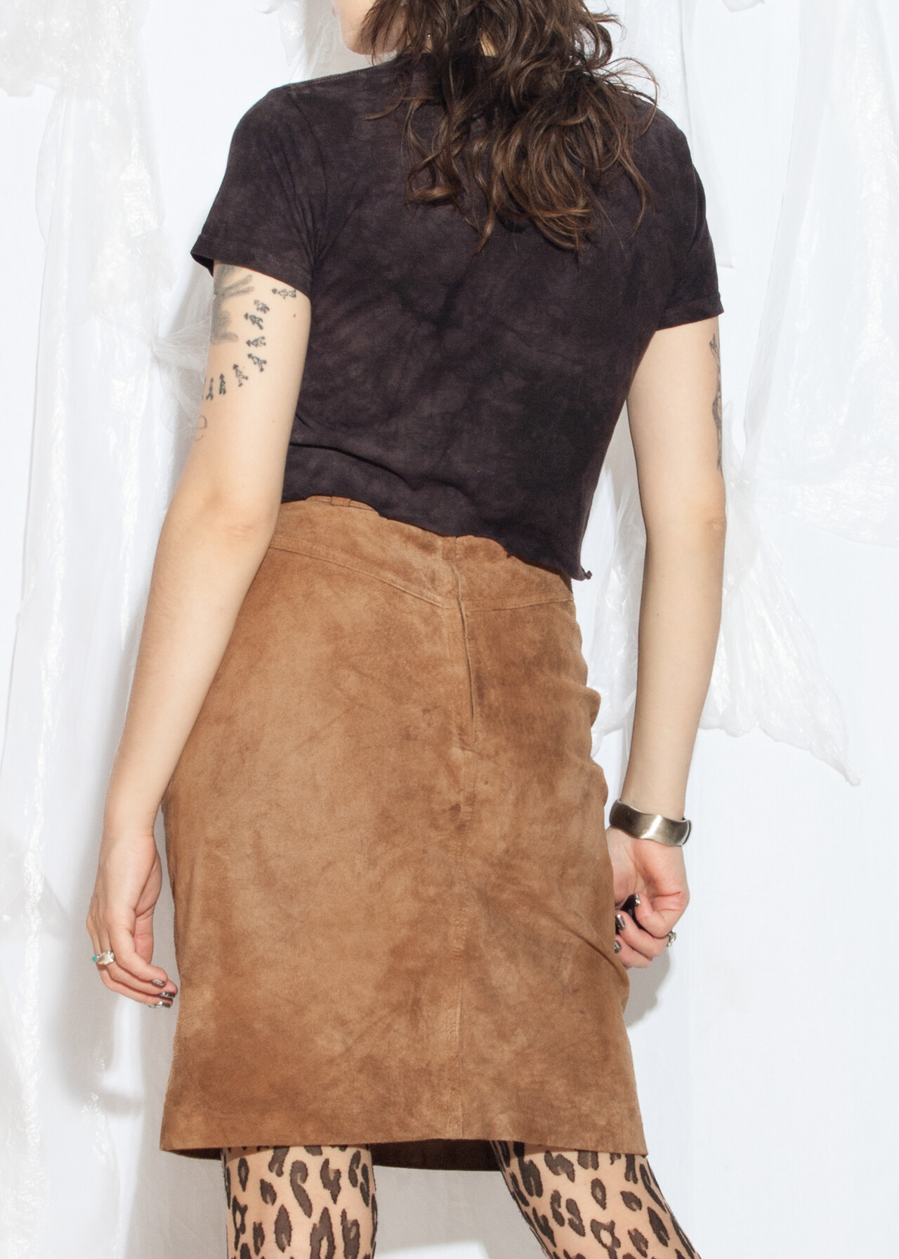 This 80s vintage brown suede midi skirt is the high-waisted hug your grunge outfit has been craving.
