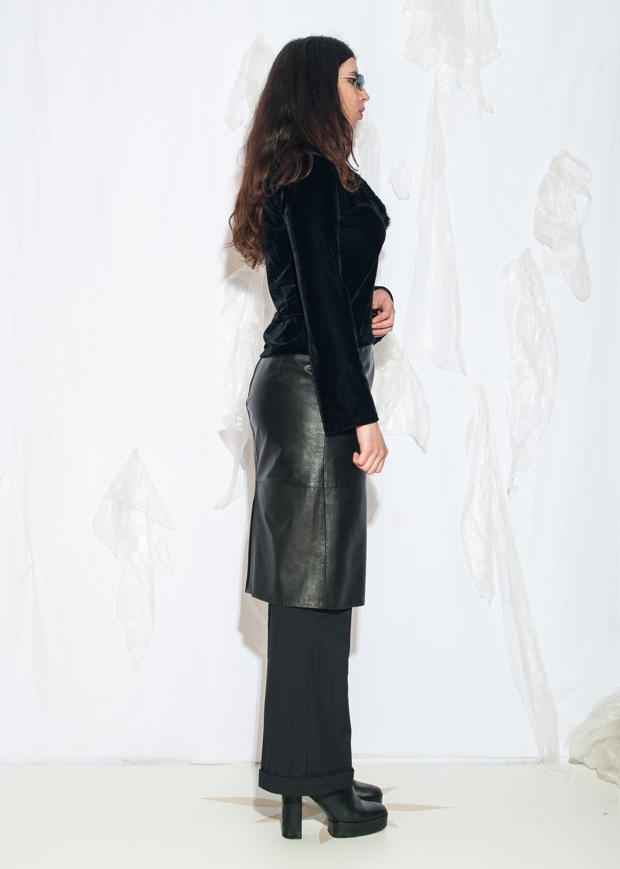 This 90s vintage skirt from the Chalice Collection is a minimalist, real leather gem that’s here to prove middle rise waistlines are cooler than your dad’s dance moves.