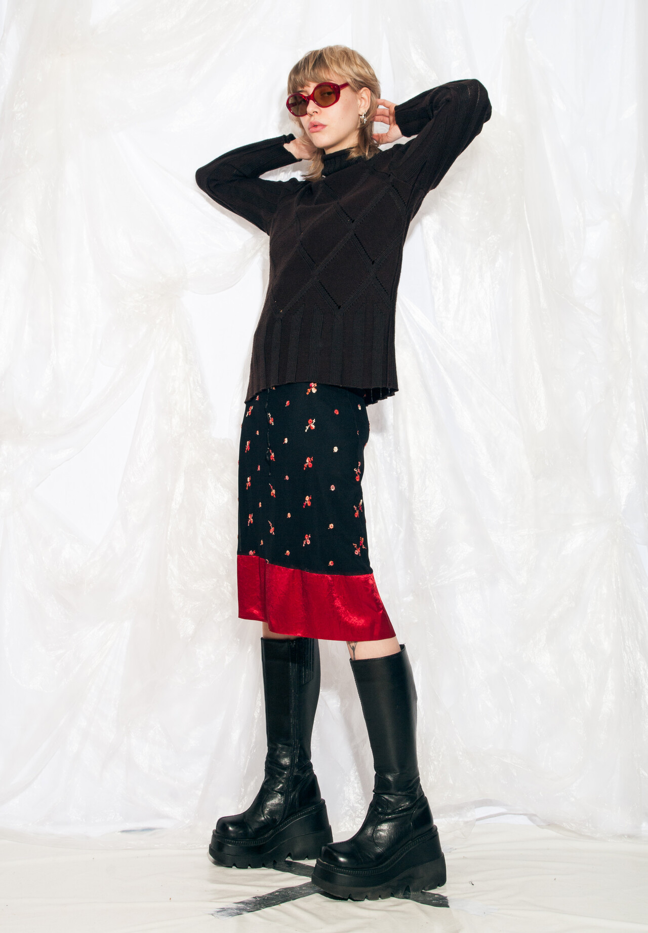 A Y2K vintage midi skirt in excellent condition. It’s made of flower-embroidered mesh with a satin hem and black lining and has a stretchy waist. Recommended size: EU 38-40.