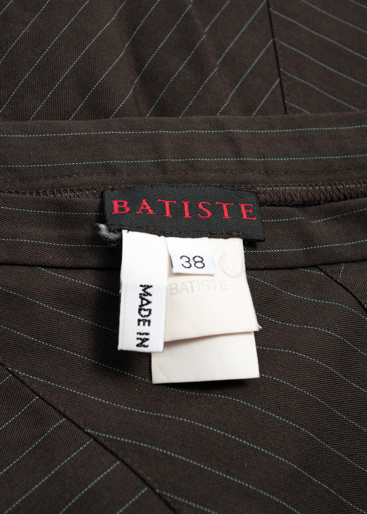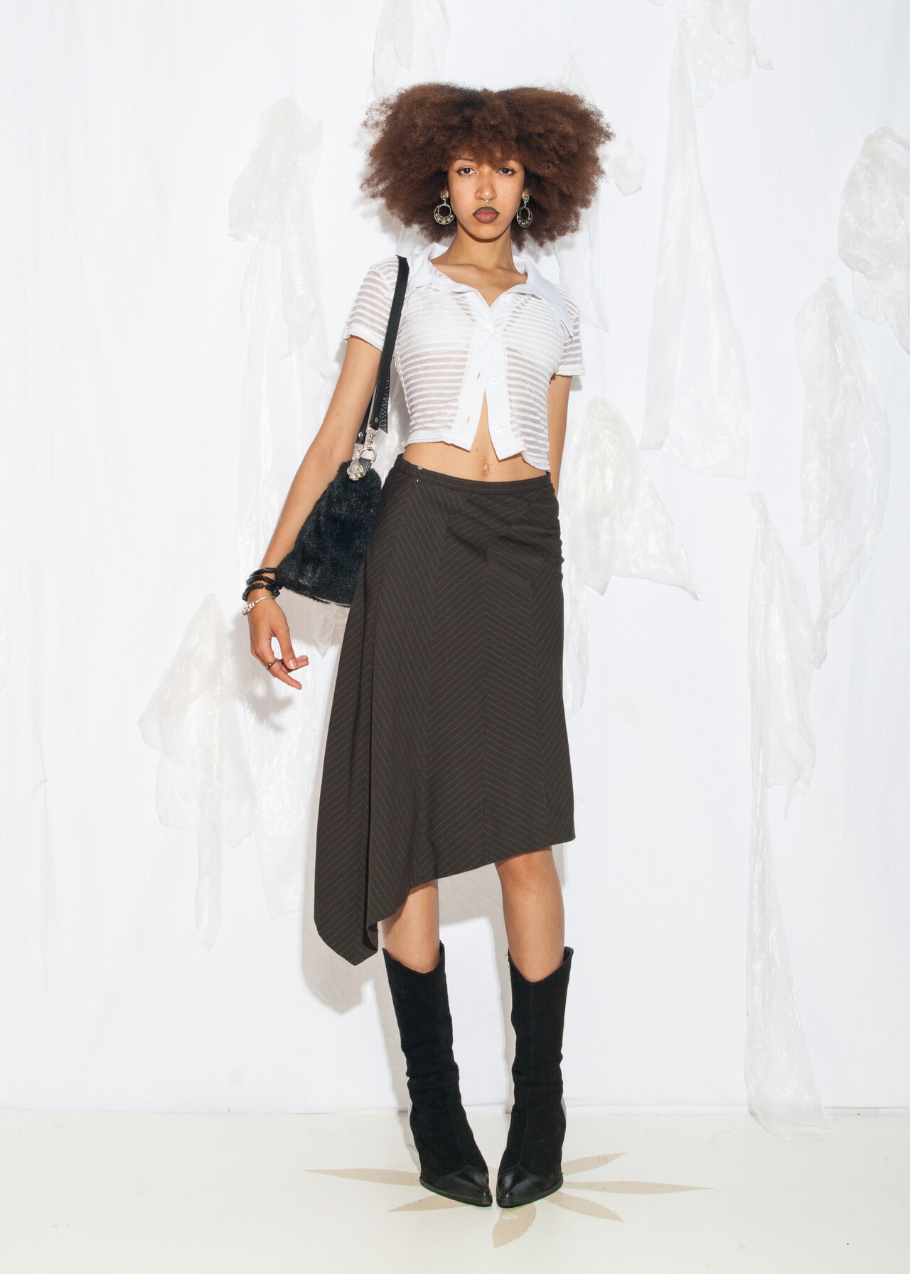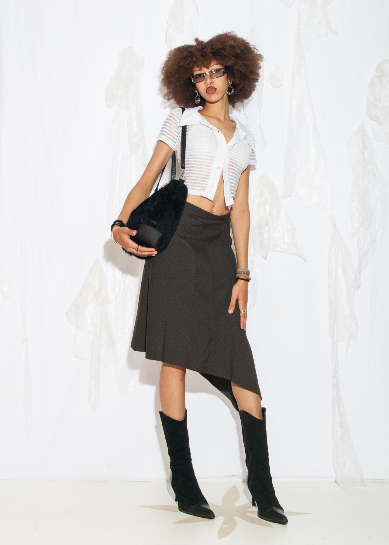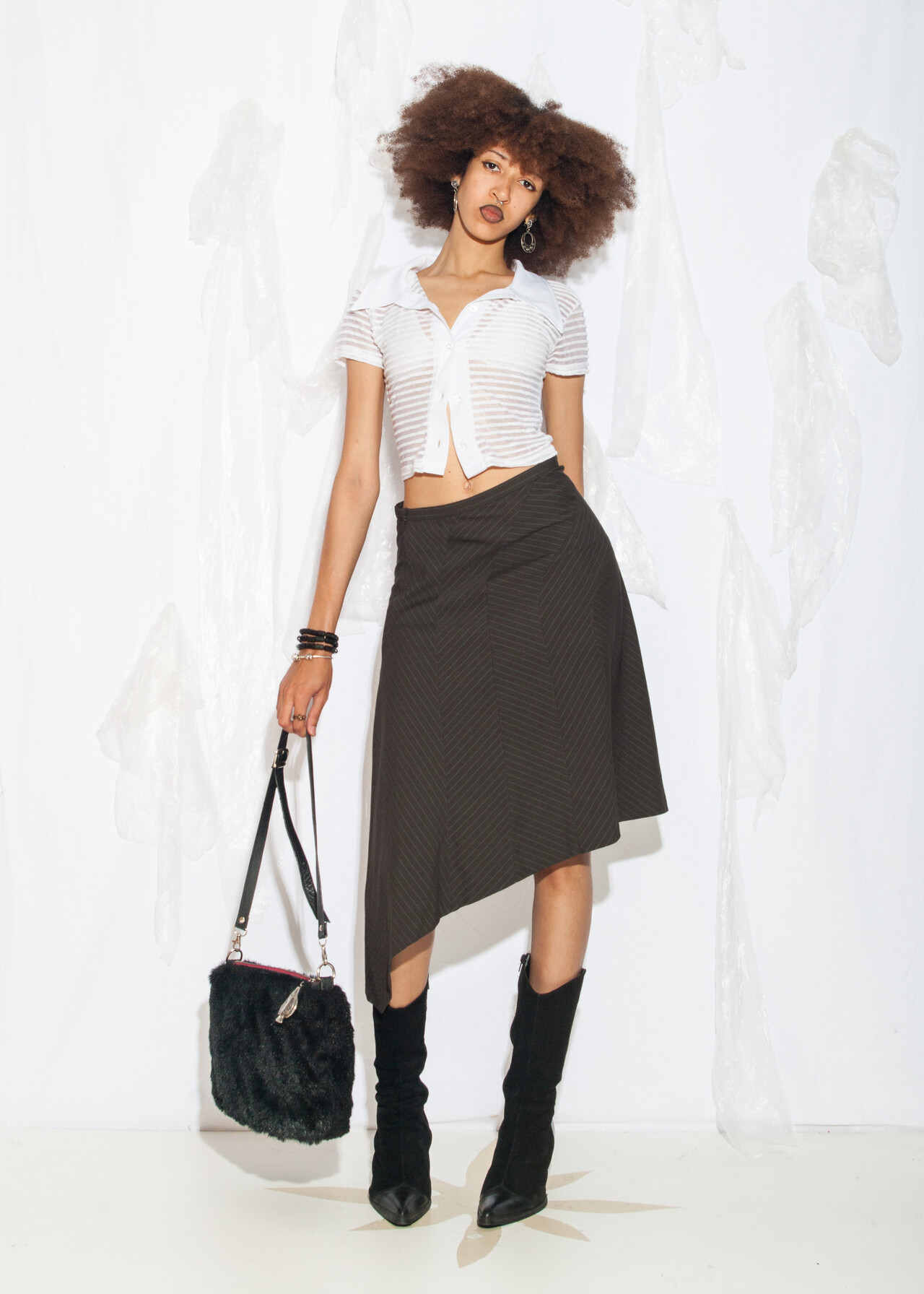 Batiste’s Y2K vintage skirt is the business casual friend you never knew you needed, ready to strut from office siren mode straight into the early 2000s time warp with its asymmetric hem and wool blend charm!