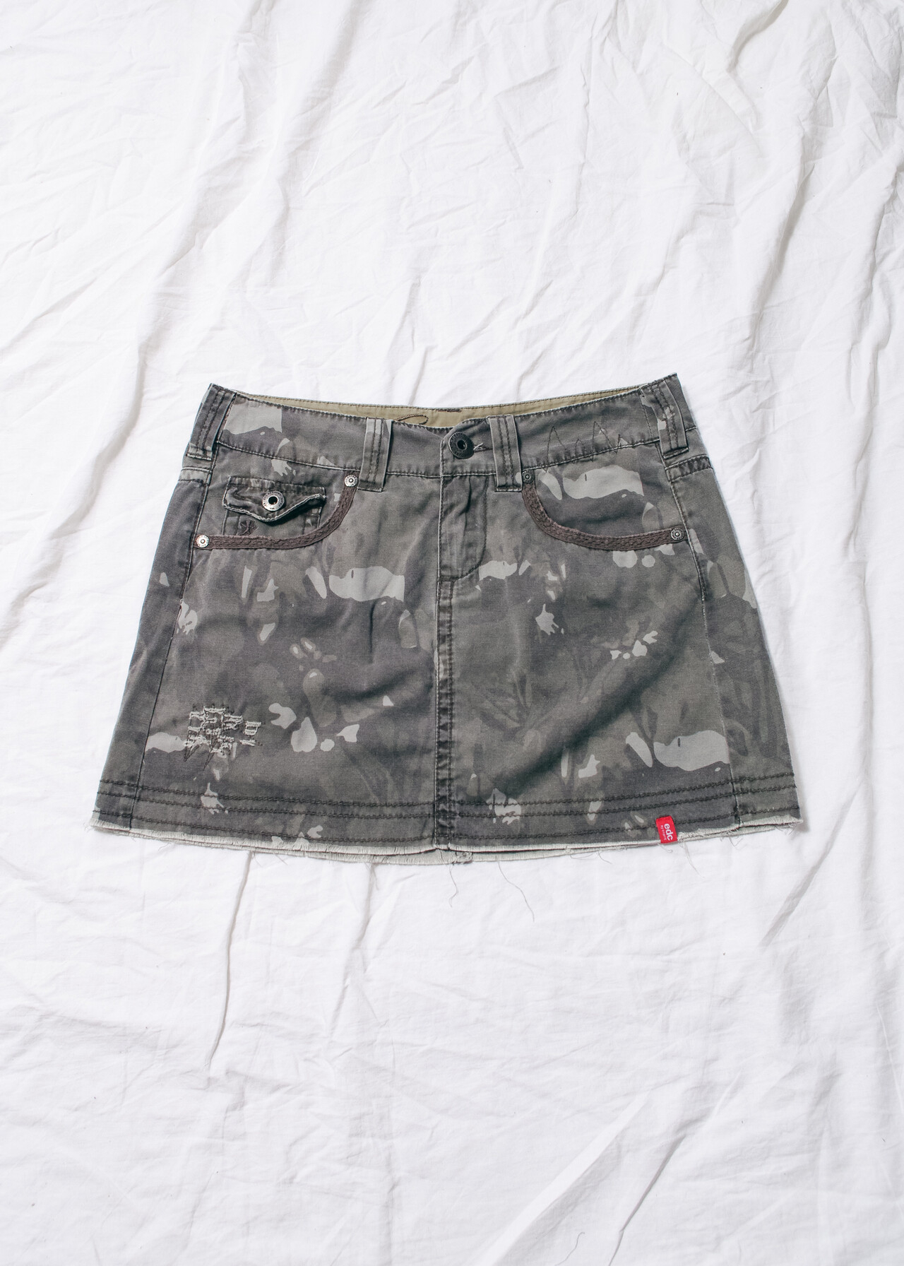 This Y2K vintage skirt in camo military print is your ticket to the early 2000s, when low-rise waists were the real MVPs and showing a bit of midriff was practically a rite of passage.