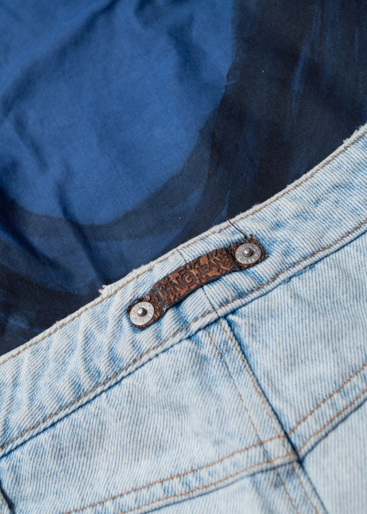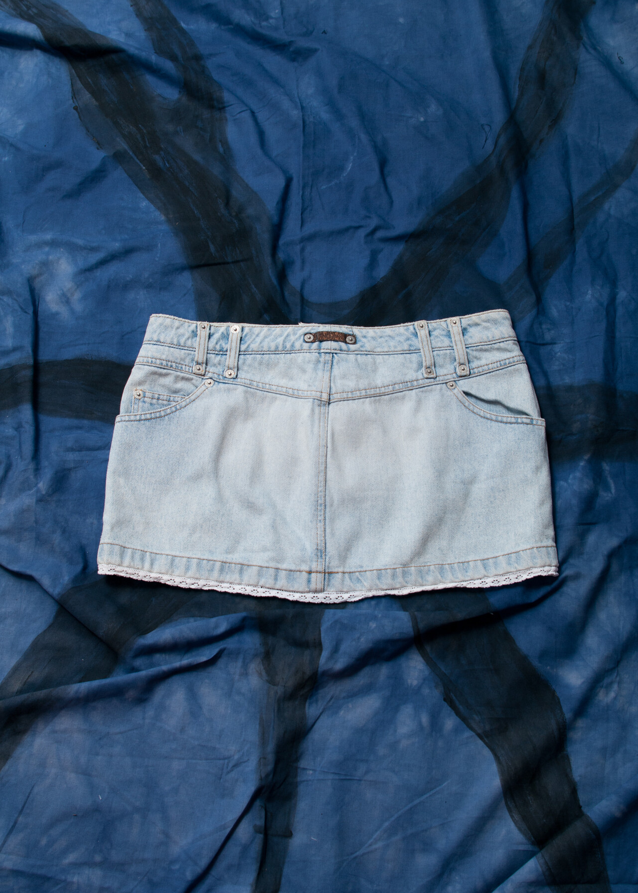 This Y2K vintage denim micro skirt with a lace hem is your ticket to strutting like it’s 2003 and you’re the star of your own reality show.