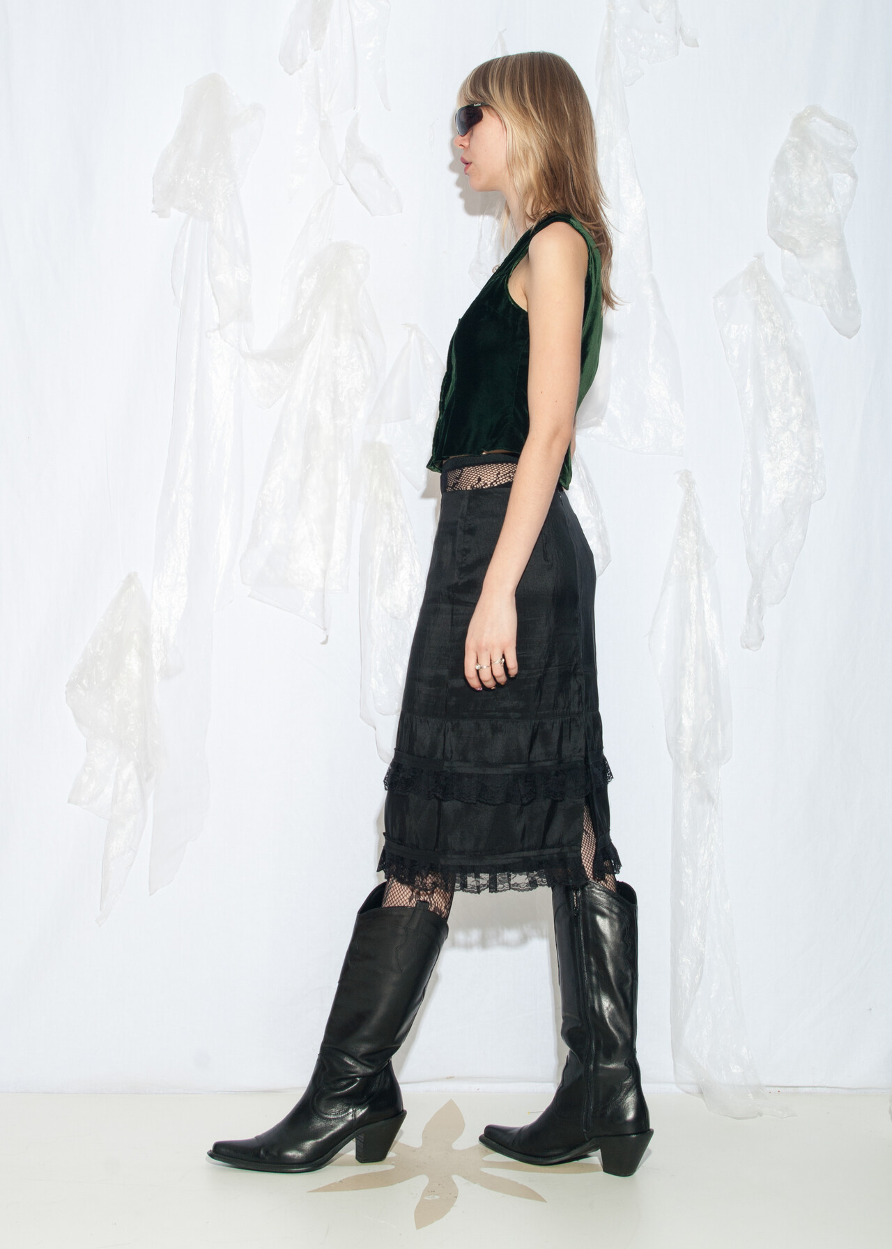 Tags: 2000s vintage fashion, European vintage, goth vampire look, lace skirt, low rise midi, low waisted bottoms, whimsical gothic, whimsigoth, y2k grunge outfit, y2k style clothing