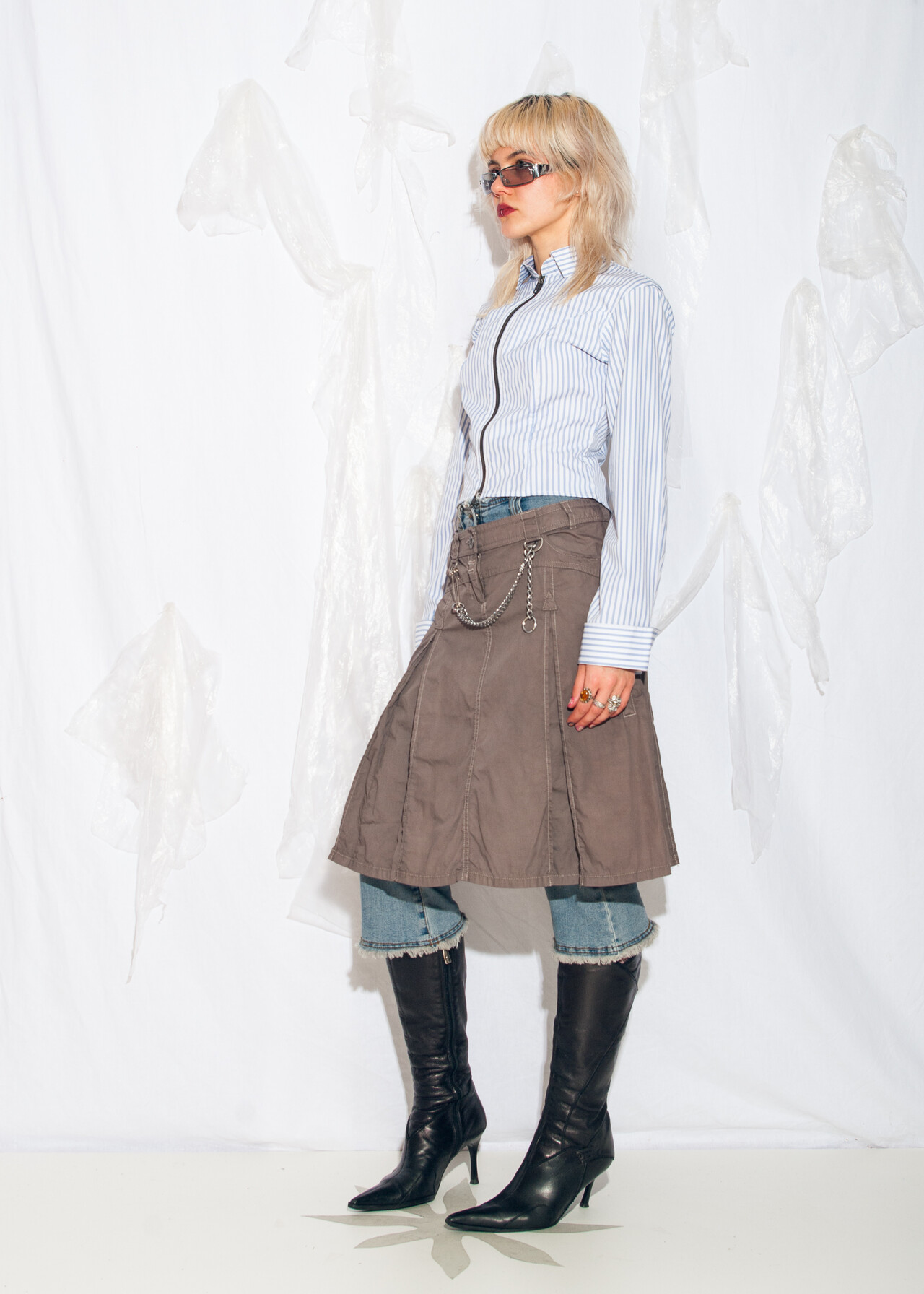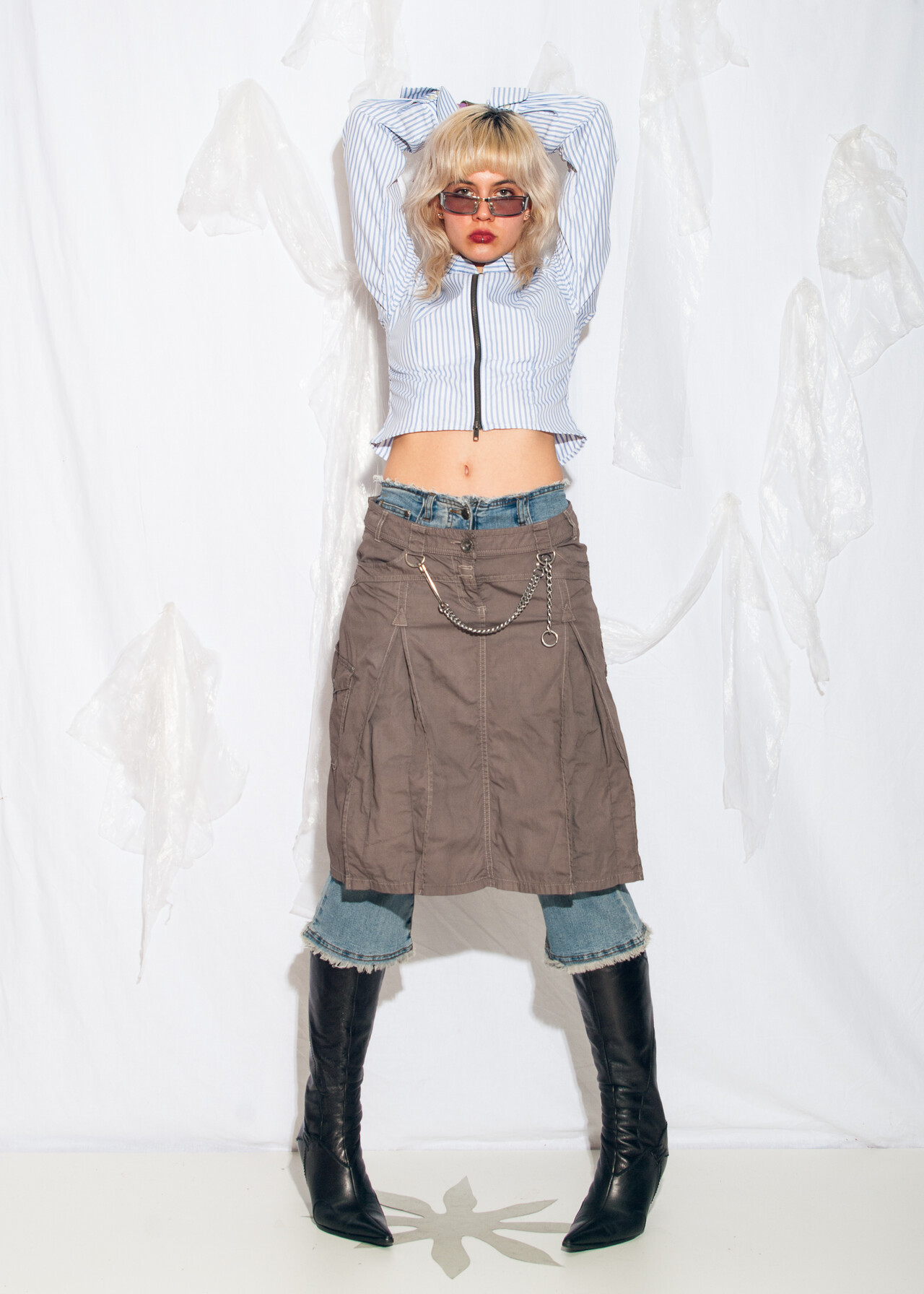 Y2K low rise grunge chain skirt – this cargo midi masterpiece is ready to whisk you back to the days when your biggest dilemma was choosing between brown and grey for the ultimate 2000s style statement.