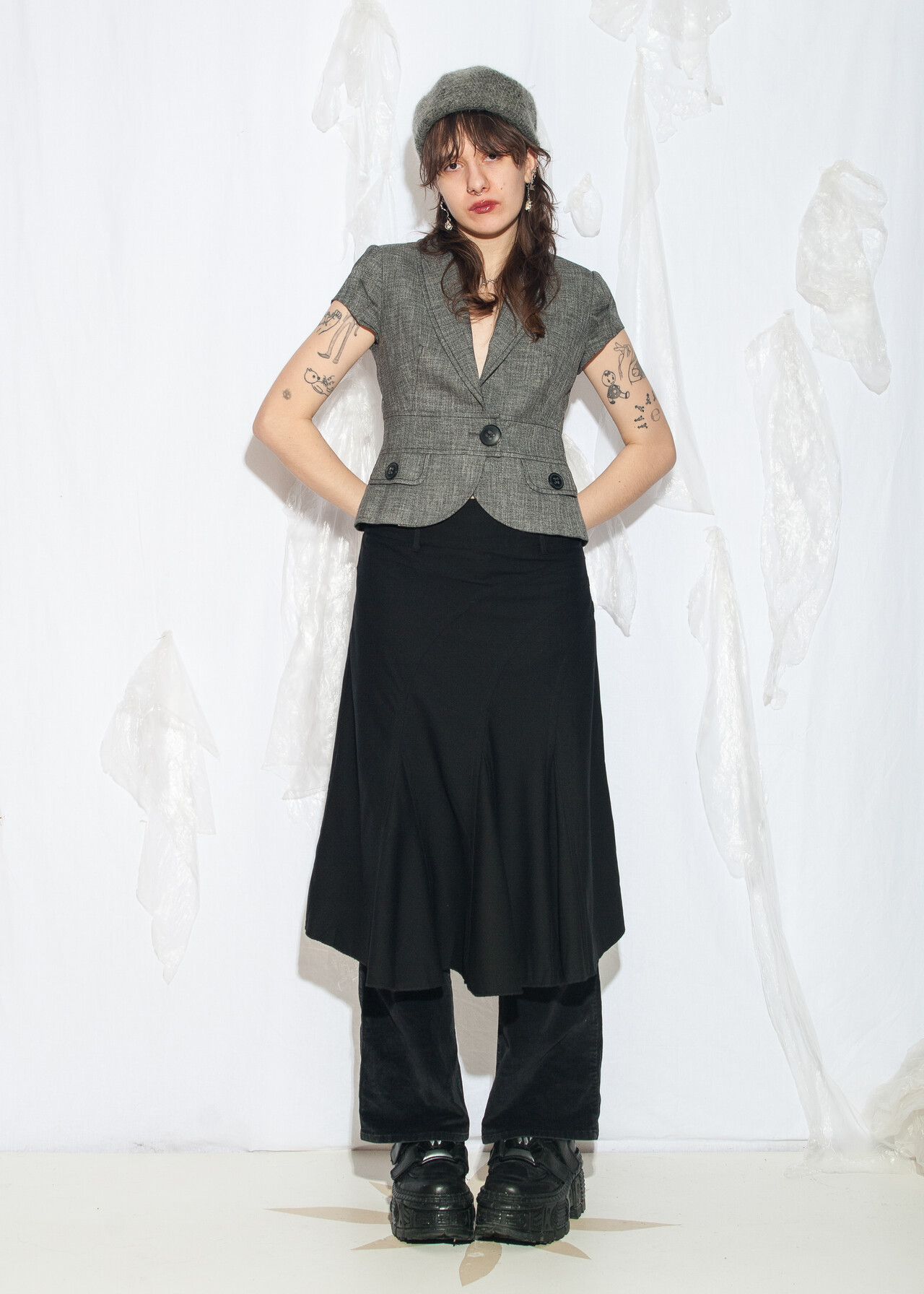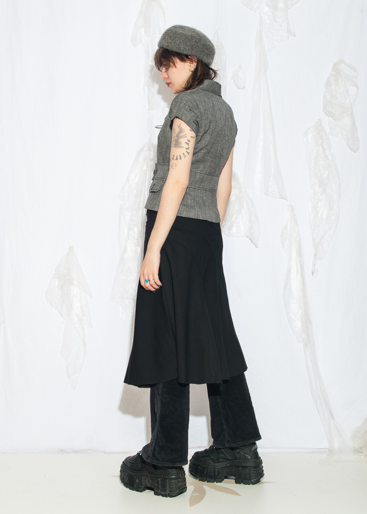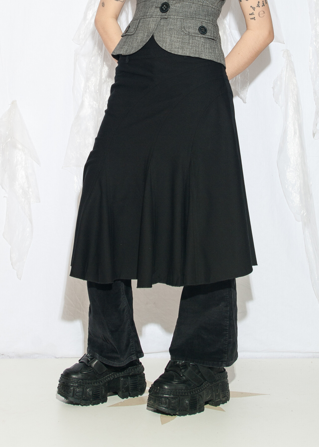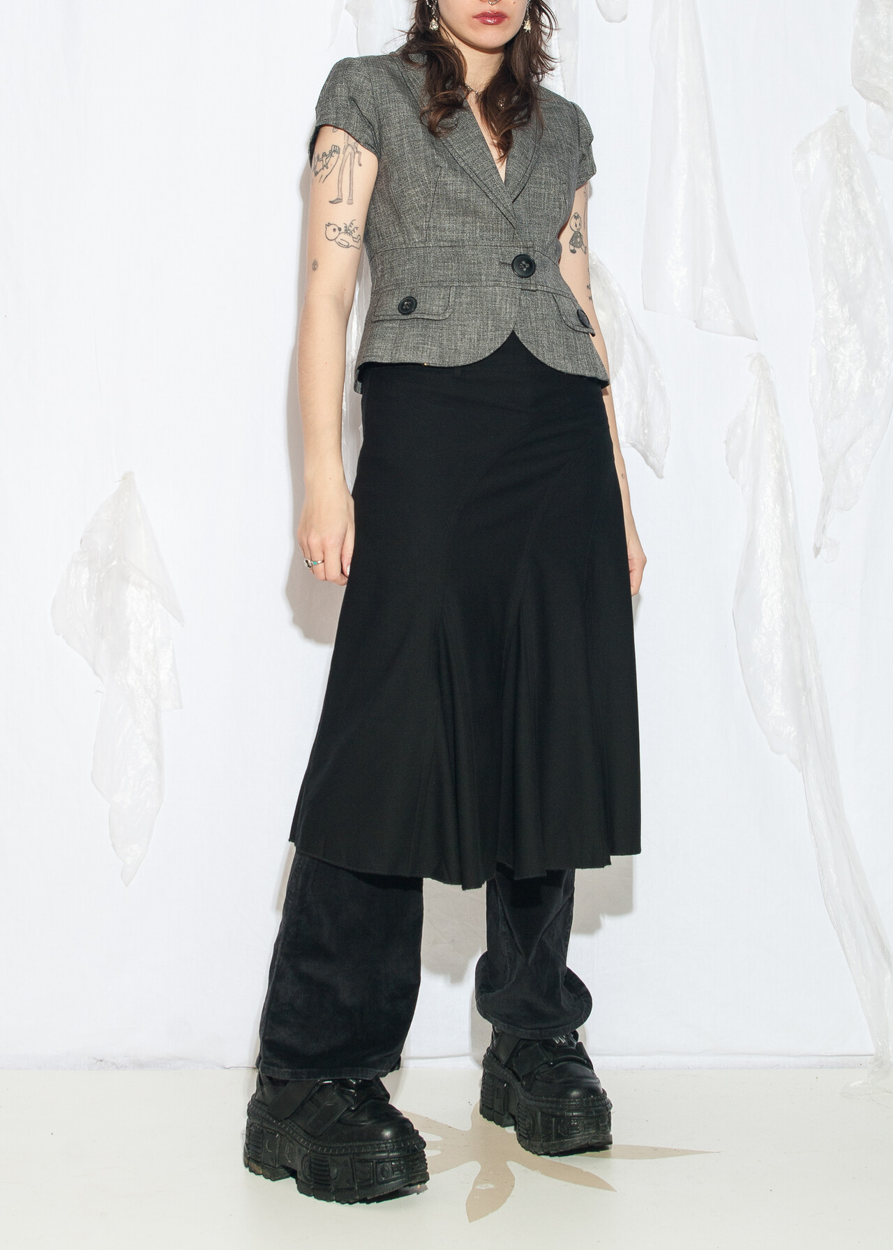 Tags: 2000s style fashion, frilly midi skirt, grunge outfit, middle rise waist, minimalist look, office siren, whimsigoth, y2k vintage clothing