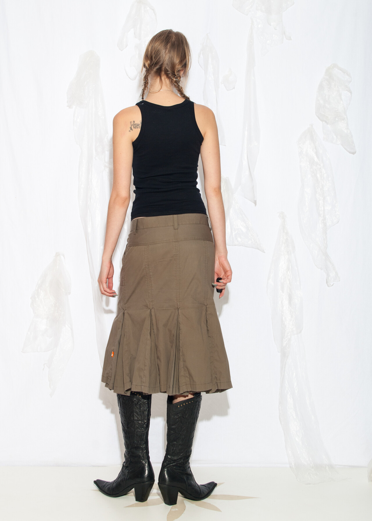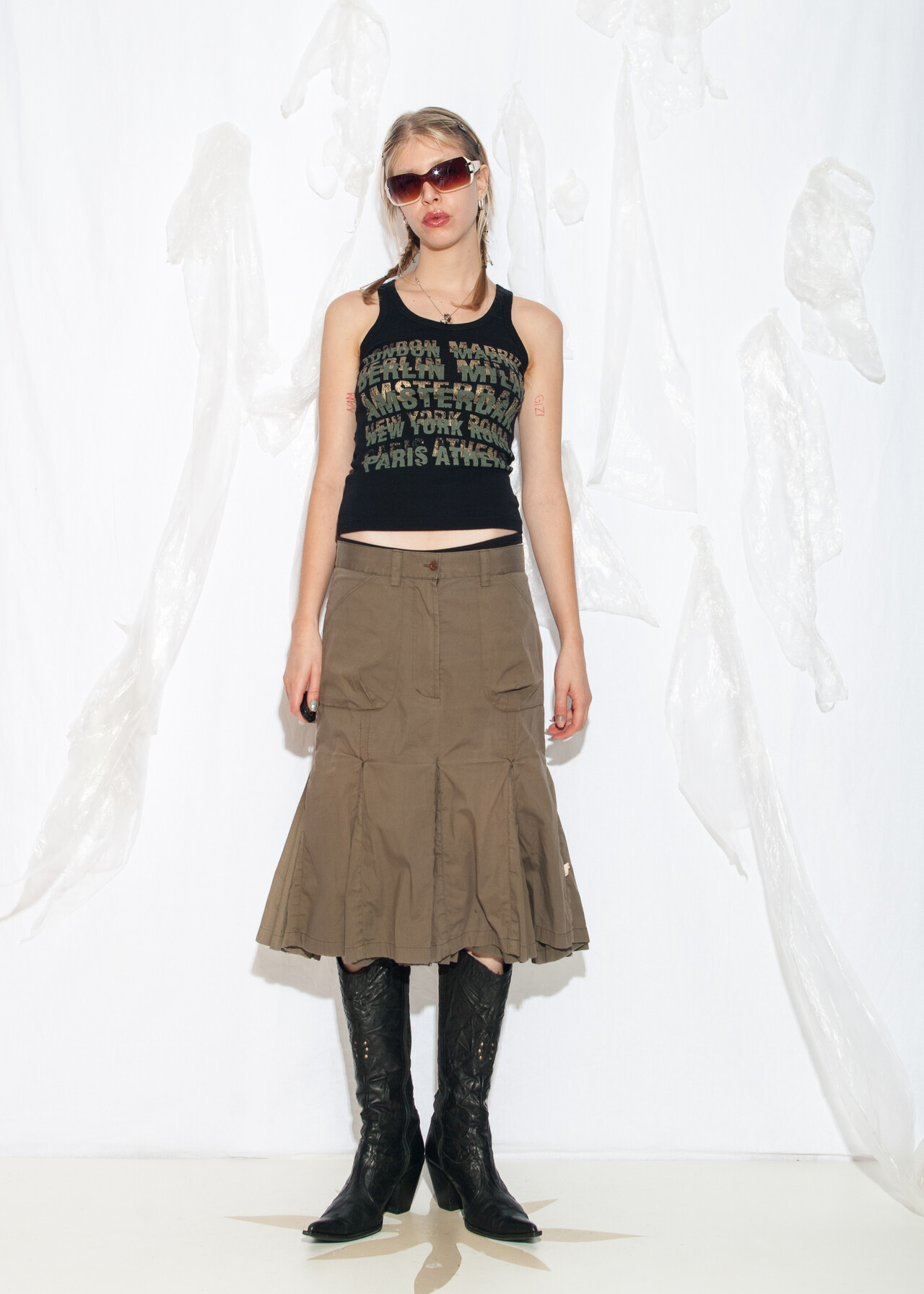 Tags: 2000s style clothing, cotton midi skirt, cyber grunge outfit, frilly skirt, khaki cargo, low rise bottom, low waisted skirt, whimsigoth aesthetic, y2k vintage fashion