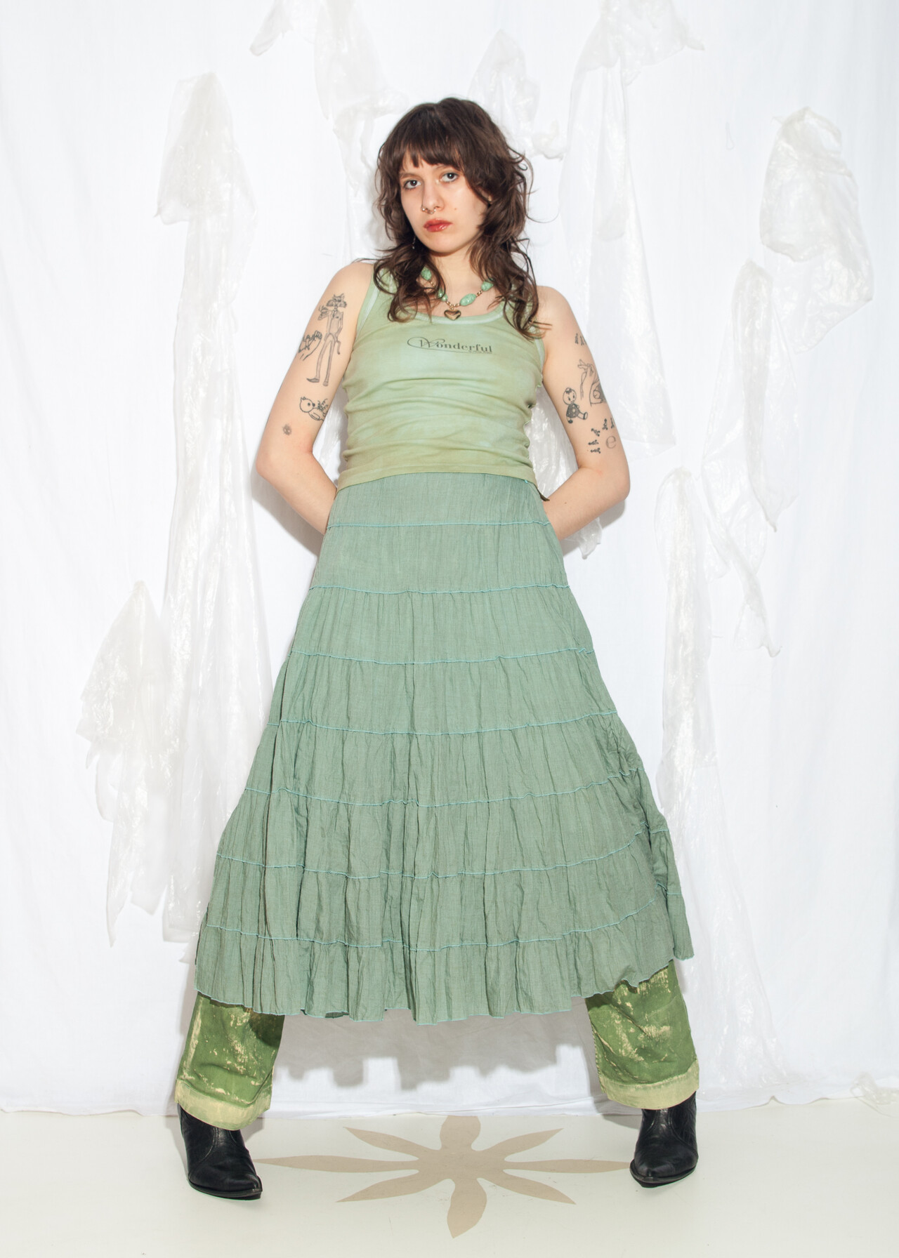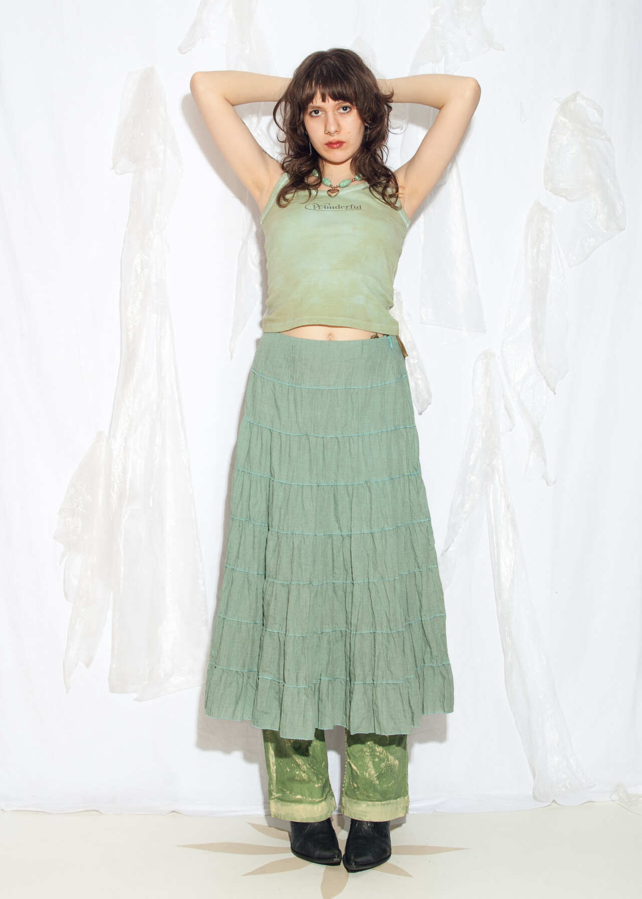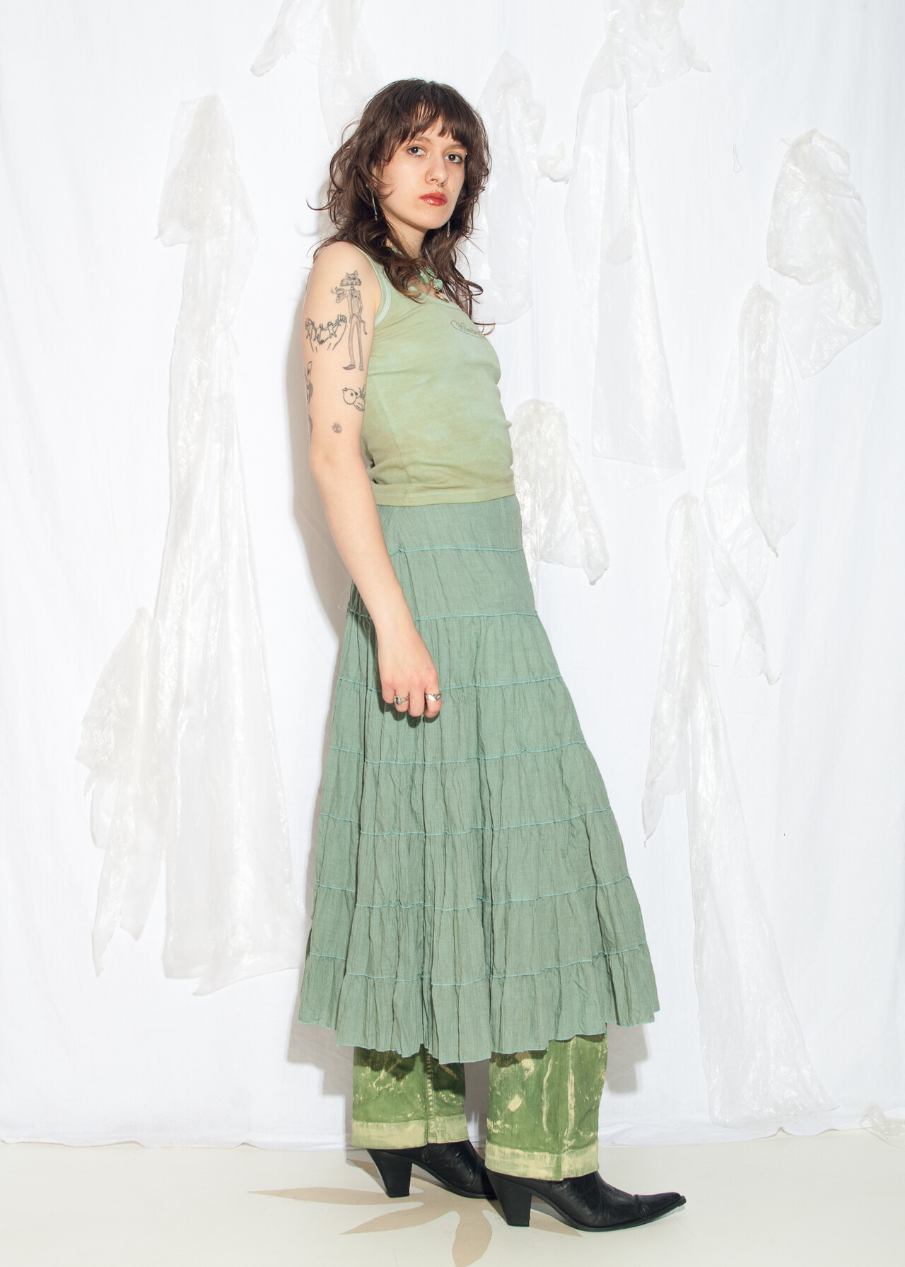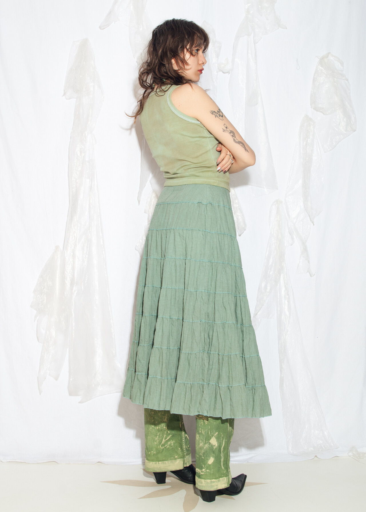 Tags: 2000s style clothing, layered midi skirt, low rise waist, tiered maxi skirt, whimsigoth, y2k vintage fashion