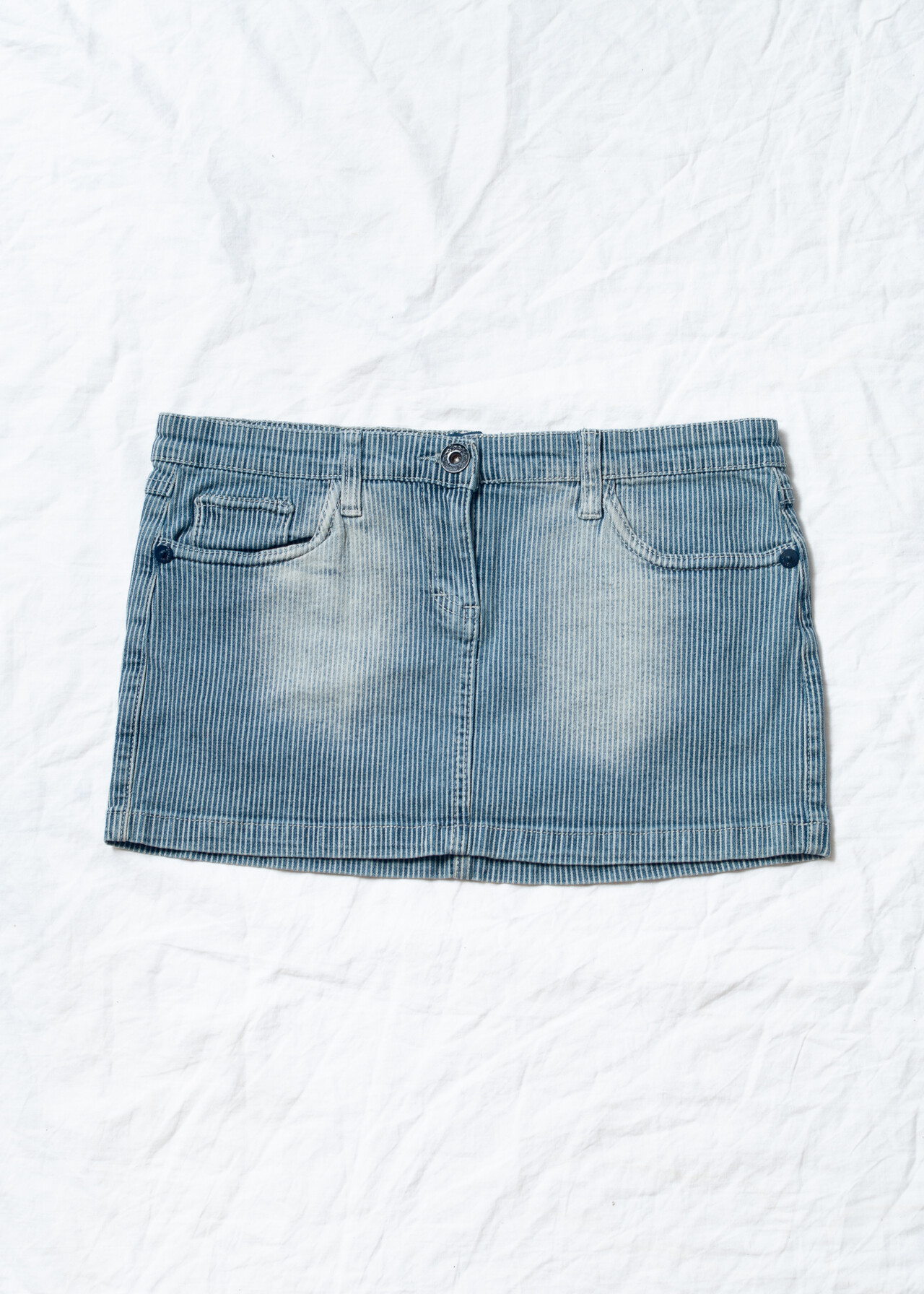 Tags: 00s streetwear, 2000s style clothing, denim micro skirt, jean skirt, light wash denim, low rise bottoms, low waisted skirt, mini jean skirt, stonewashed jeans, striped denim, whimsi twee, y2k grunge outfit, y2k vintage fashion