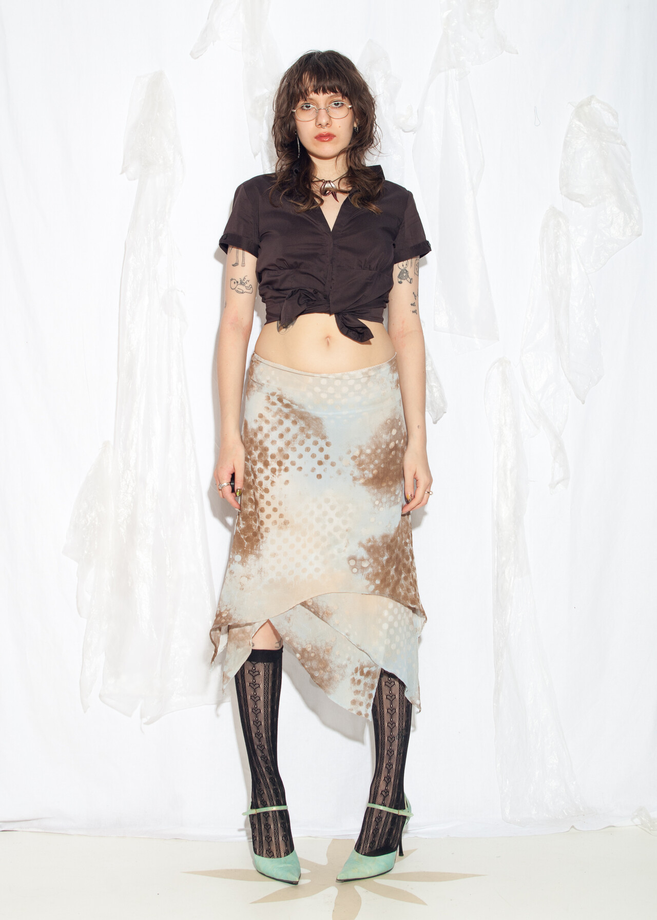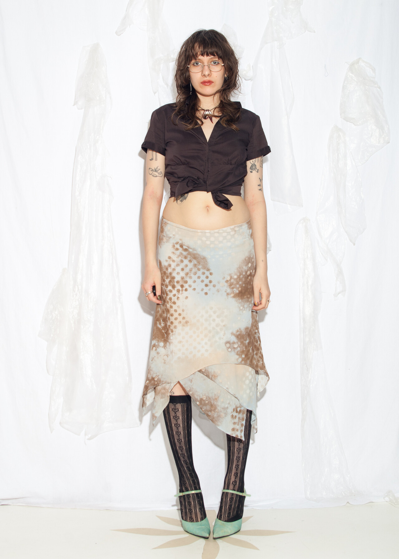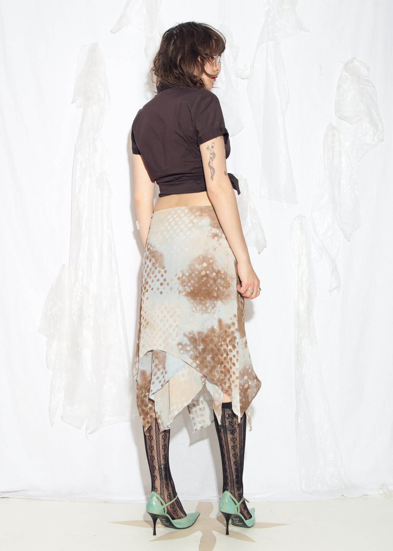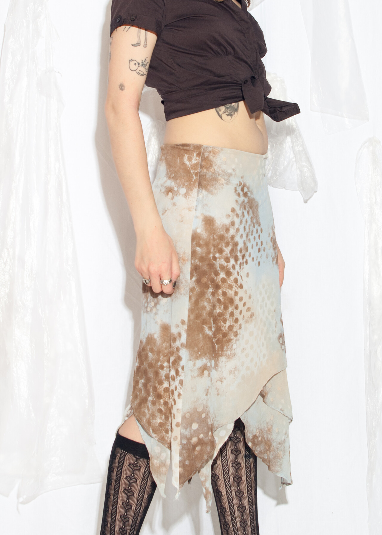 Tags: 2000s style clothing, asymmetric hem, fairycore, handkerchief skirt, low rise midi skirt, whimsigoth, y2k vintage fashion