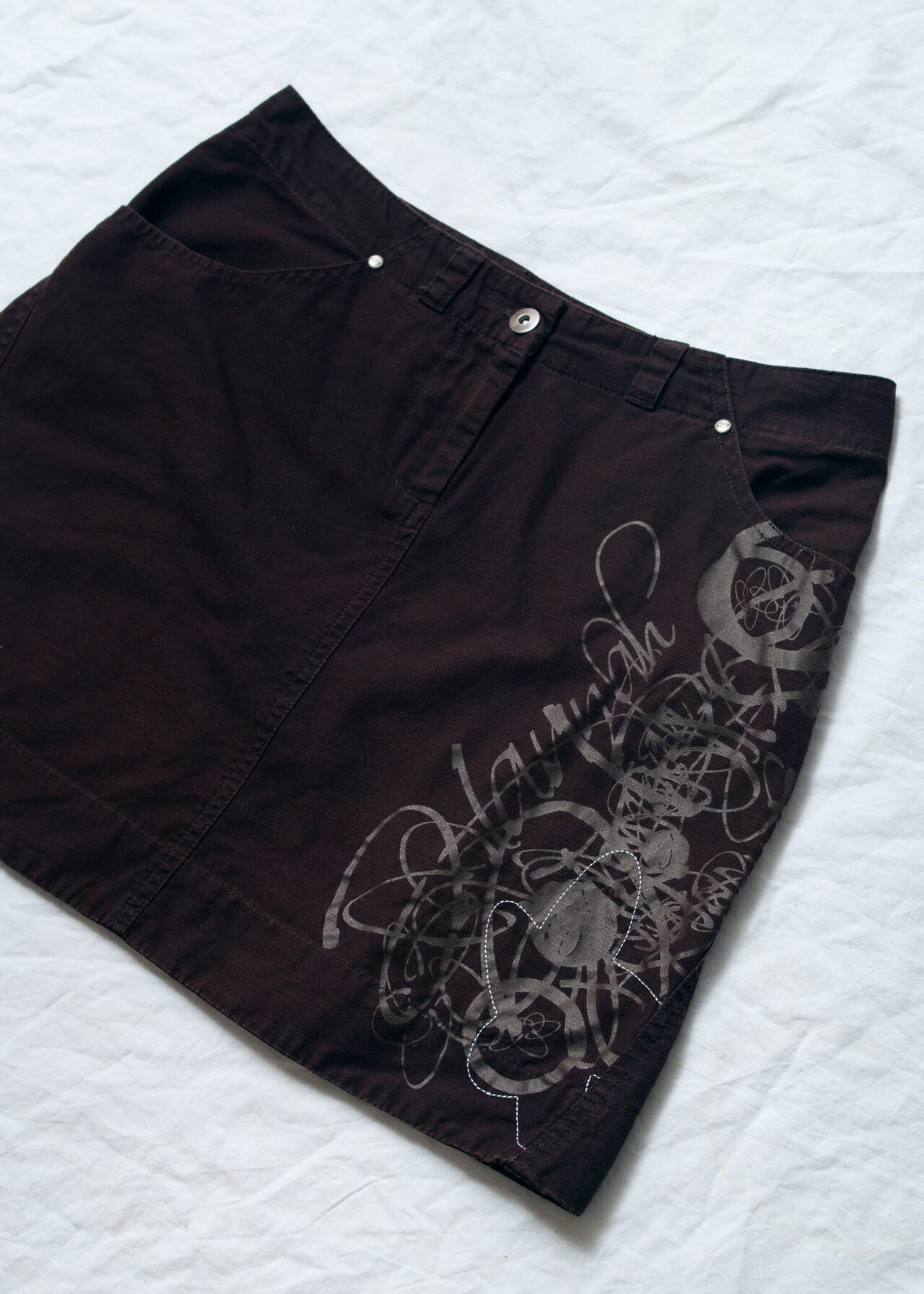 This Y2K vintage skirt is the ultimate throwback to the era of low-rise jeans and grunge, perfect for unleashing your inner whimsigoth with its tattoo print and brown cotton goodness.