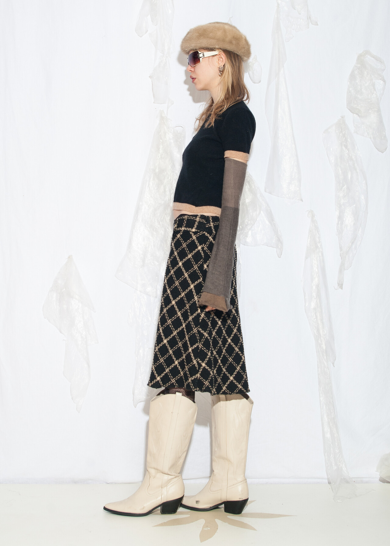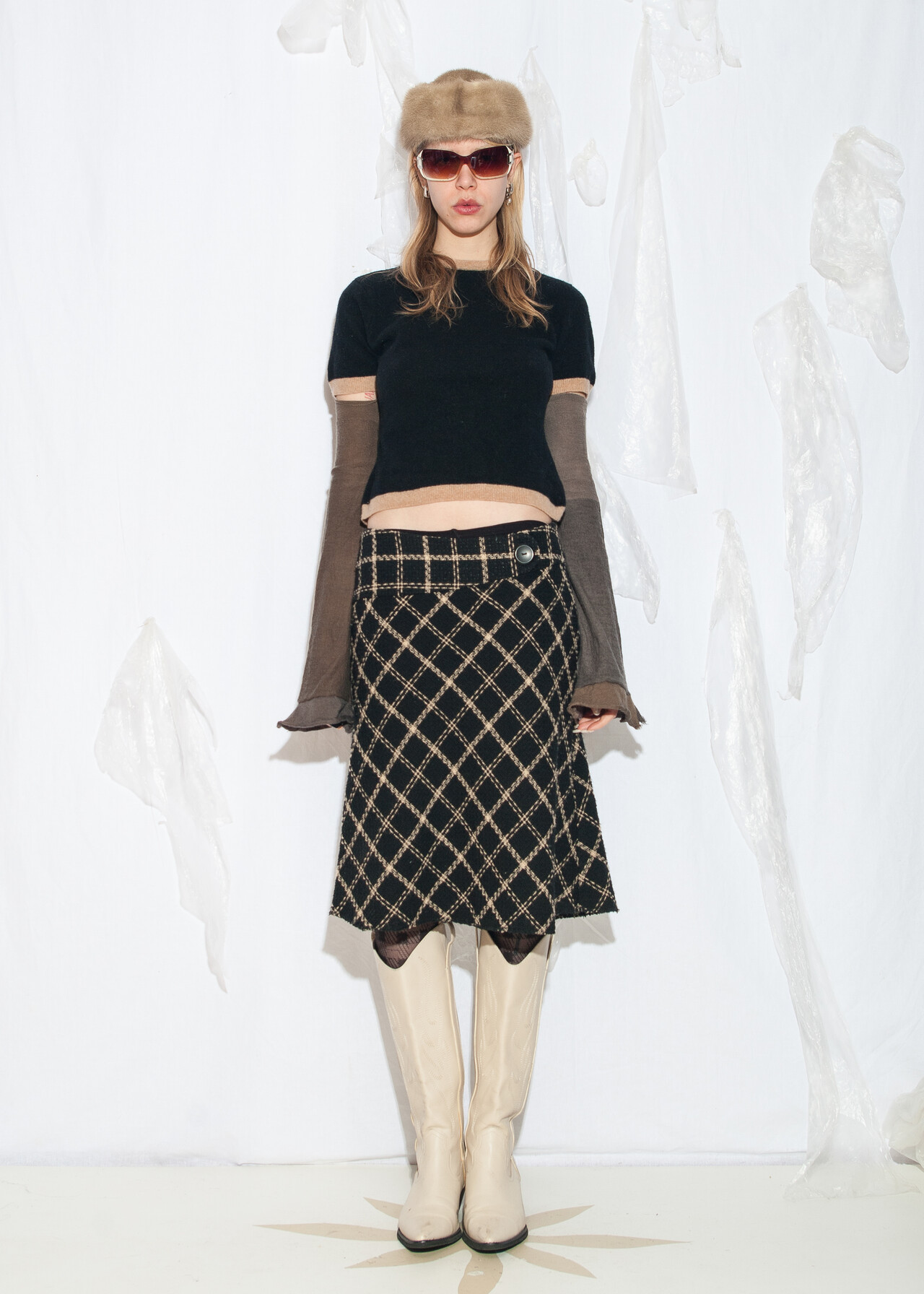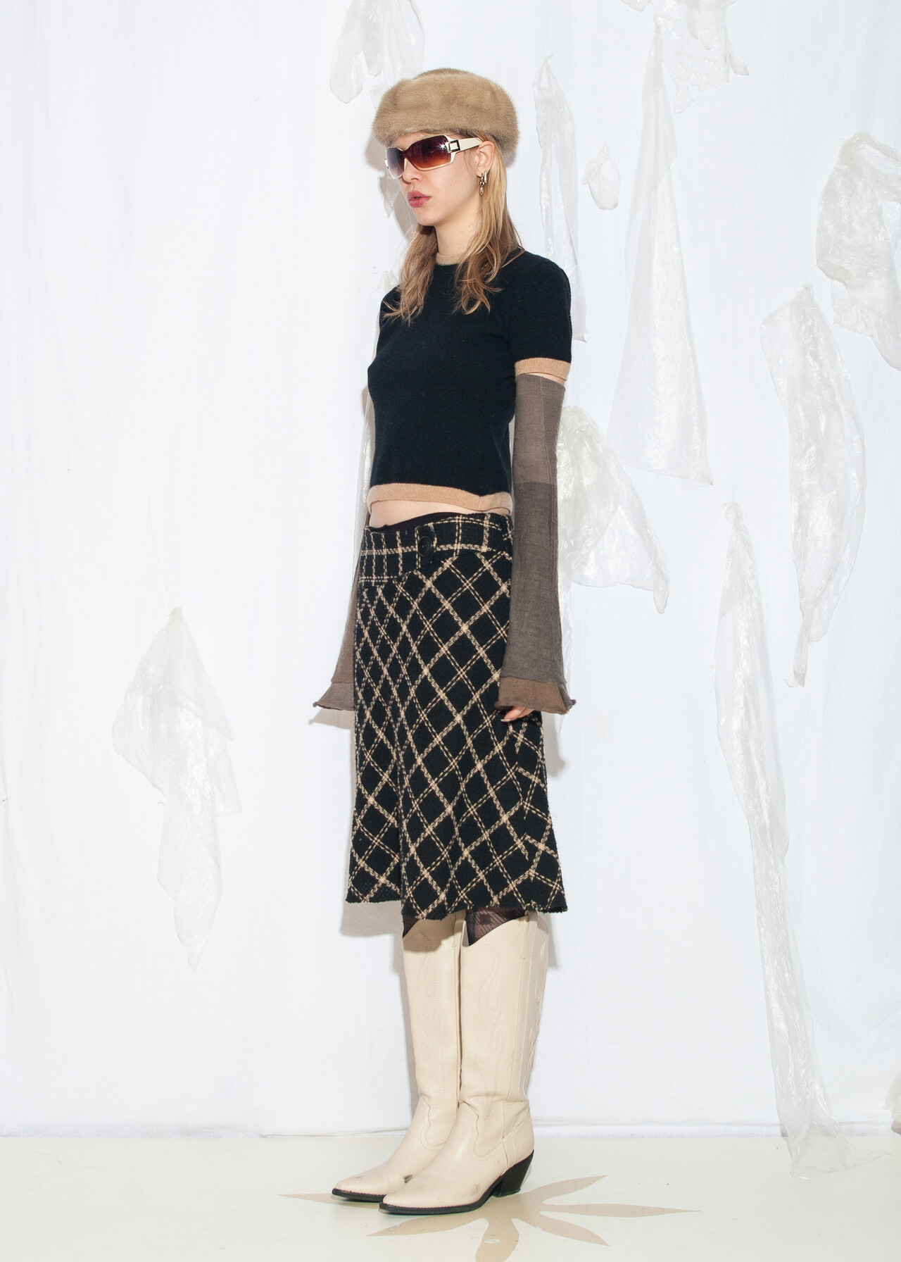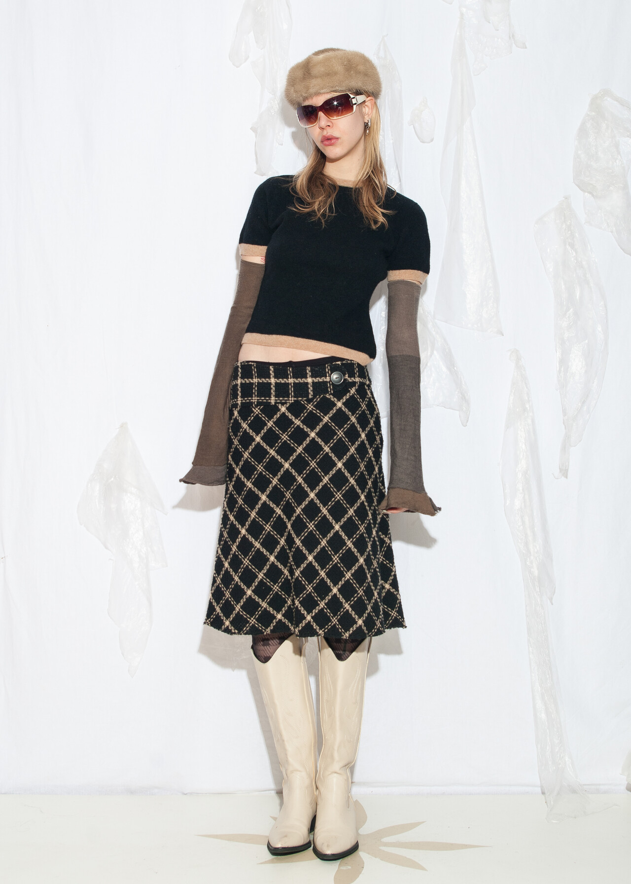 Tags: 2000s style fashion, checked skirt, dark preppy, European vintage, grunge outfit, low rise waist, office siren, plaid midi skirt, preppy goth style, y2k vintage clothing