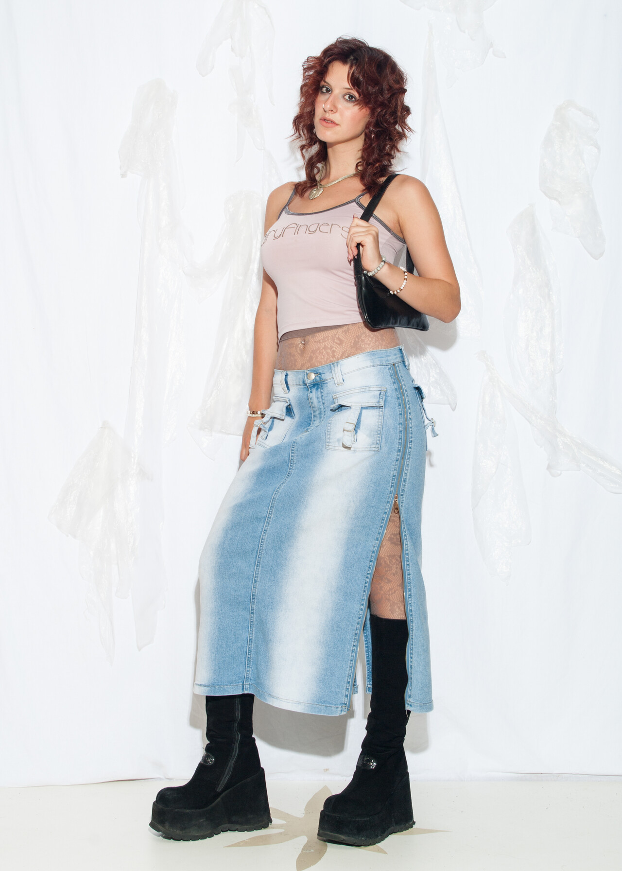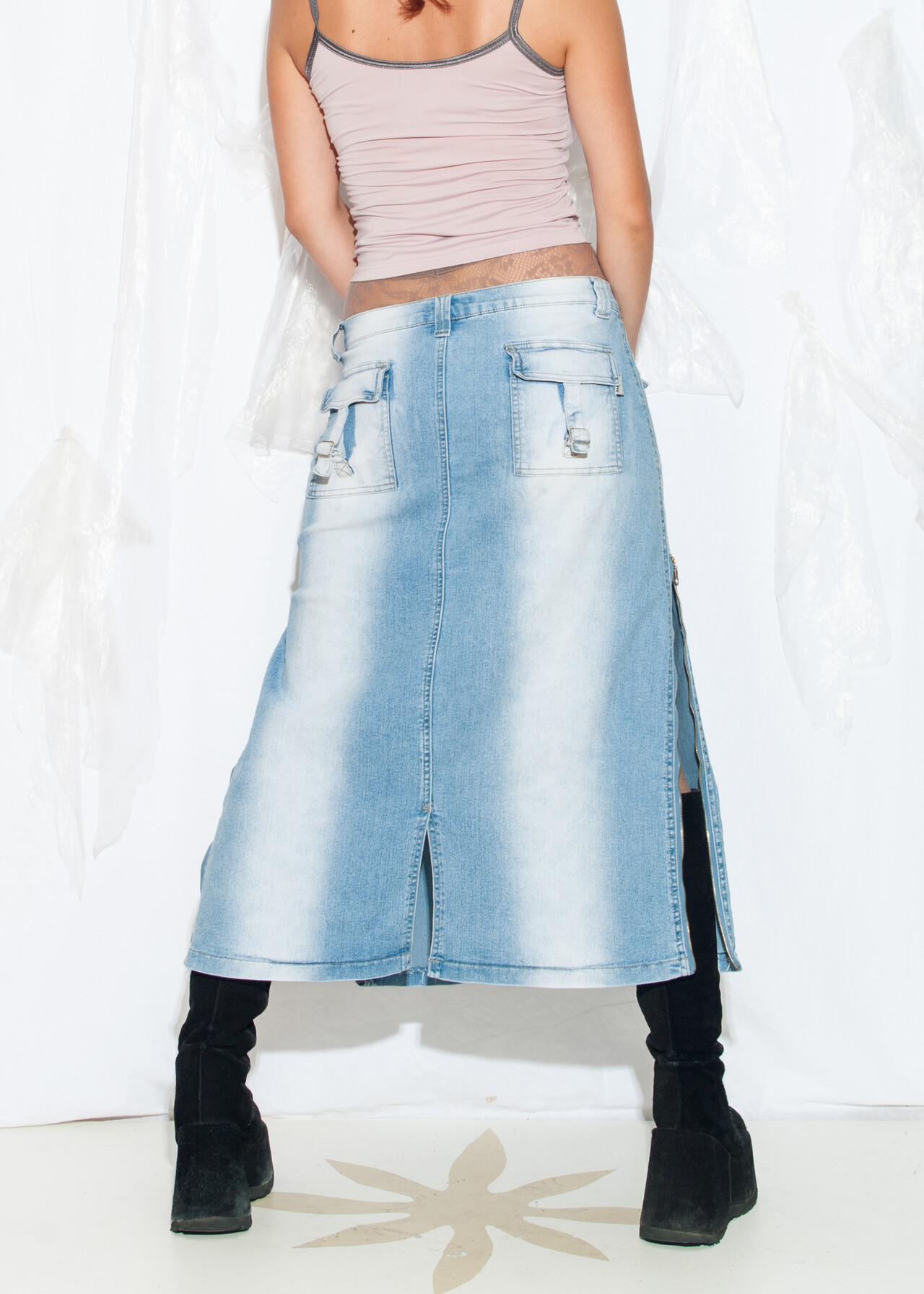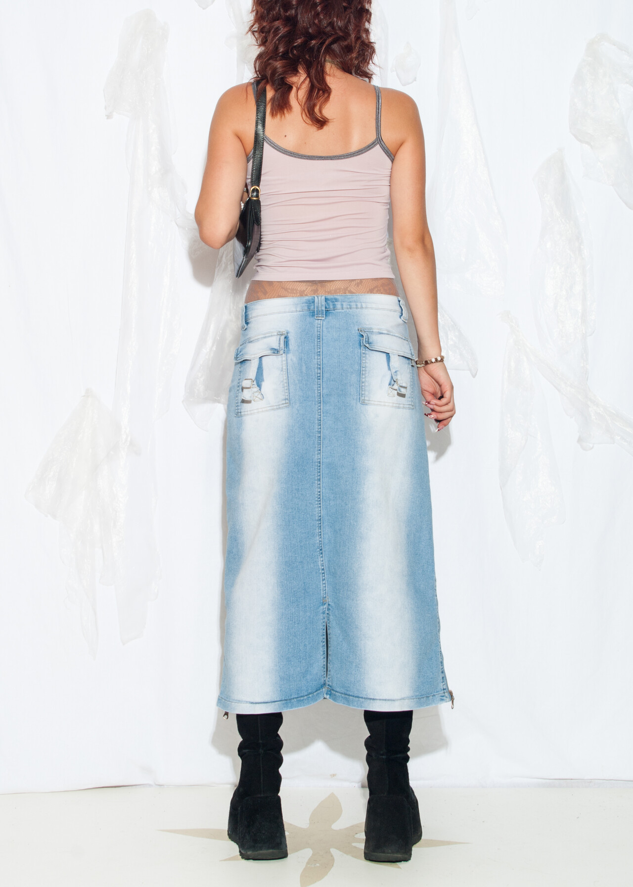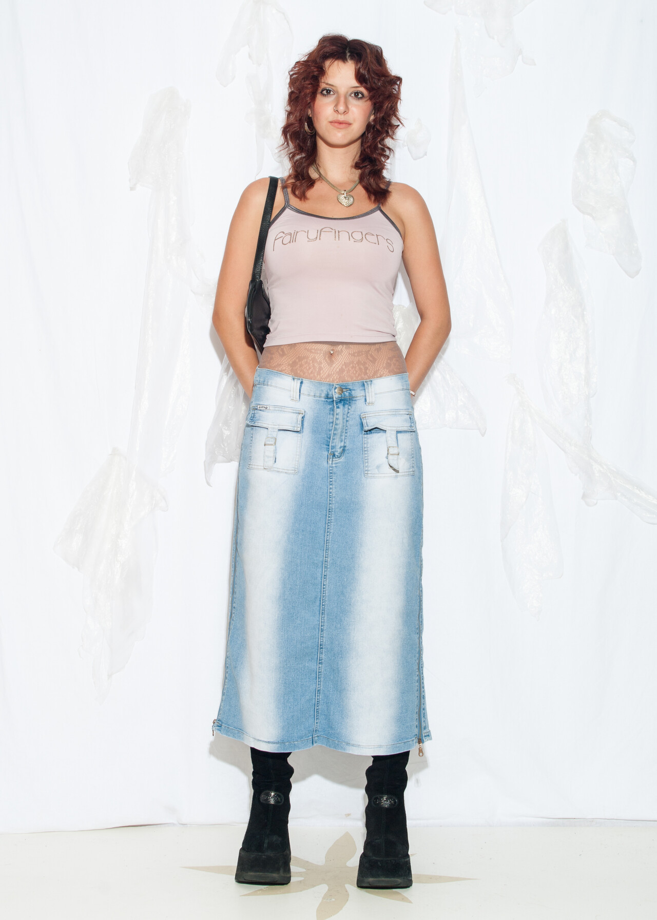 Tags: 2000s style clothing, denim maxi skirt, low rise waist, Paris Hilton, stonewashed denim, y2k grunge outfit, y2k vintage fashion, zip side slit