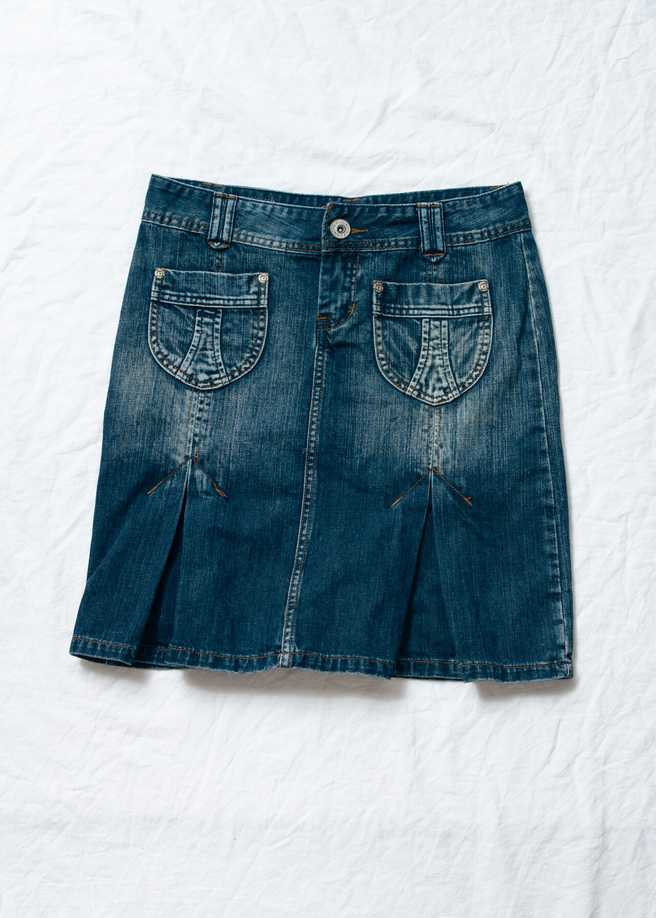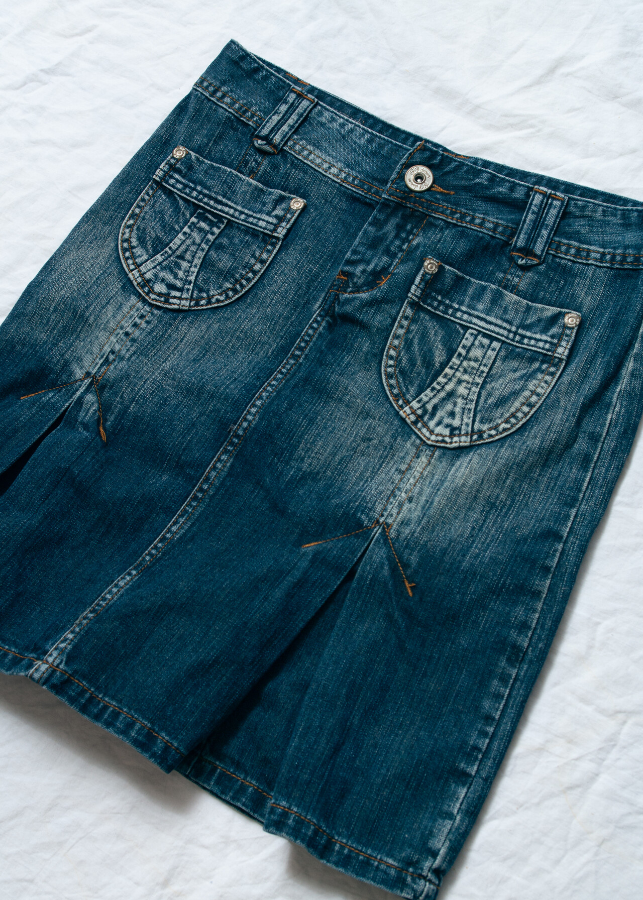Tags: 2000s style clothing, denim midi skirt, low rise skirt, low waist bottom, pleated skirt, stonewashed jeans, whimsi twee, y2k vintage fashion