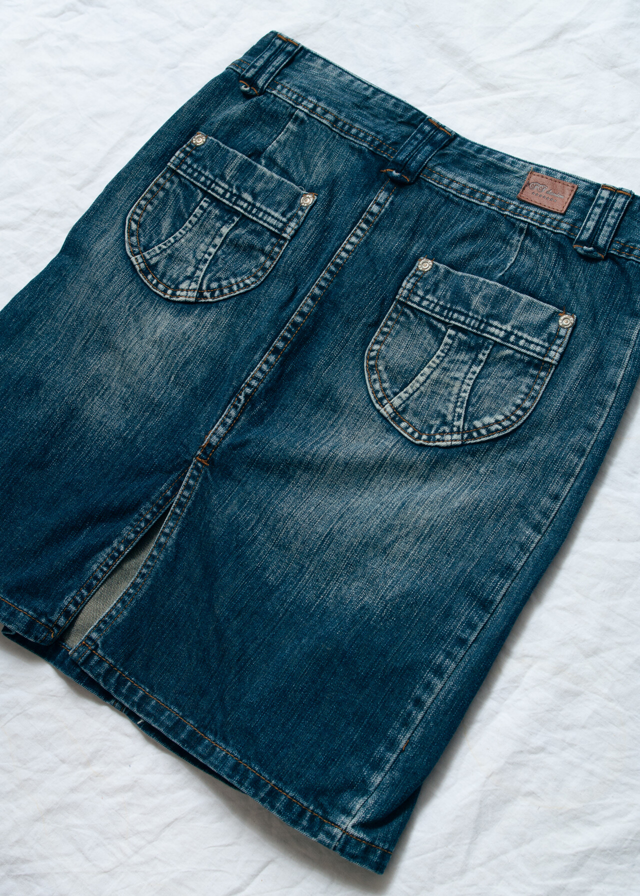 This Y2K vintage denim midi skirt is your ticket to time-travel back when low-rise was life and pleats were the real MVPs of the early 2000s fashion game.