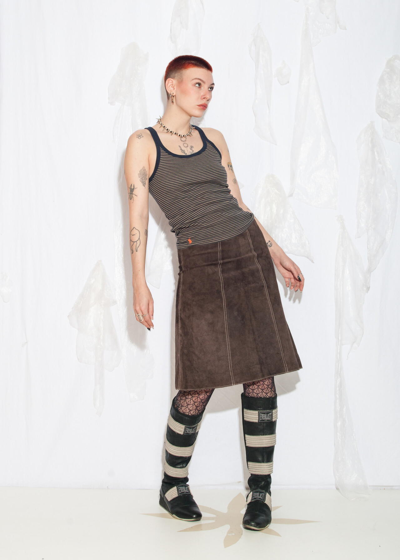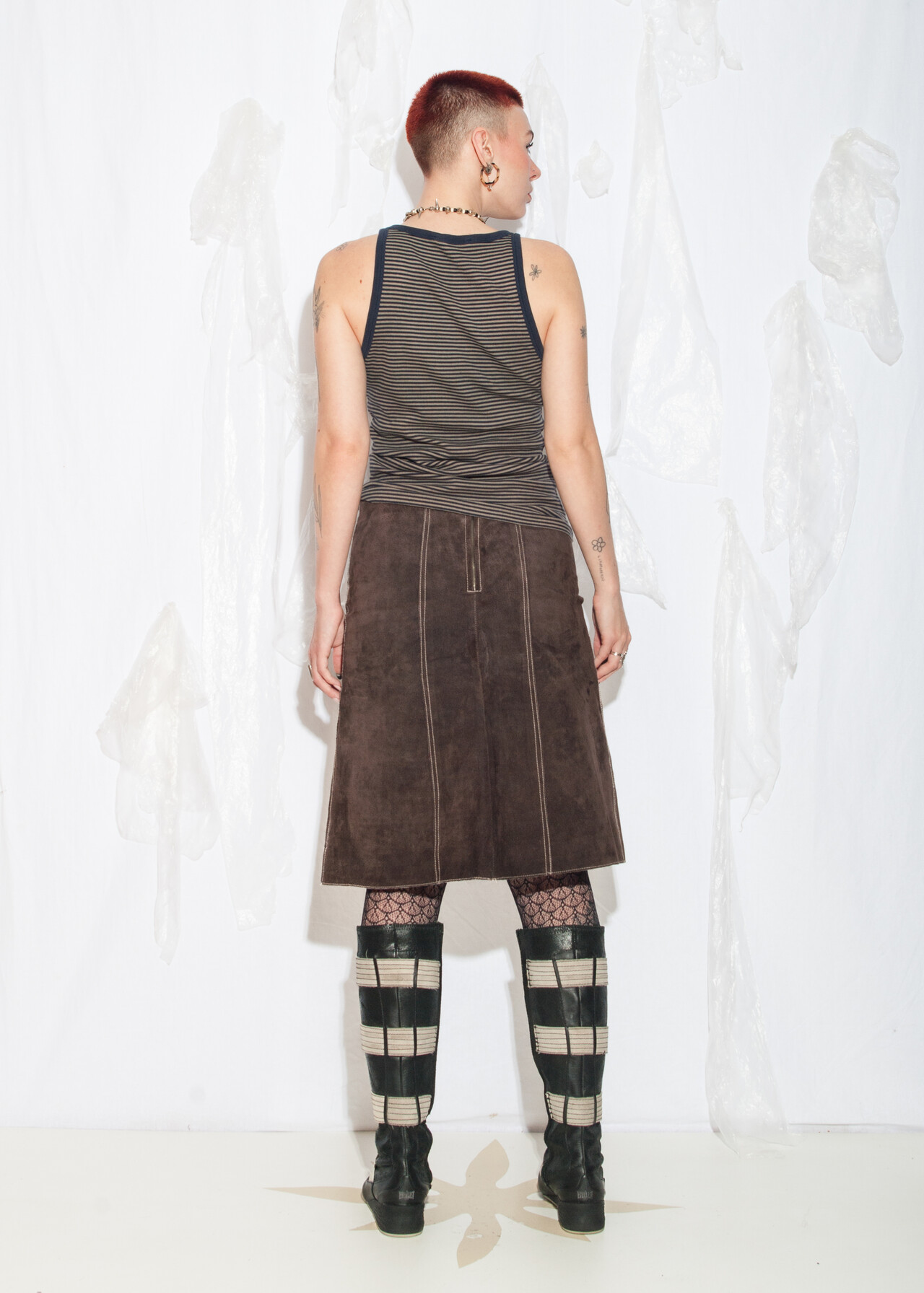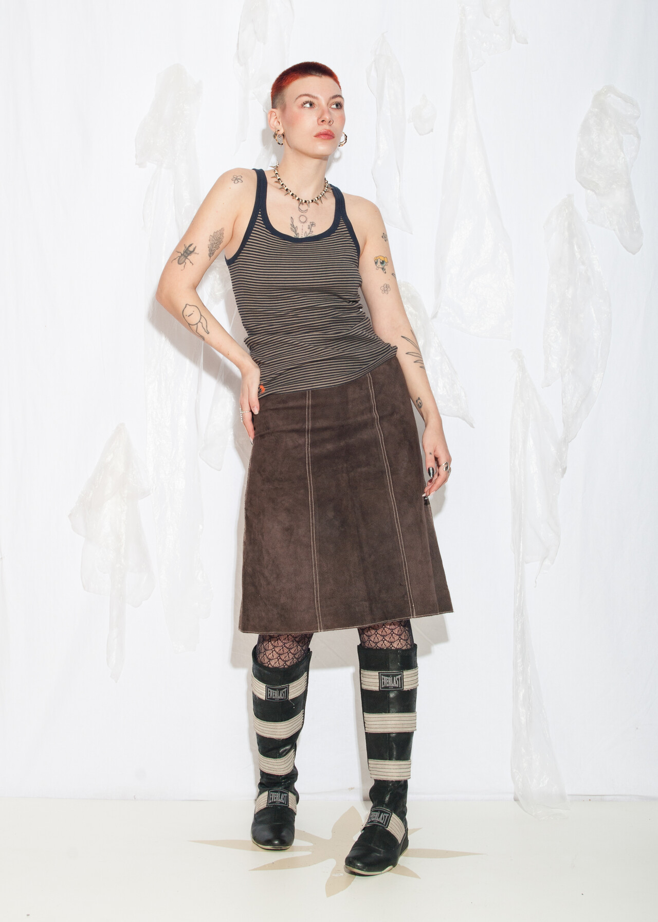 Tags: 00s streetwear, 2000s style clothing, brown midi skirt, low waisted bottom, minimalist, real leather skirt, suede skirt, whimsigoth, y2k grunge outfit, y2k vintage fashion