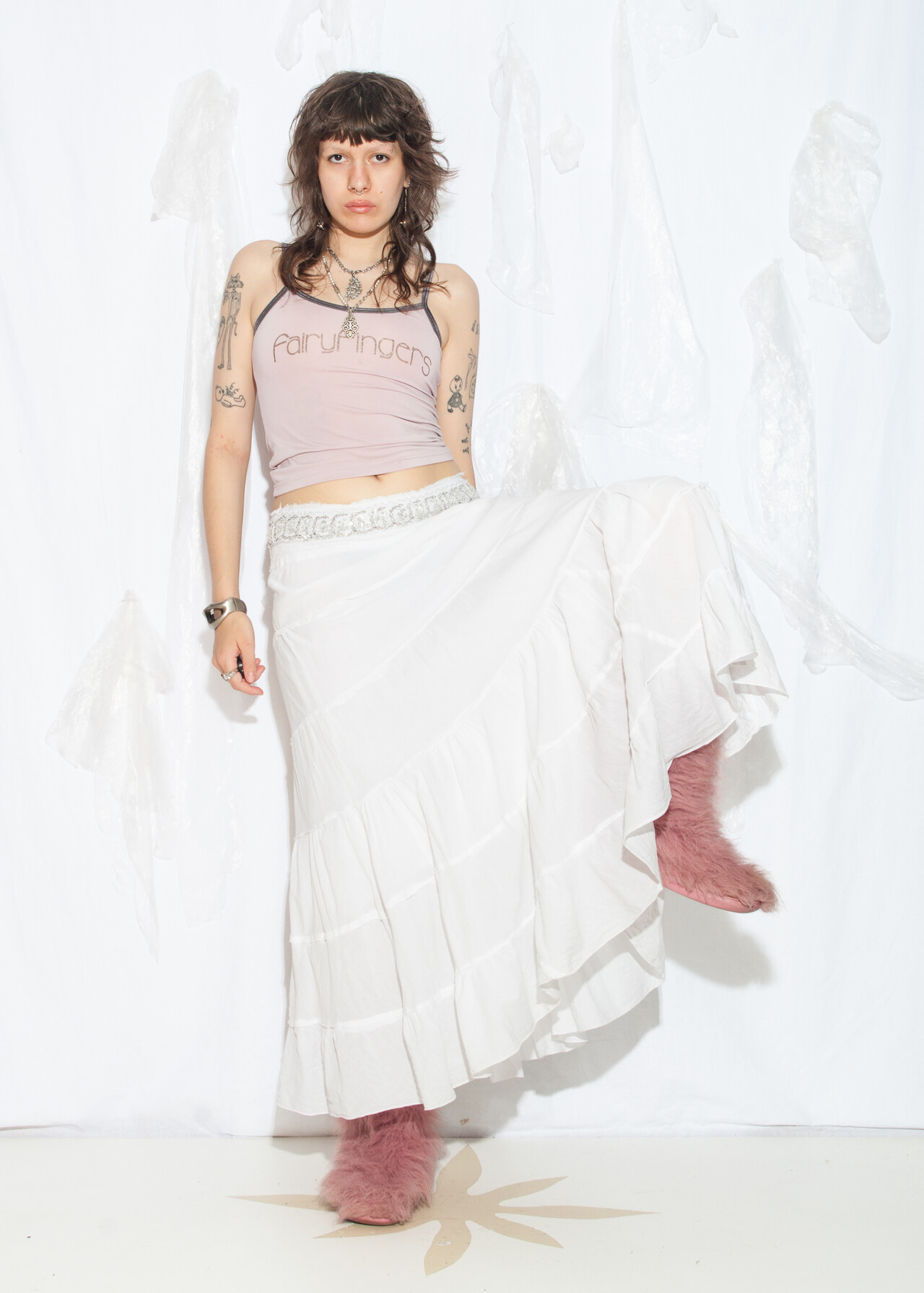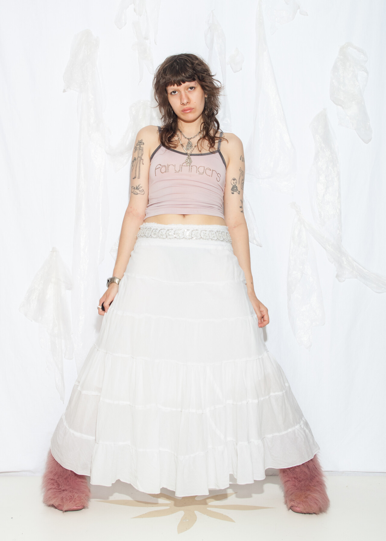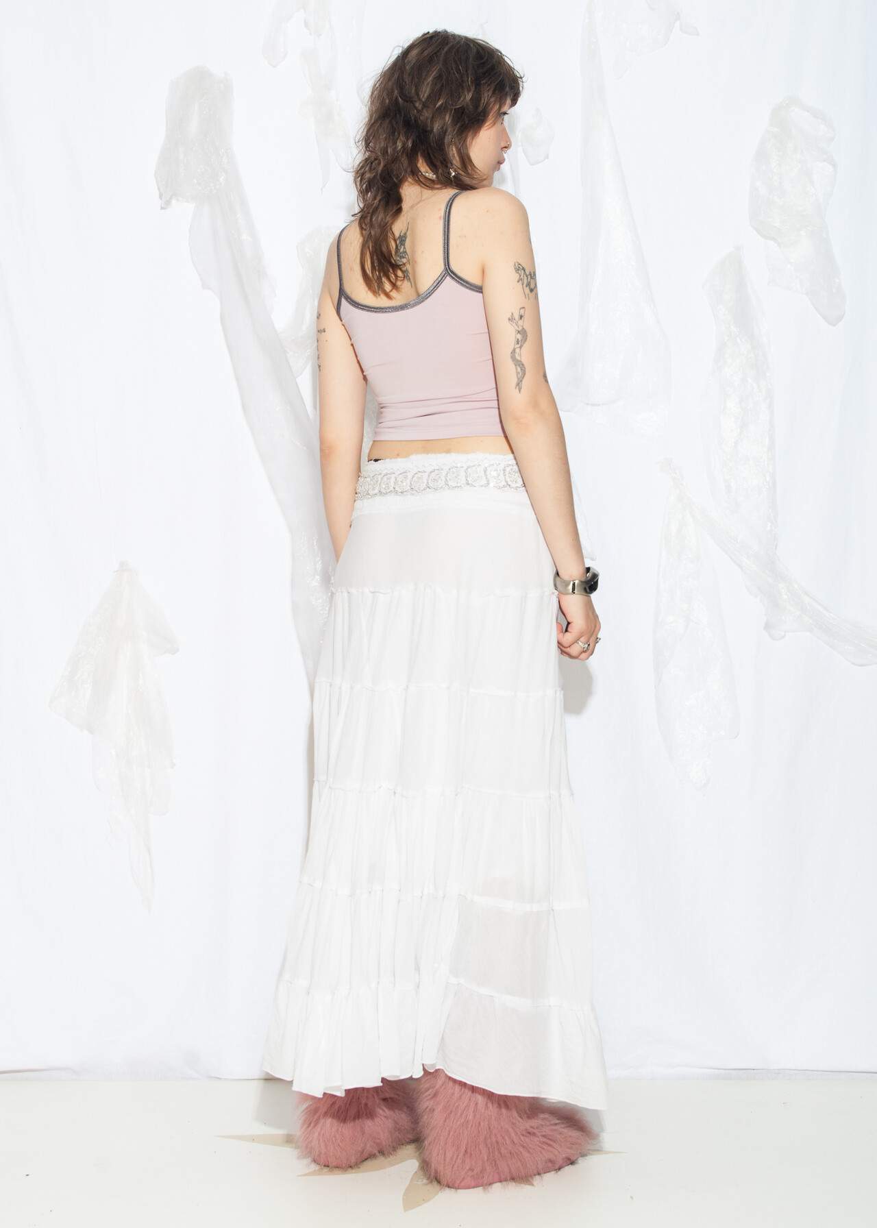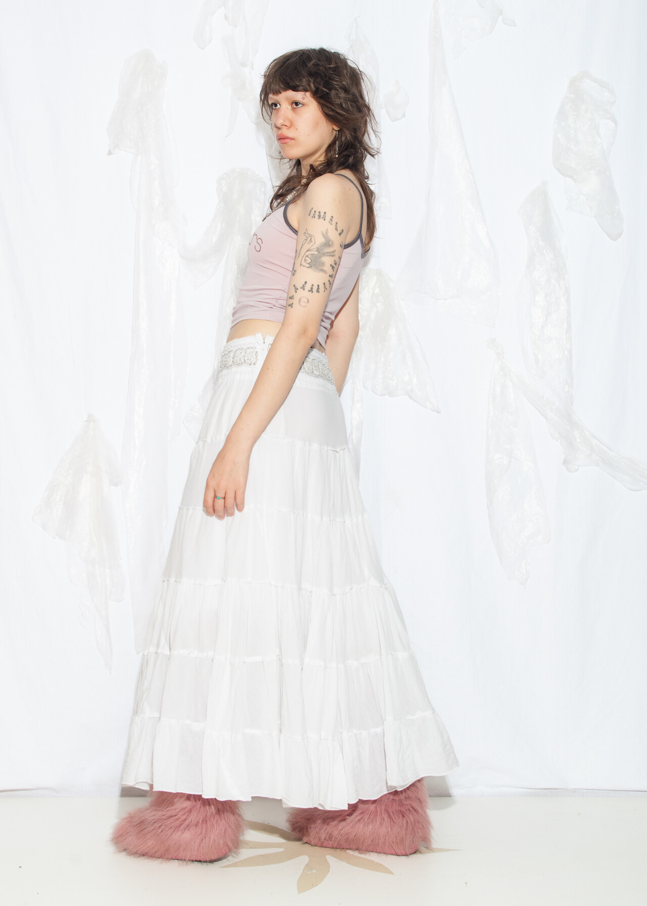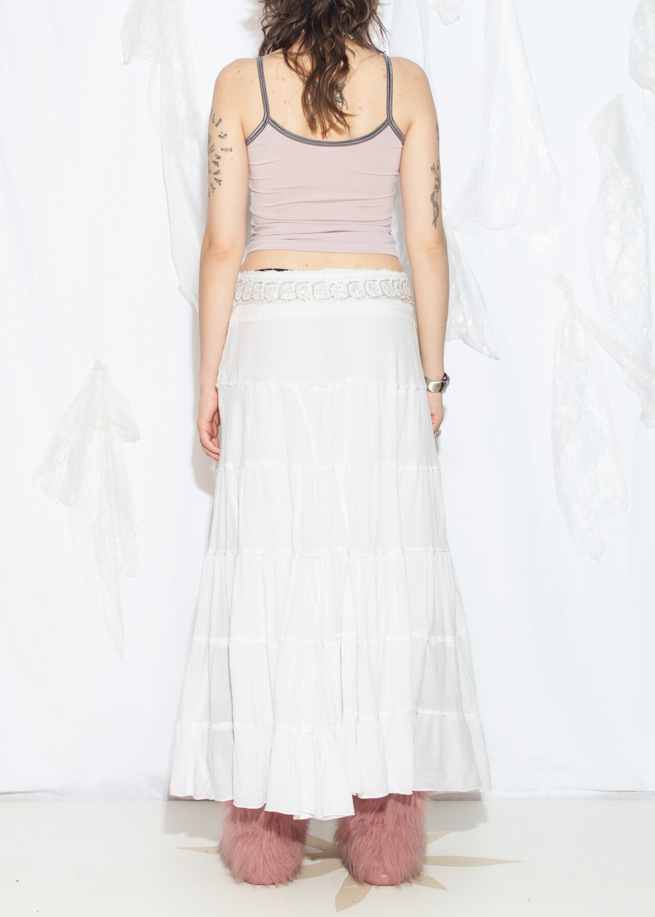 Tags: 2000s style clothing, fairycore grunge, low rise waist, tiered maxi skirt, white cotton skirt, y2k grunge outfit, y2k vintage fashion