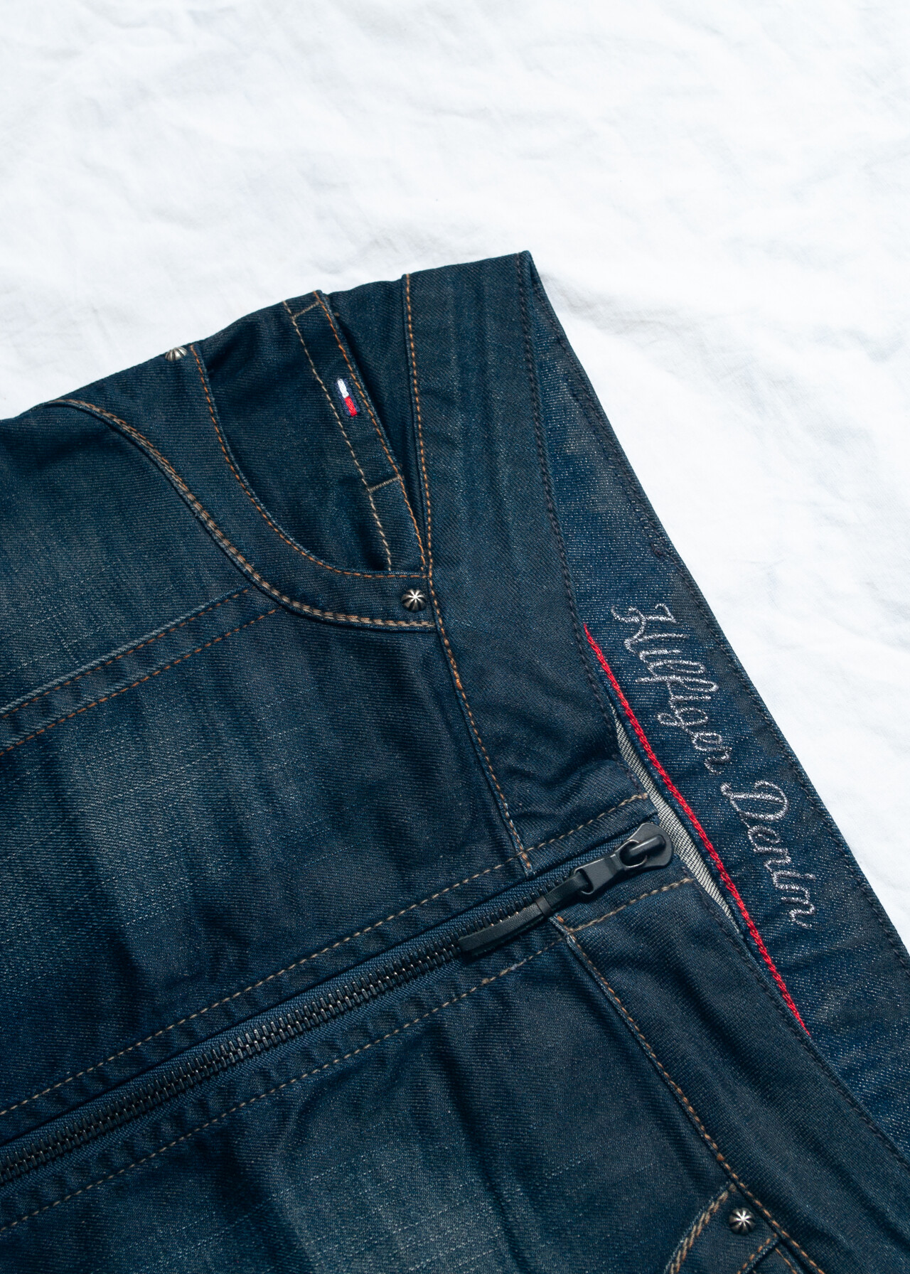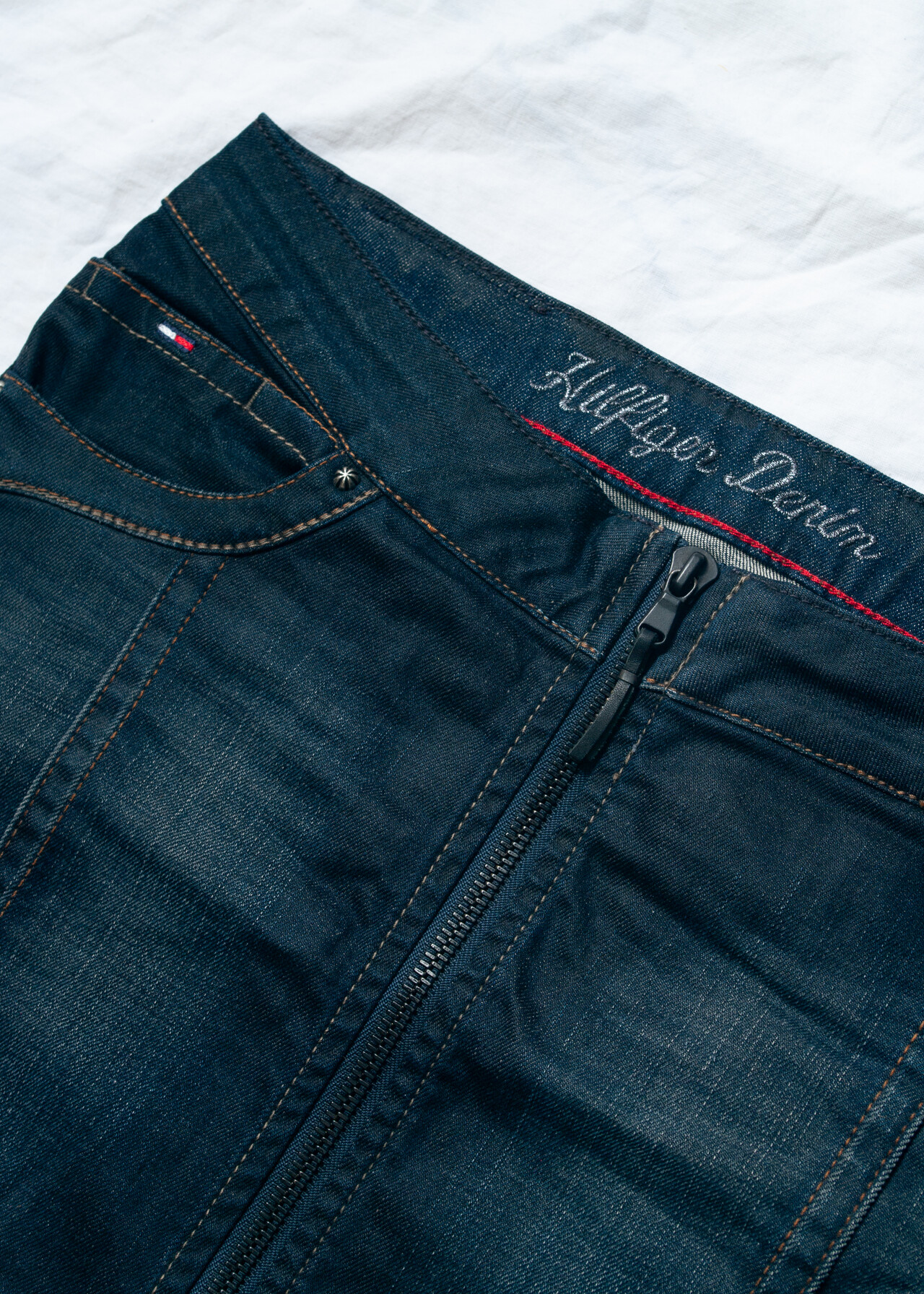 Tags: 2000s style clothing, dark wash denim, denim mini skirt, jean skirt, low waisted bottom, Tommy Hilfiger, y2k grunge outfit, y2k vintage fashion, zip front skirt