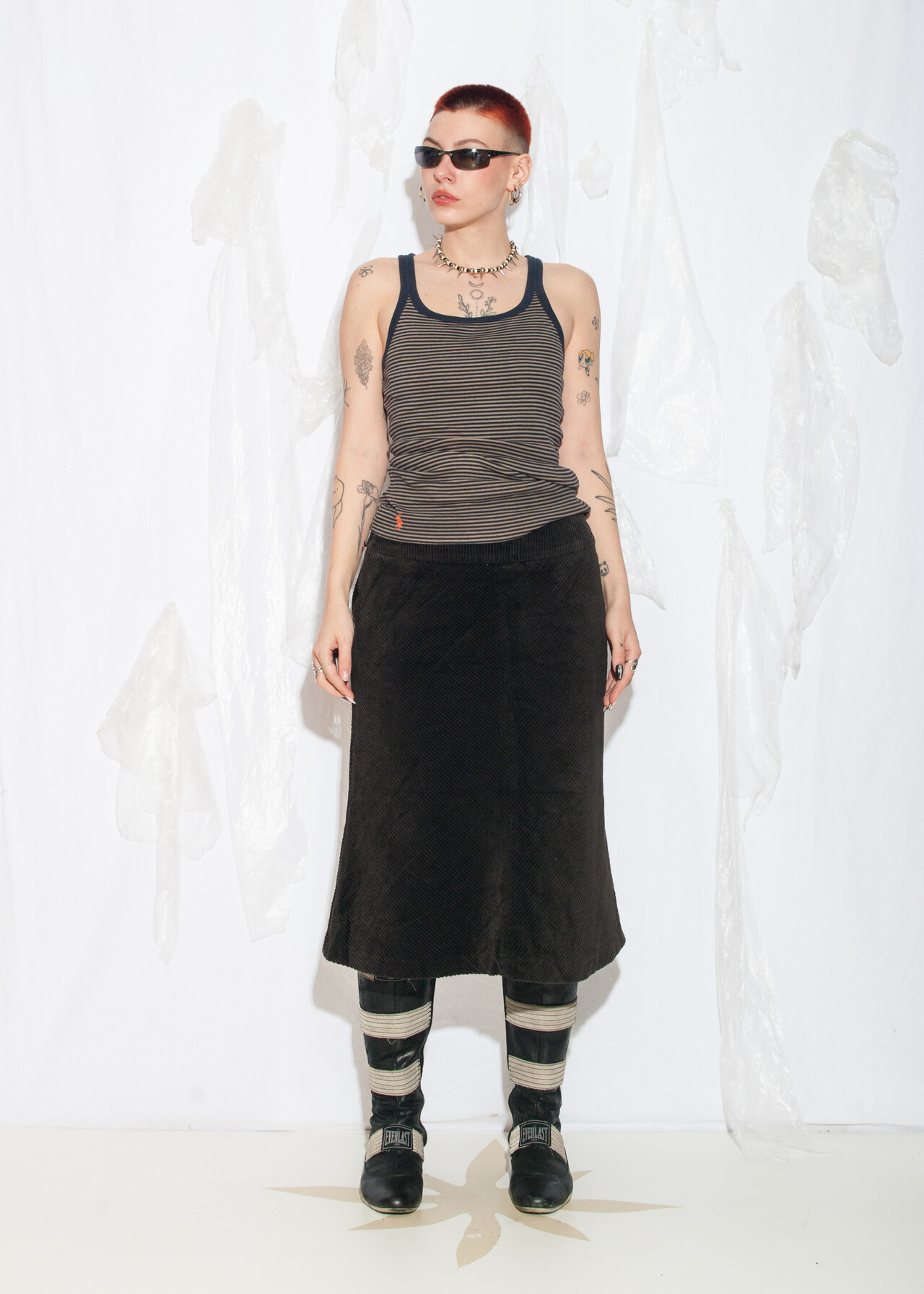 Tags: 2000s style clothing, A line skirt, black velvet midi, cotton corduroy, low rise bottoms, low waisted skirt, ribbed fabric, whimsigoth, y2k vintage fashion