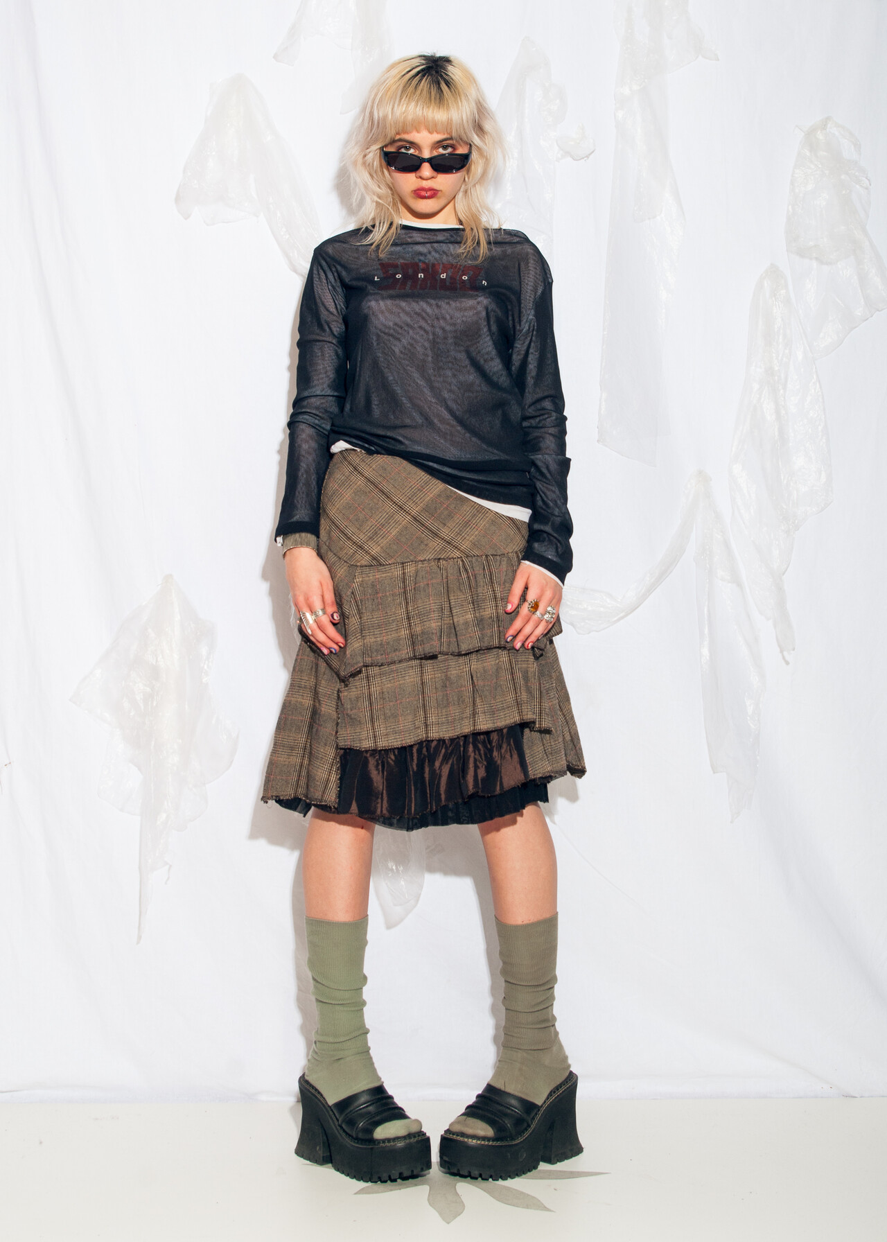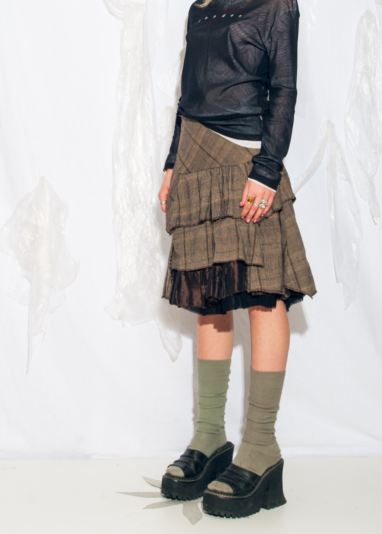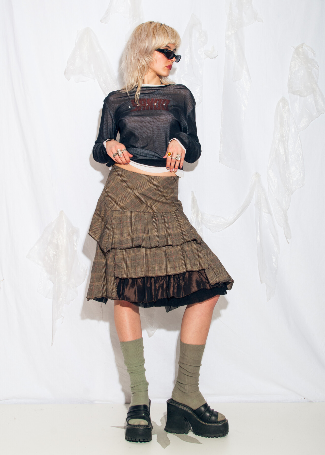 Tags: 2000s style fashion, dark coquette, frilly skirt, low rise midi skirt, low waist bottoms, made in Italy, plaid wool, vintage clothing, whimsigoth, y2k grunge