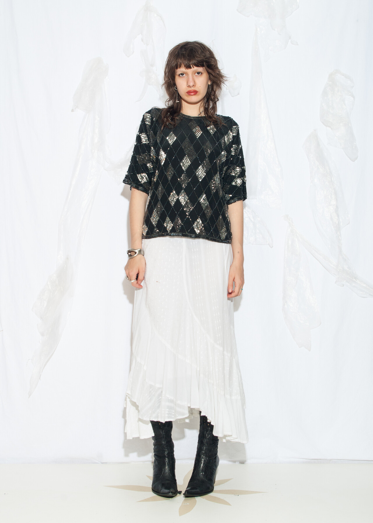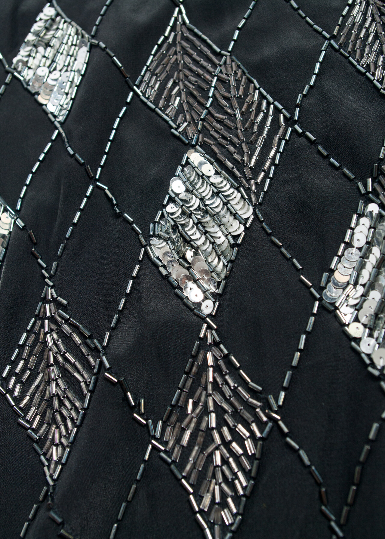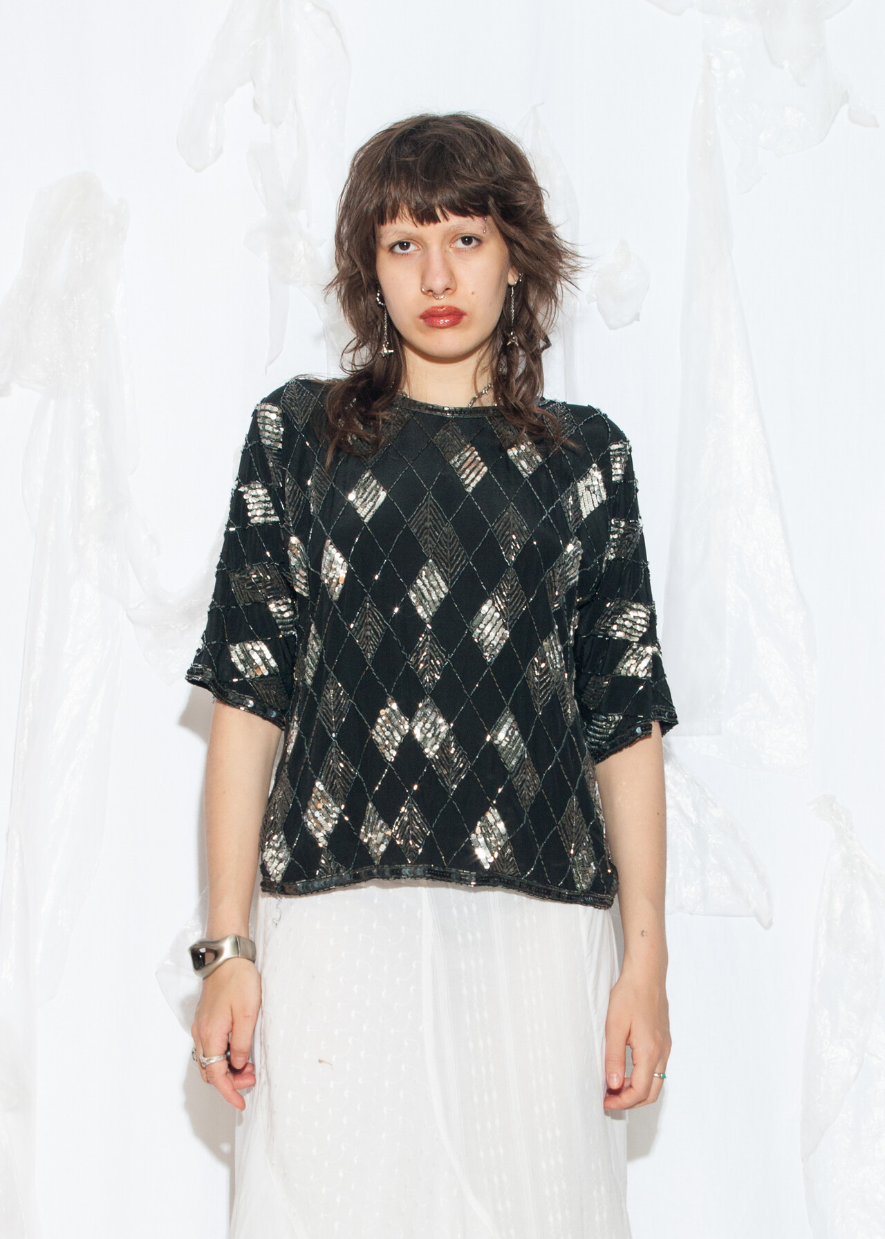 Tags: 80s vintage fashion, diamond pattern, glass bead adorned, occassionwear, party top, pure silk blouse, silver beaded tee