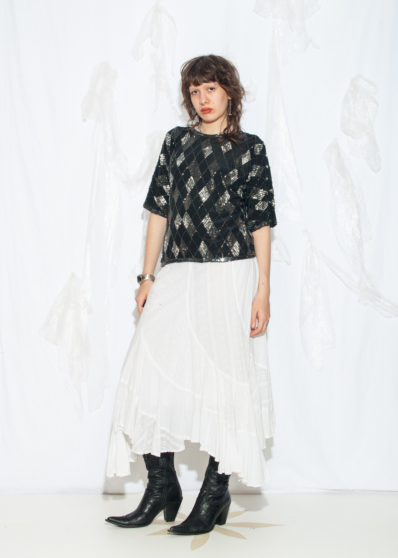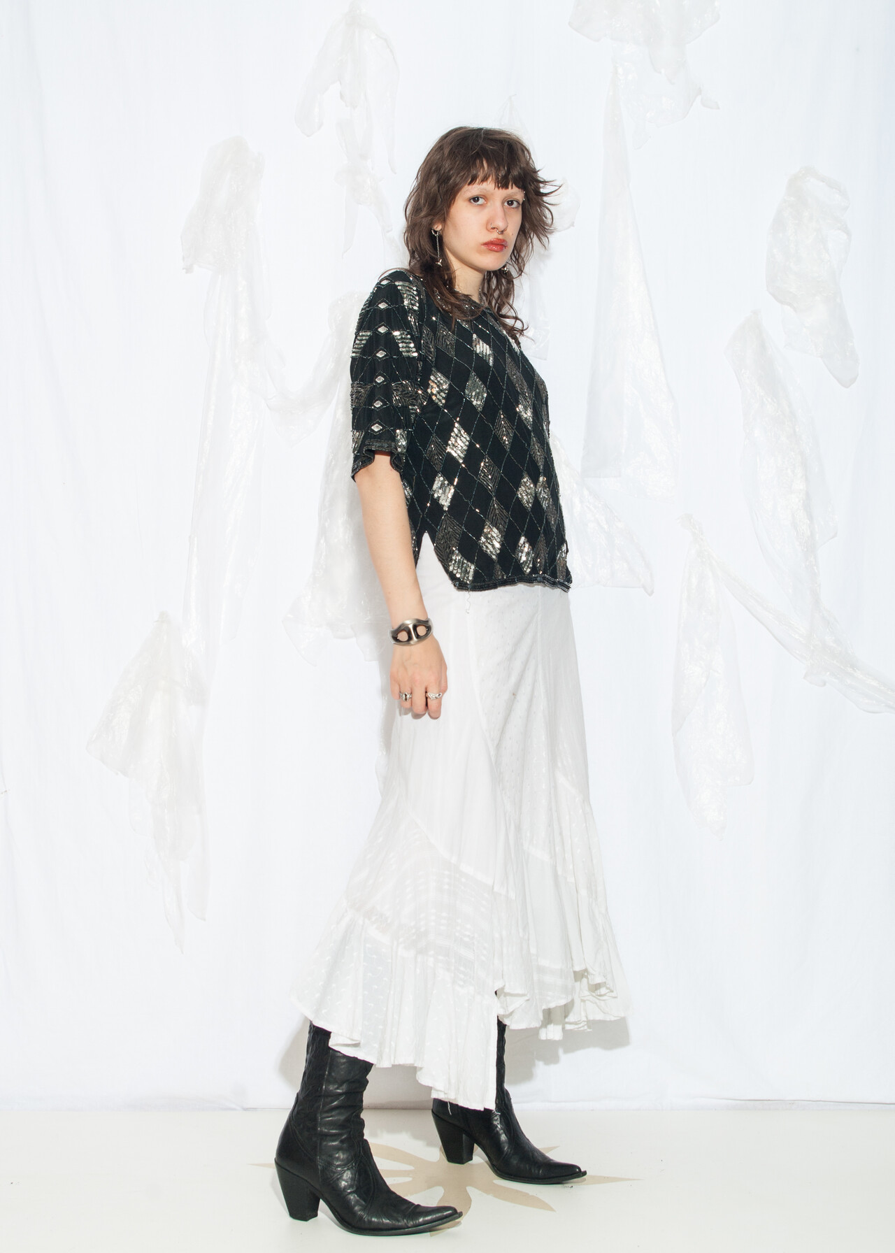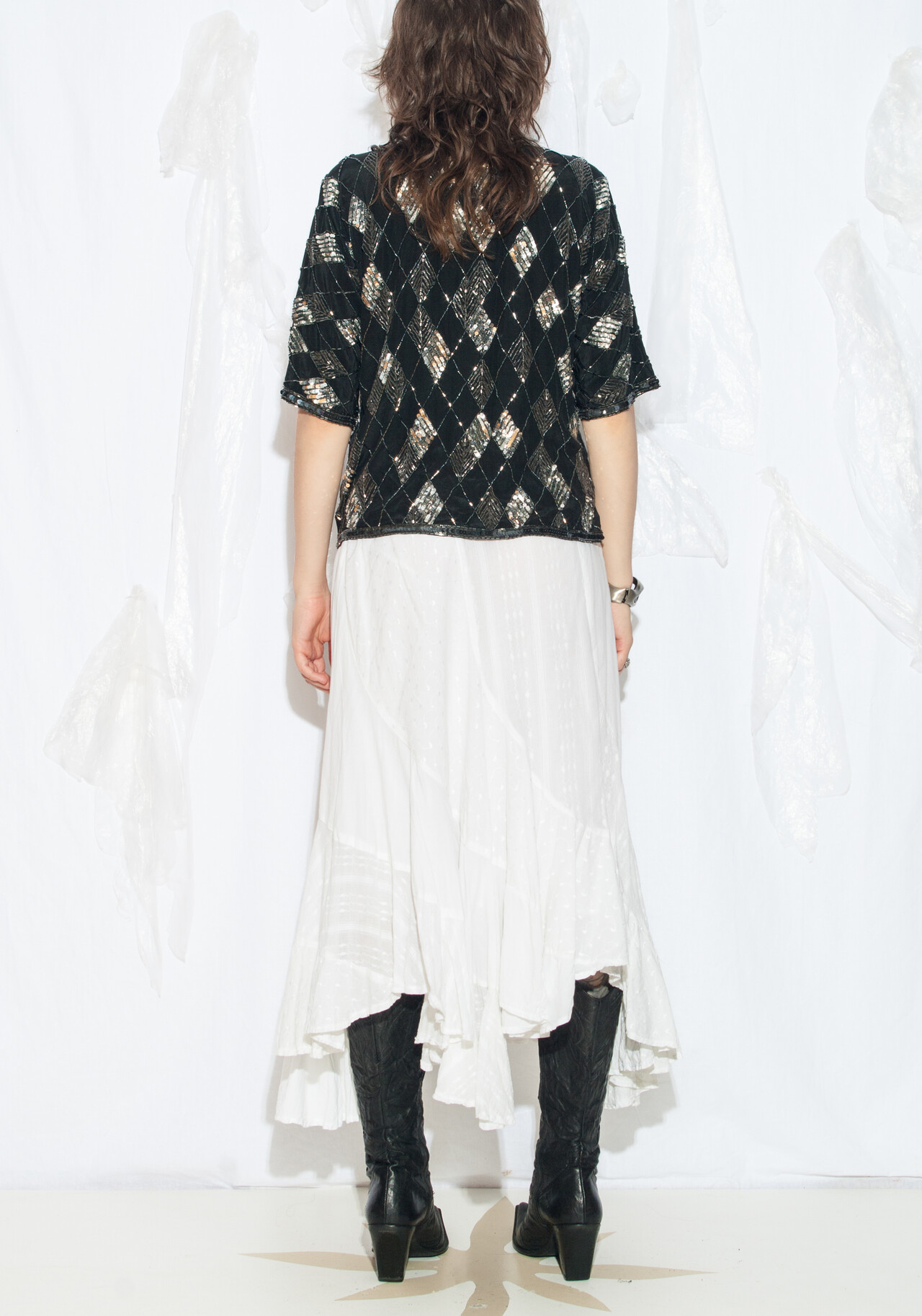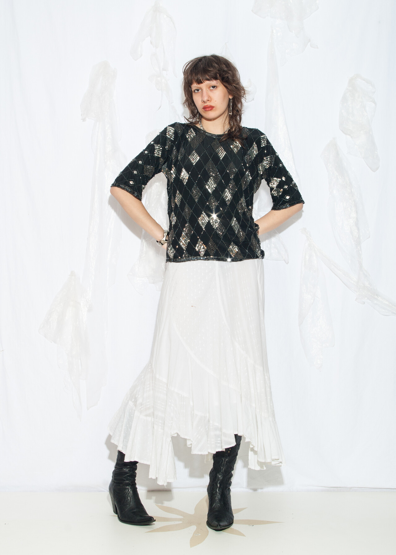 Tags: 80s vintage fashion, diamond pattern, glass bead adorned, occassionwear, party top, pure silk blouse, silver beaded tee
