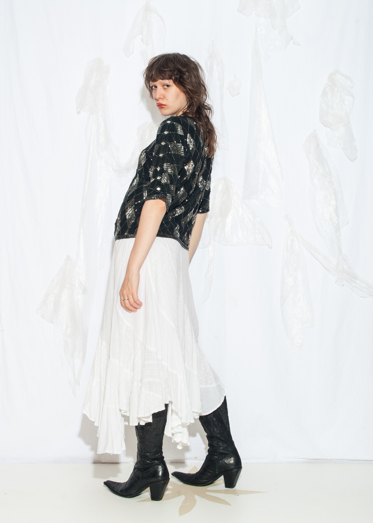 Vintage 80s Silver Beaded Pure Silk Party Top